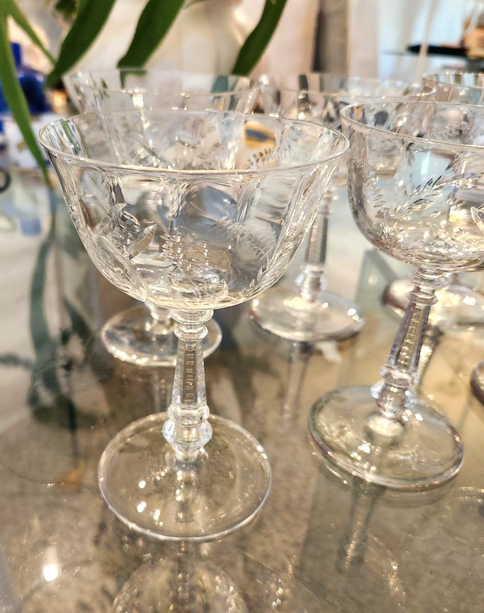 Set of 5 very pretty crystal champagne glasses - yes, I know there are six in the photo. We later discovered one was chipped, so we removed it. Nice and thin - lovely design - vintage. Each 5.5" tall.