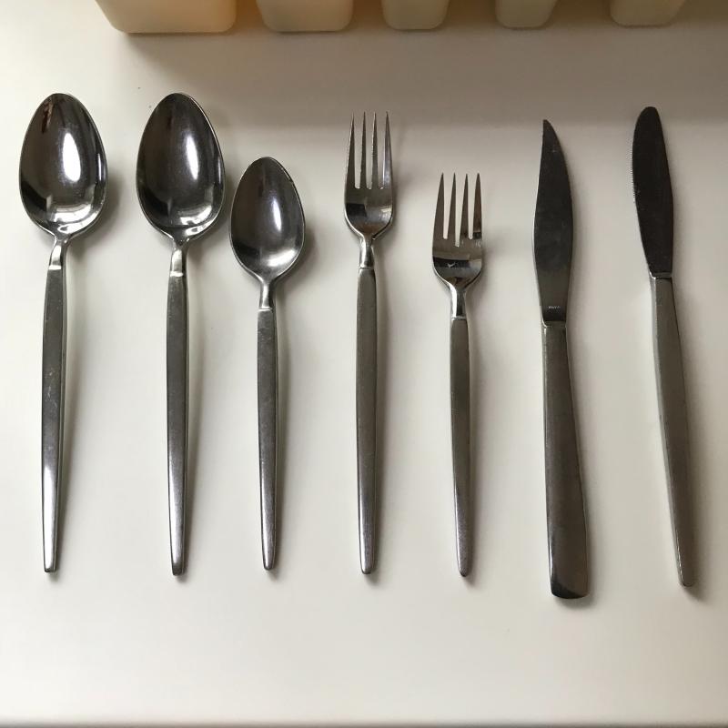 This set of silverware includes 13 large forks, 13 small forks, 15 big spoons, 23 little spoons, and 9 butter knives in two different styles. This lot is available for local pick up in Asheville, NC only.