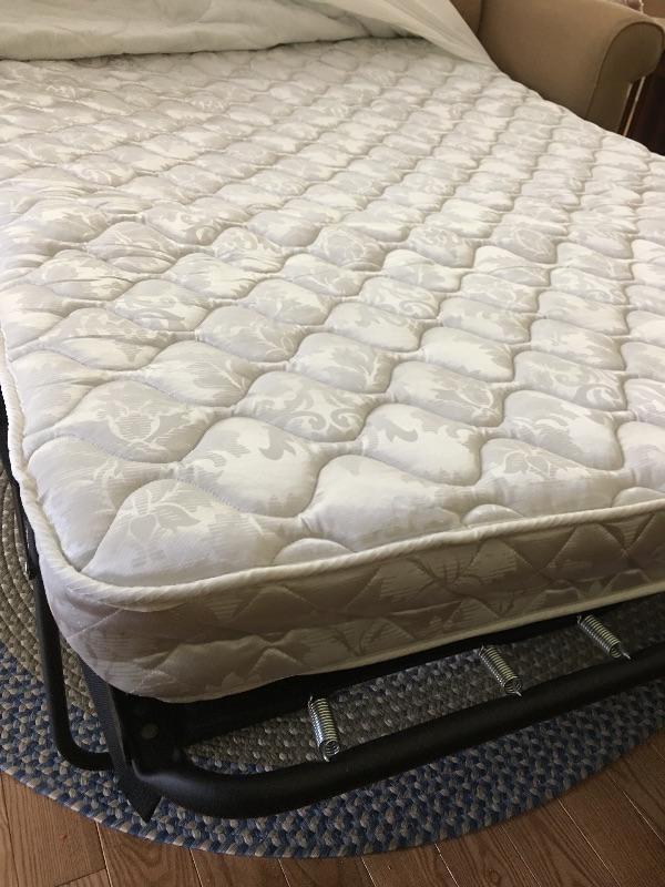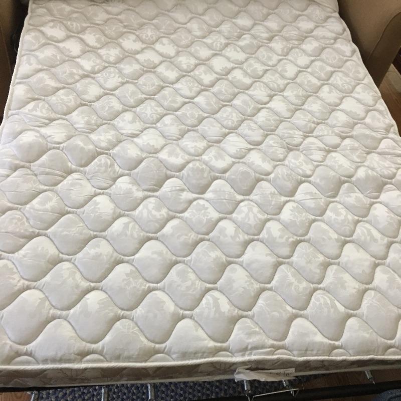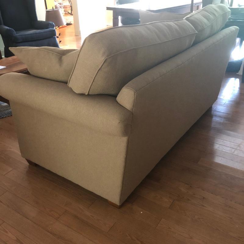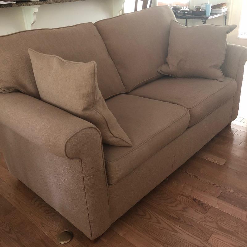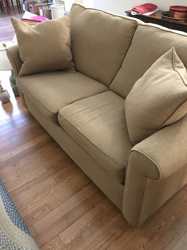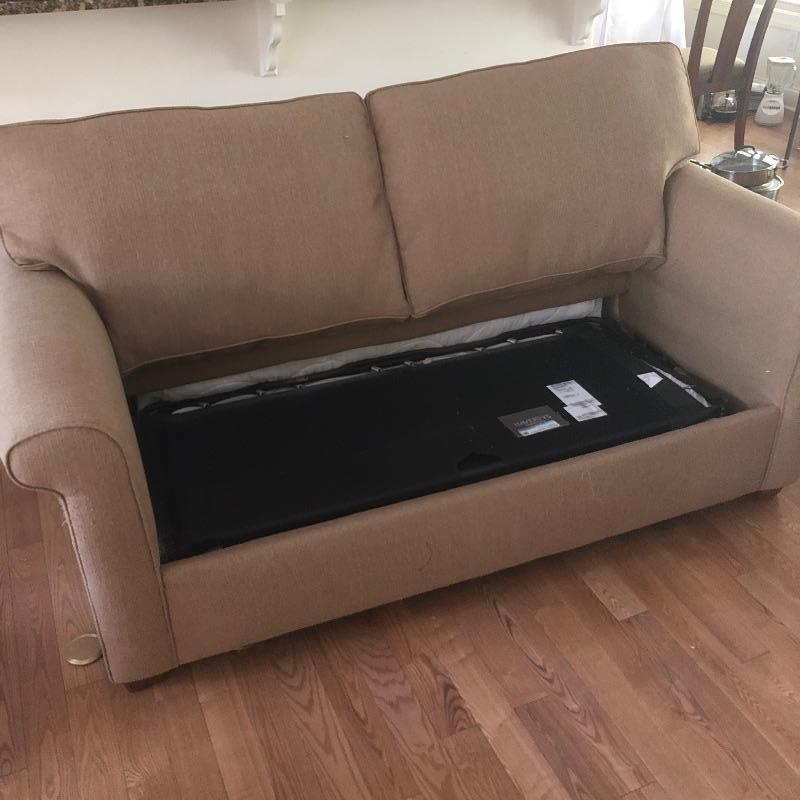 Be prepared for your next house guest with minimal effort. This gorgeous Haverty sofa features a fold out bed for additional sleeping space. It would make a great addition to any living room. The sofa and fold out mattress appear to be in very good condition. The first picture shows what appears to be a reddish stain, it is not it is just a reflection, the last three pictures show the couch with no reflection
