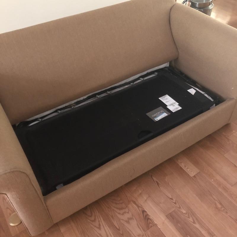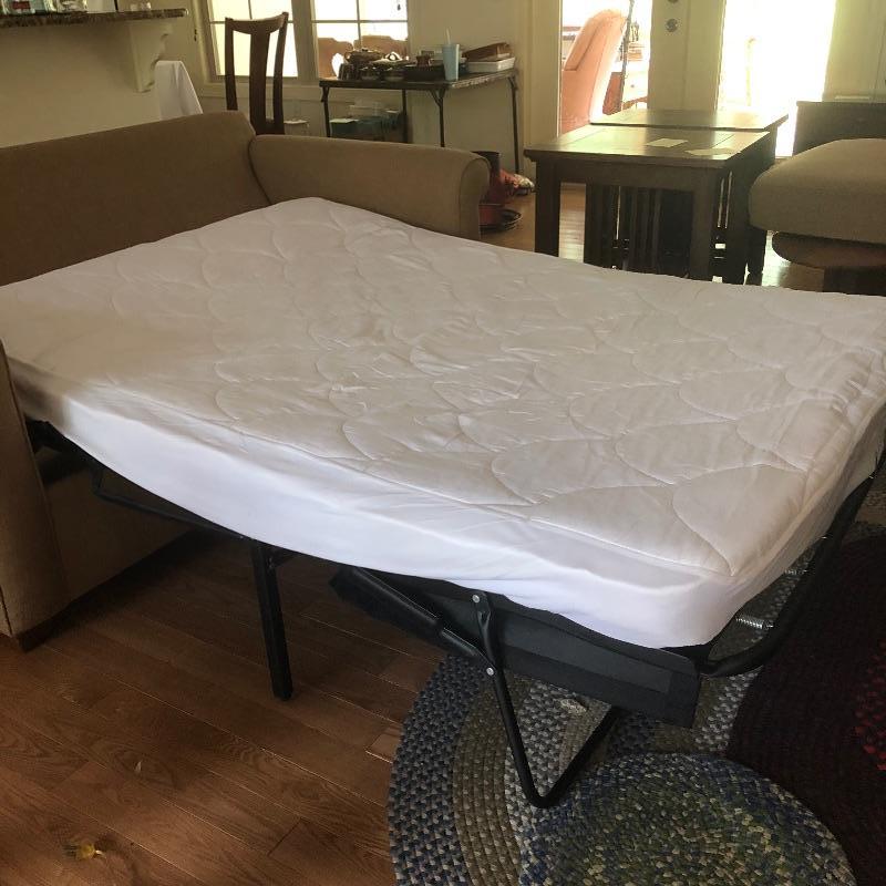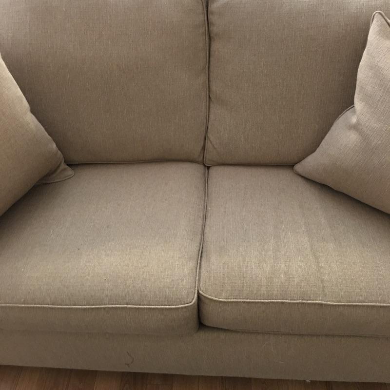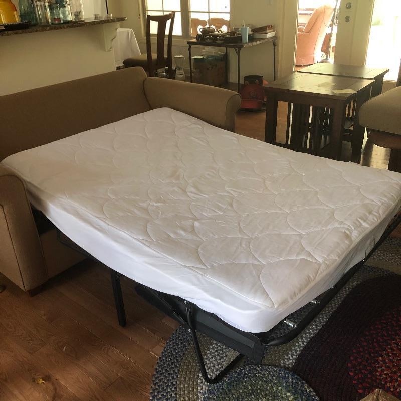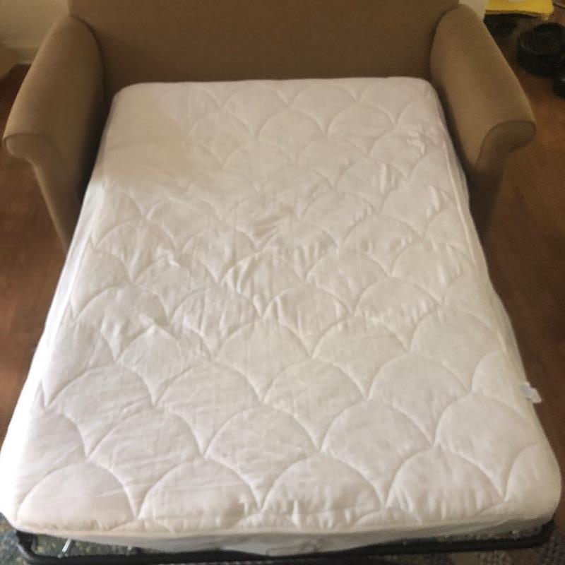 Be prepared for your next house guest with minimal effort. This gorgeous Haverty sofa features a fold out bed for additional sleeping space. It would make a great addition to any living room. The sofa and fold out mattress appear to be in very good condition. The first picture shows what appears to be a reddish stain, it is not it is just a reflection, the last three pictures show the couch with no reflection