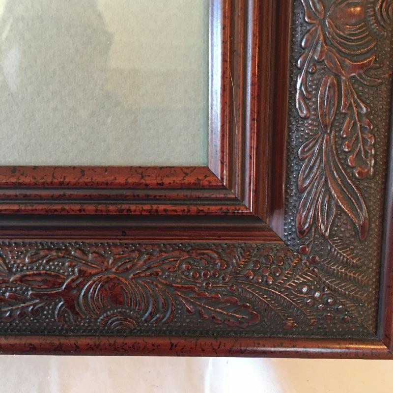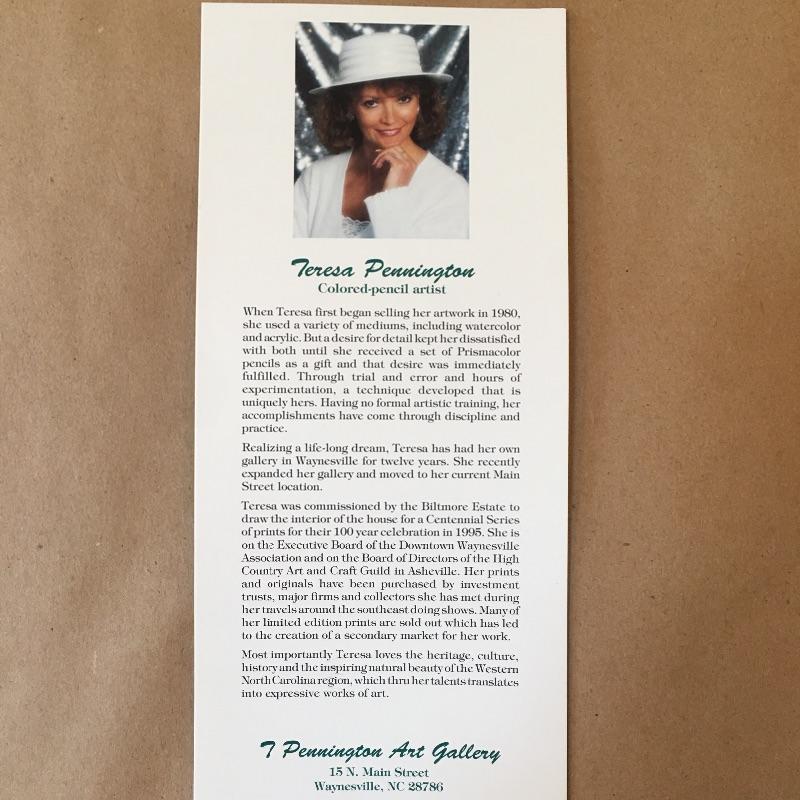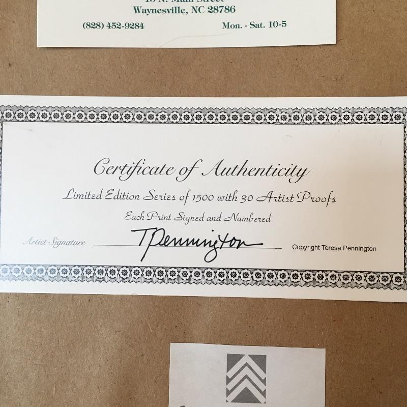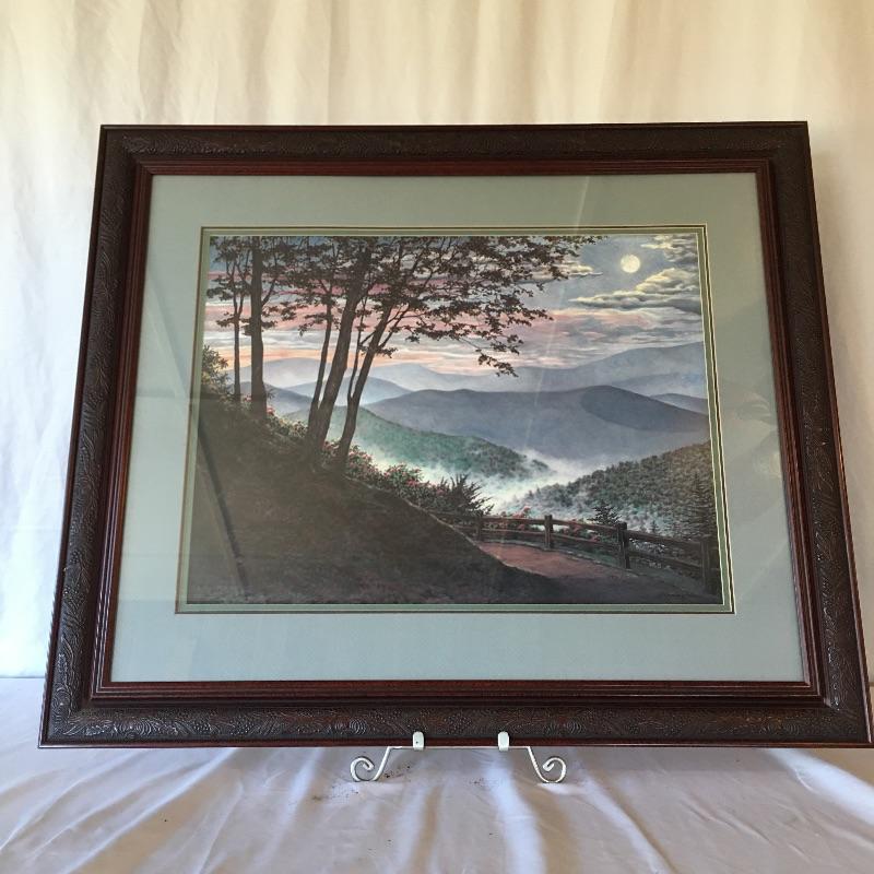 This matted, numbered and signed Teresa Pennington print is a spectacular mountain painting of our much loved mountains that is mounted in a dark carved wooden frame. Includes a certificate of Authenticity . Bring the mountains indoors with this fabulous piece. Frame measures 27” x 32”.
