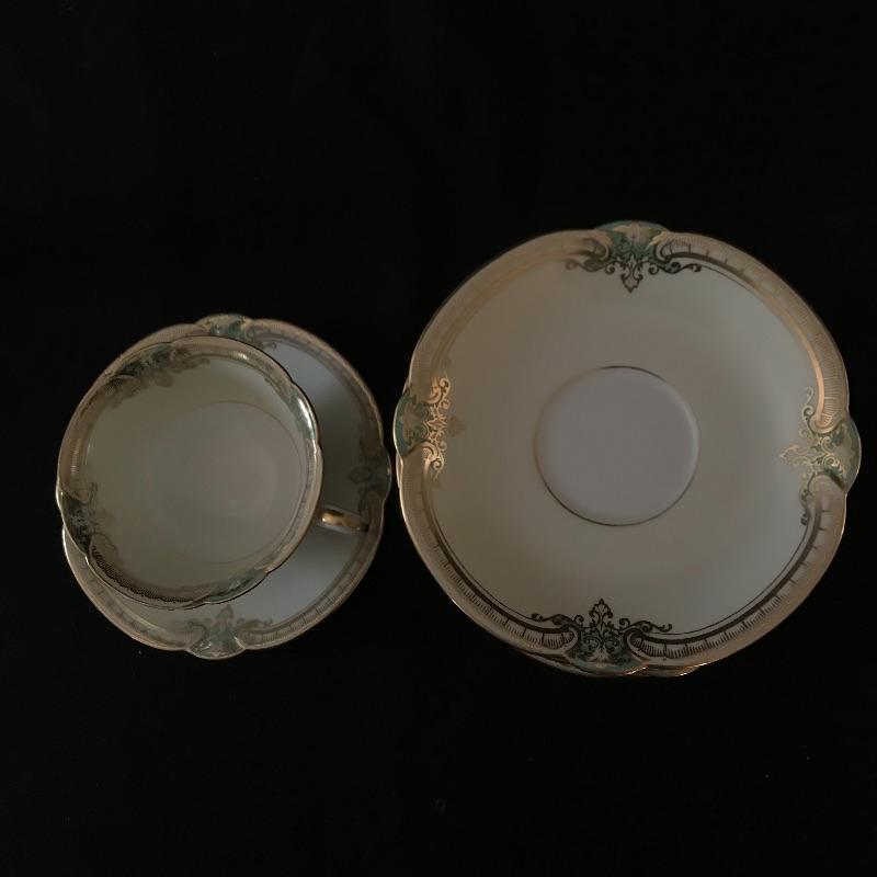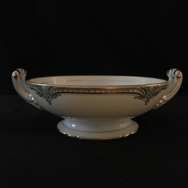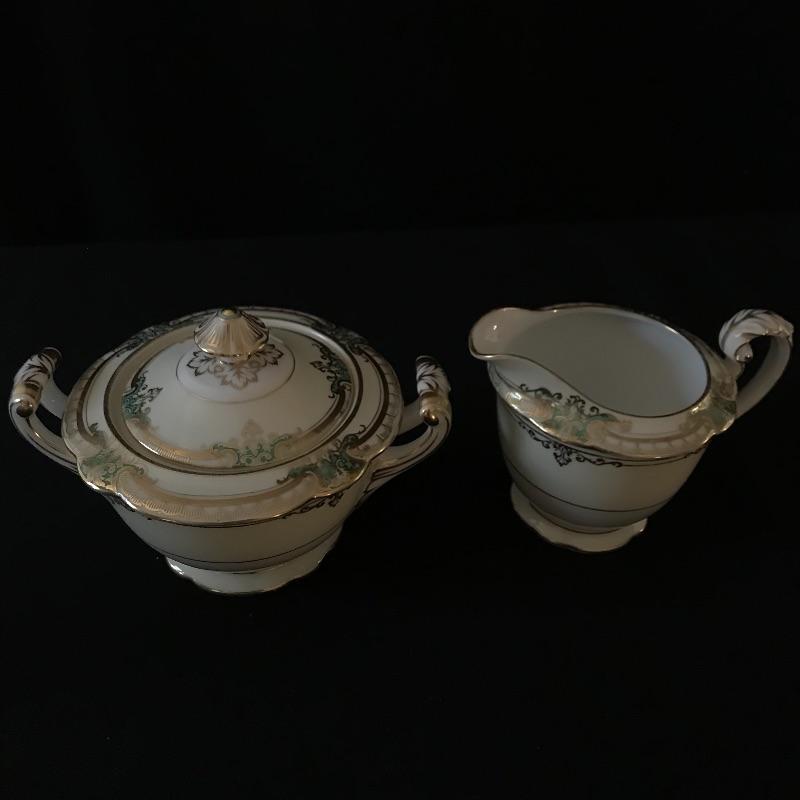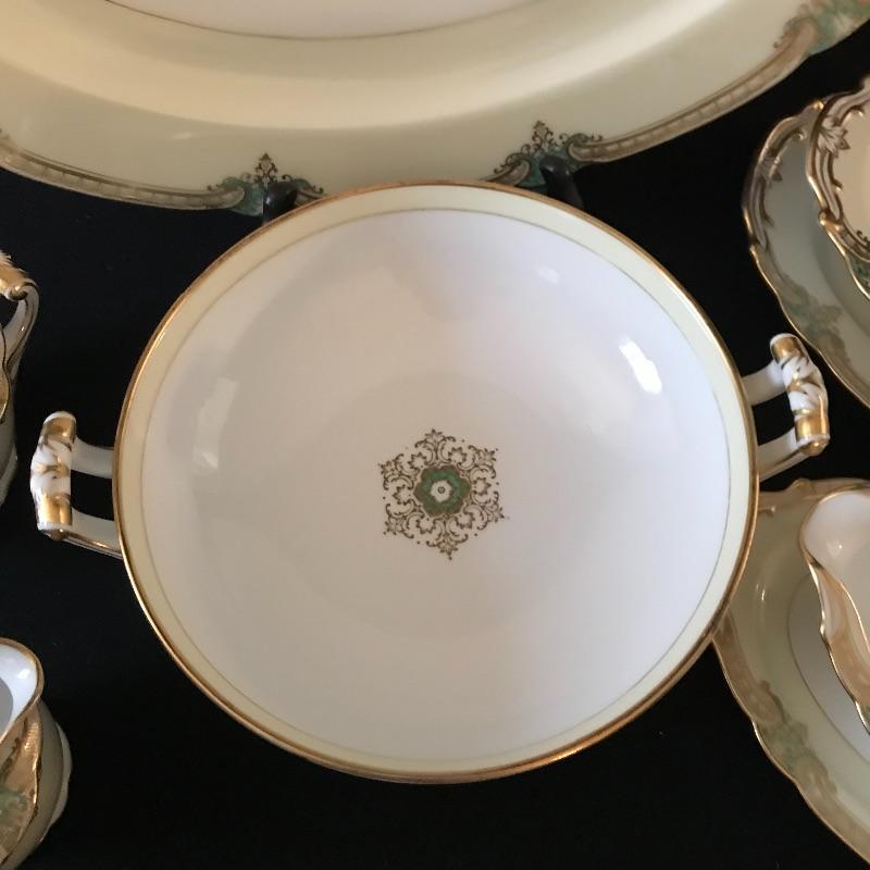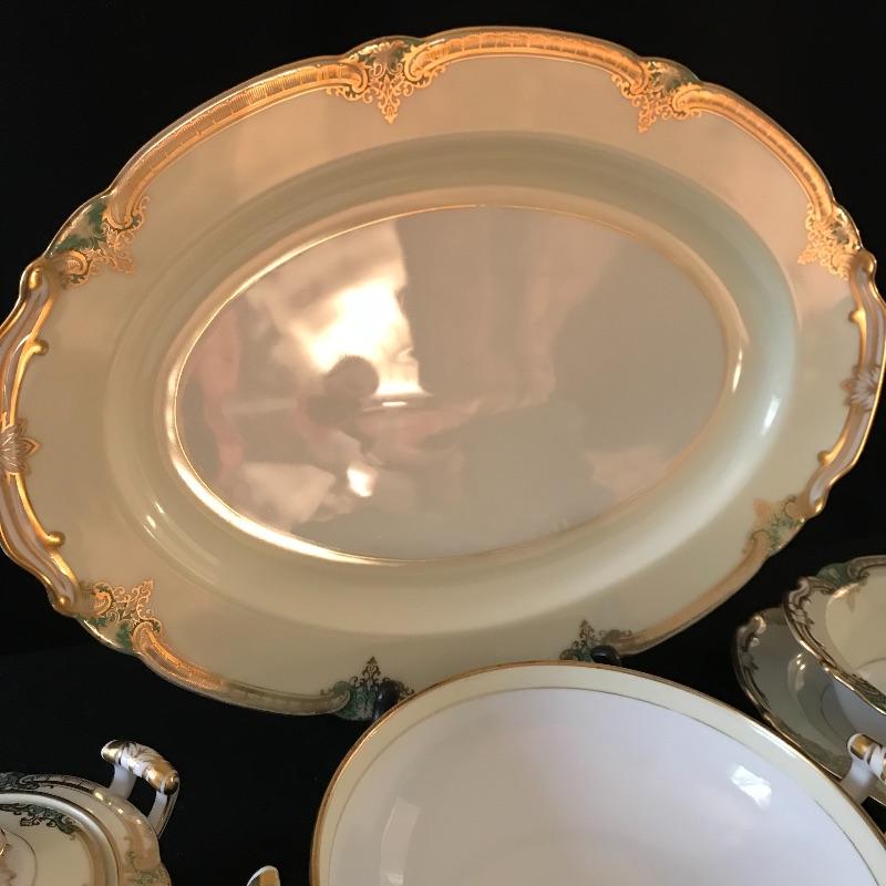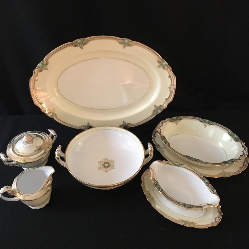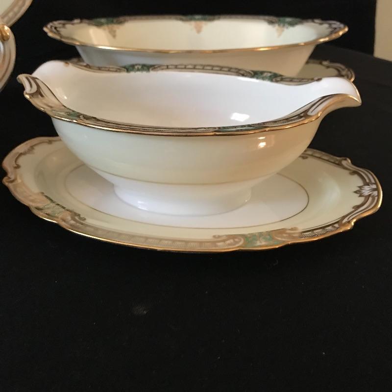 Beautiful green and gold accented cream Noritake china set in wonderful condition. Pattern is called Grenwold and lot includes 12 person place settings as well as serving pieces.