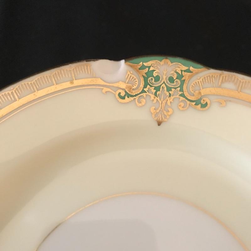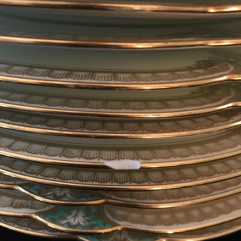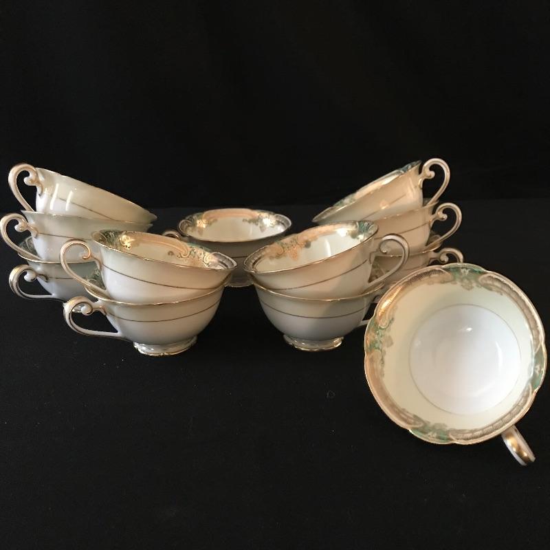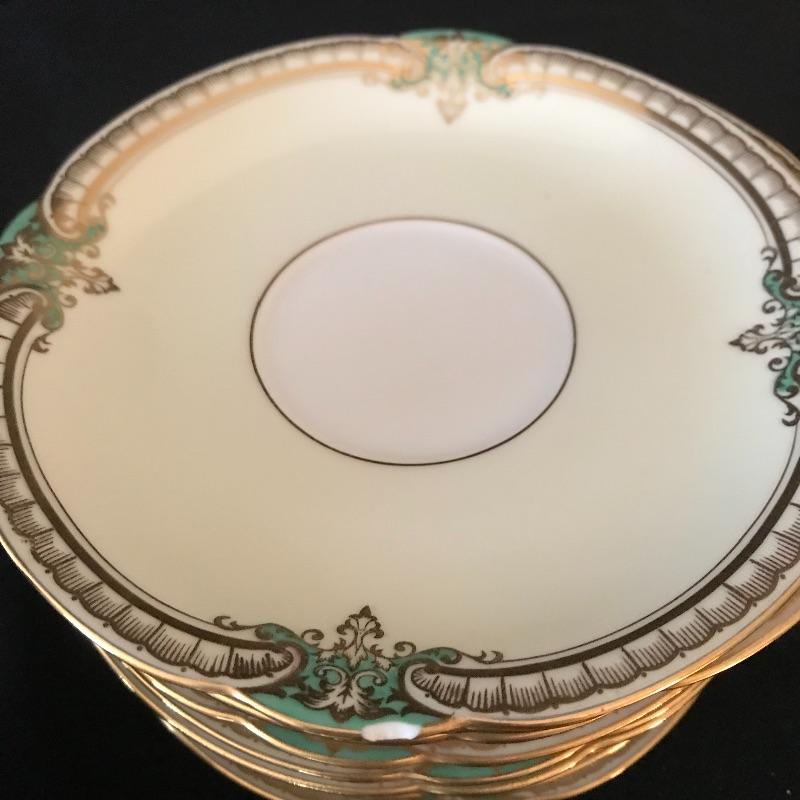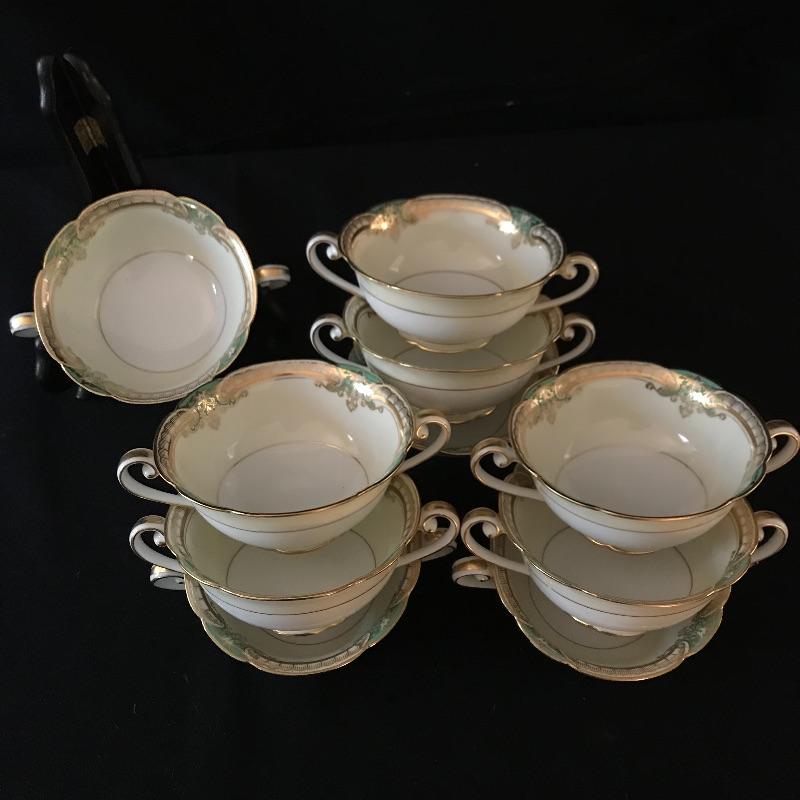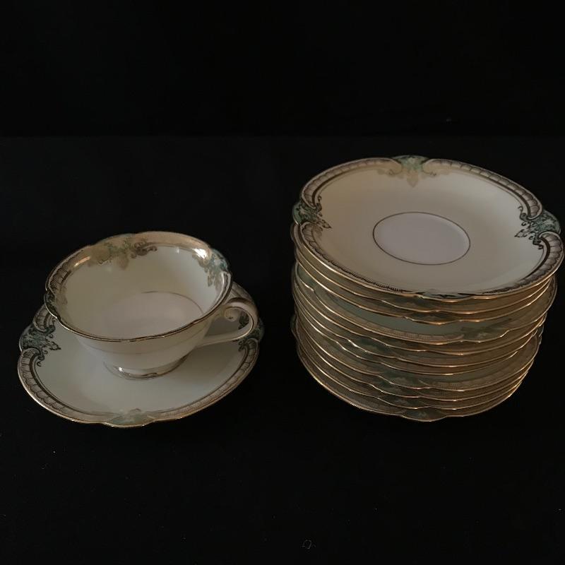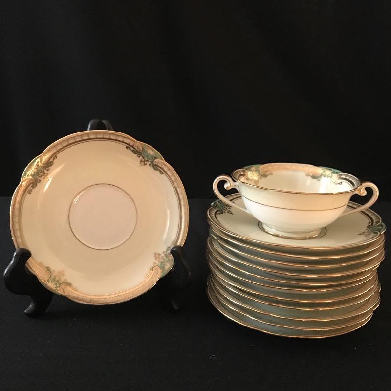 Dining set includes twelve each 10” round plates, 8” square plates, 6.25” bread plates, 6.5” soup liners, and twelve teacups with 5.5” liners. Ten each double handled soup bowls and 5.5” shallow bowls.