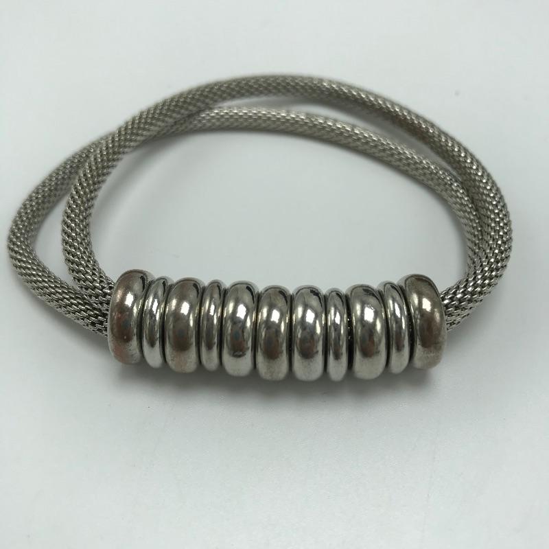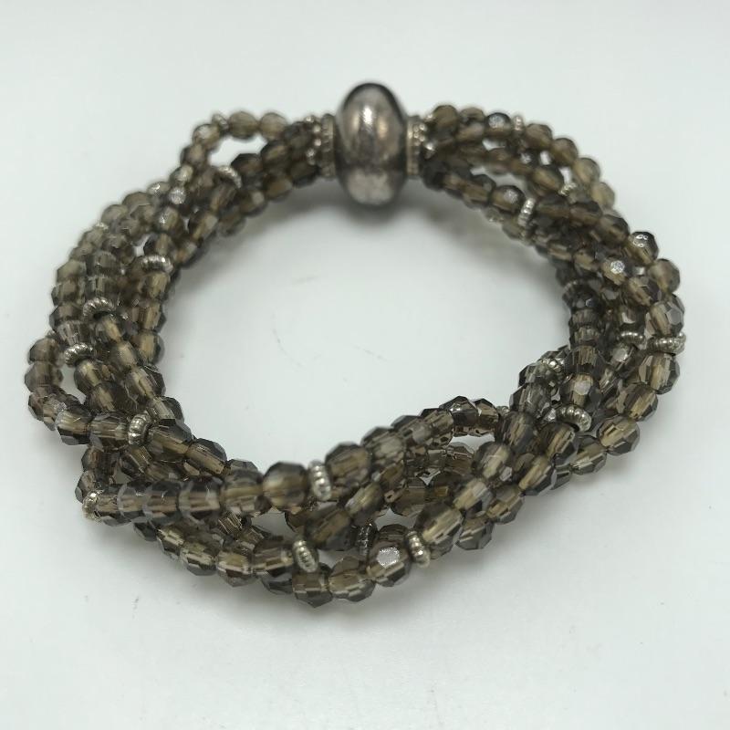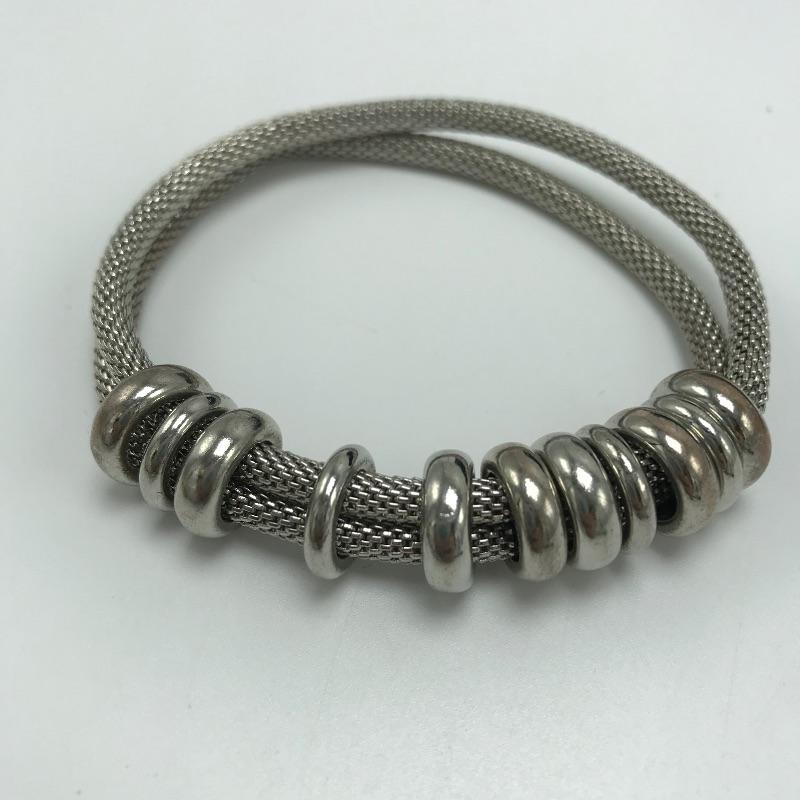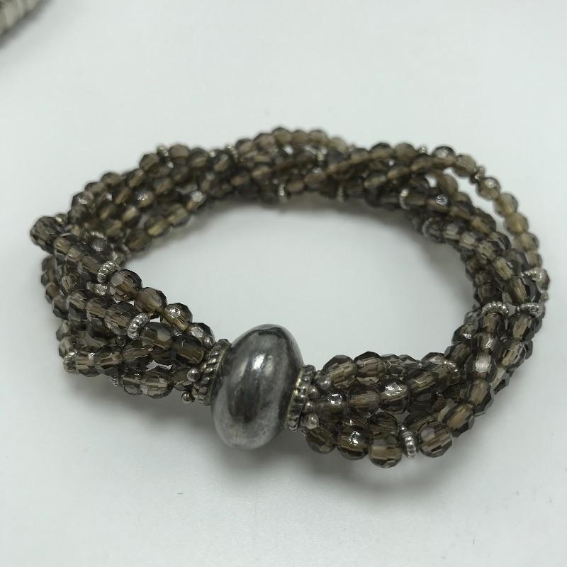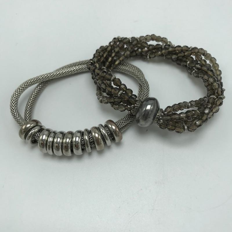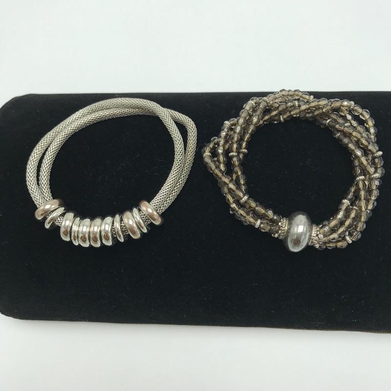 Two pretty silver bracelets perfect for a variety of events! Both offer a slight flexibility- just enough to take on or off, but they hold their shape well when worn. The hoop charmed silver bracelet has a double mesh chain and the other has silver colored beads intermittently spaced with gray clear beads and a silver bead centerpiece. Markings were not located on either bracelet. See photos.