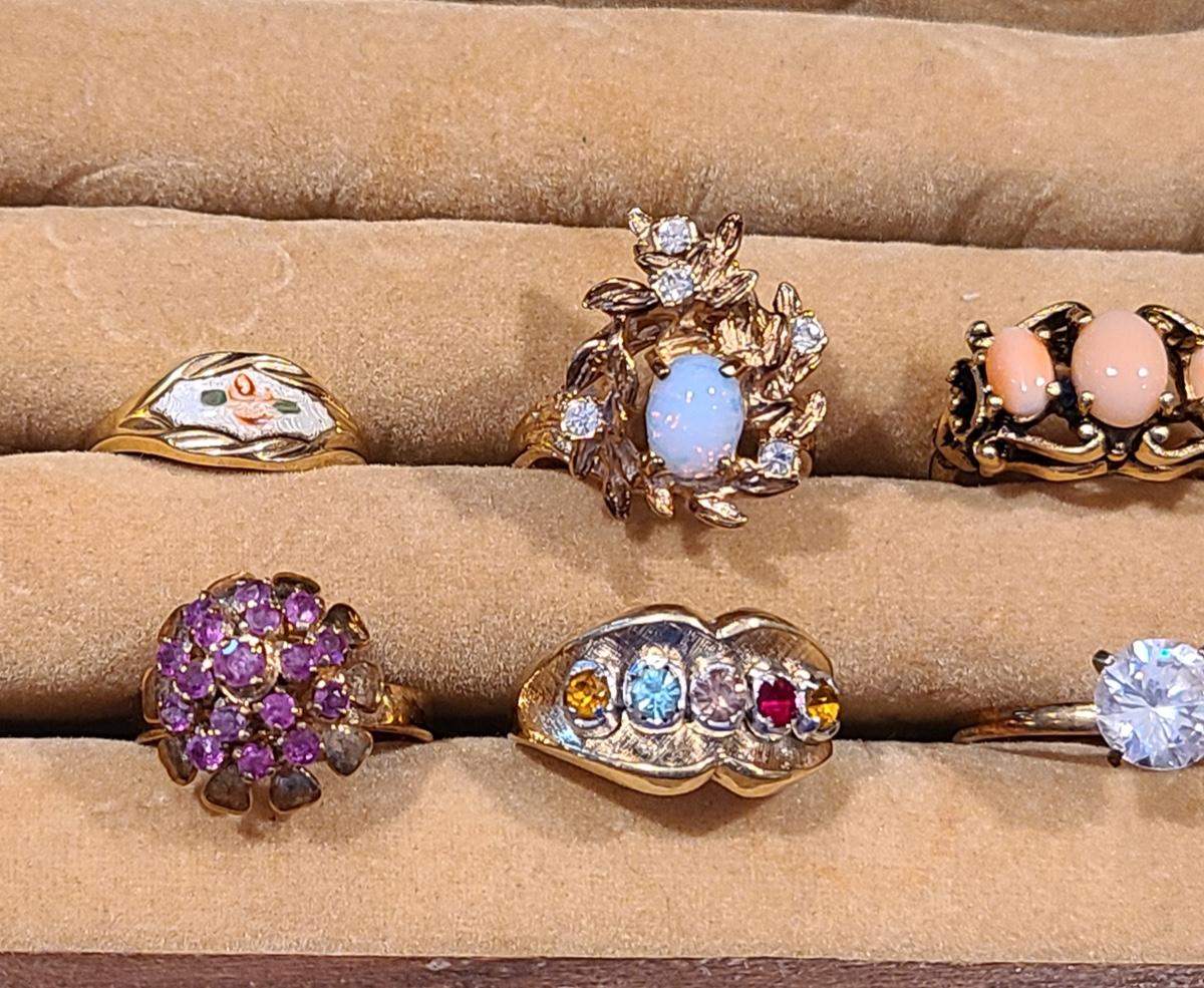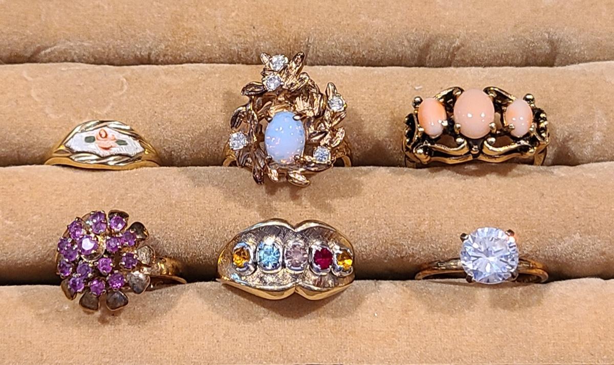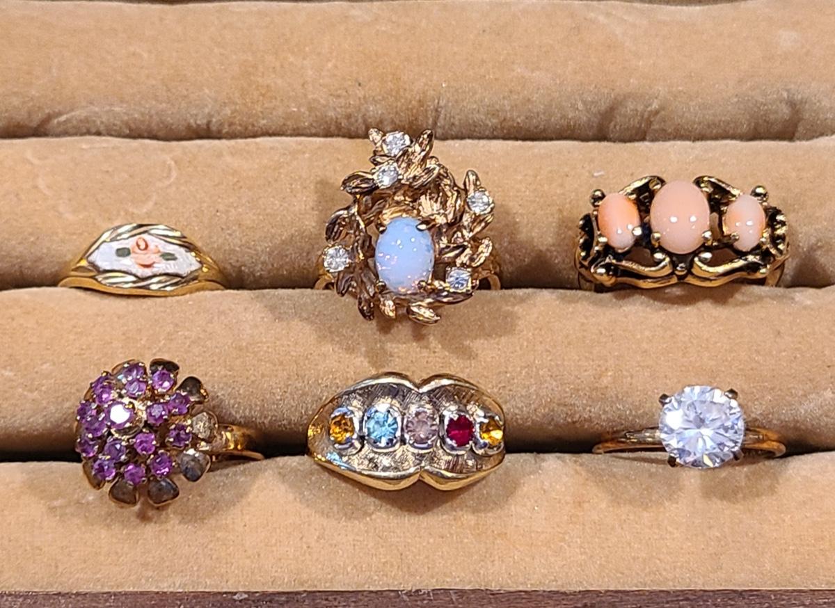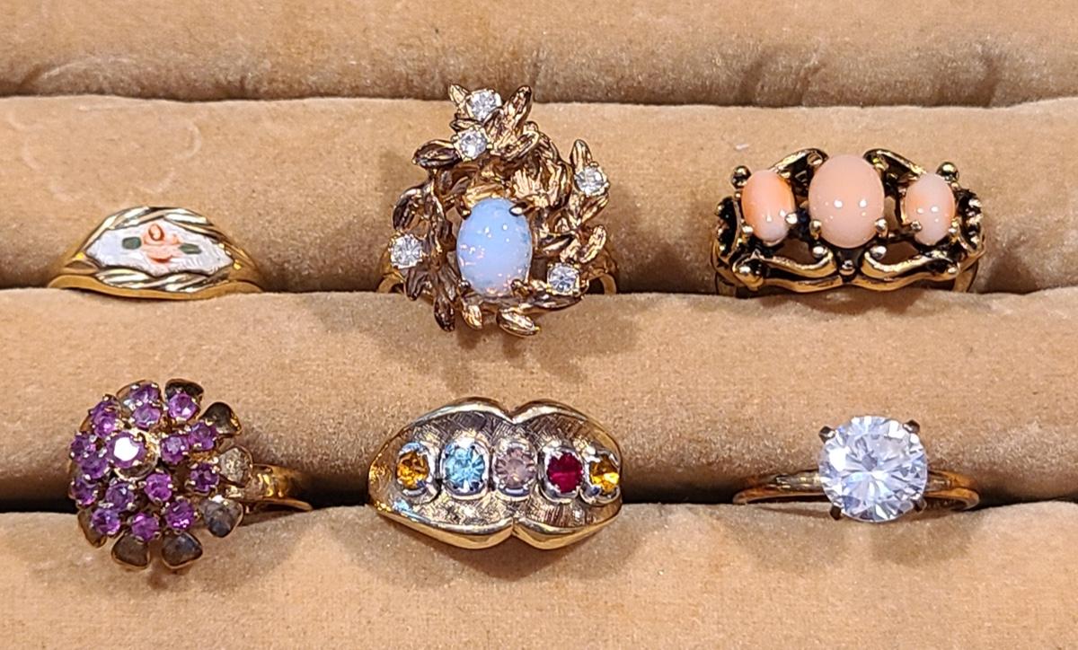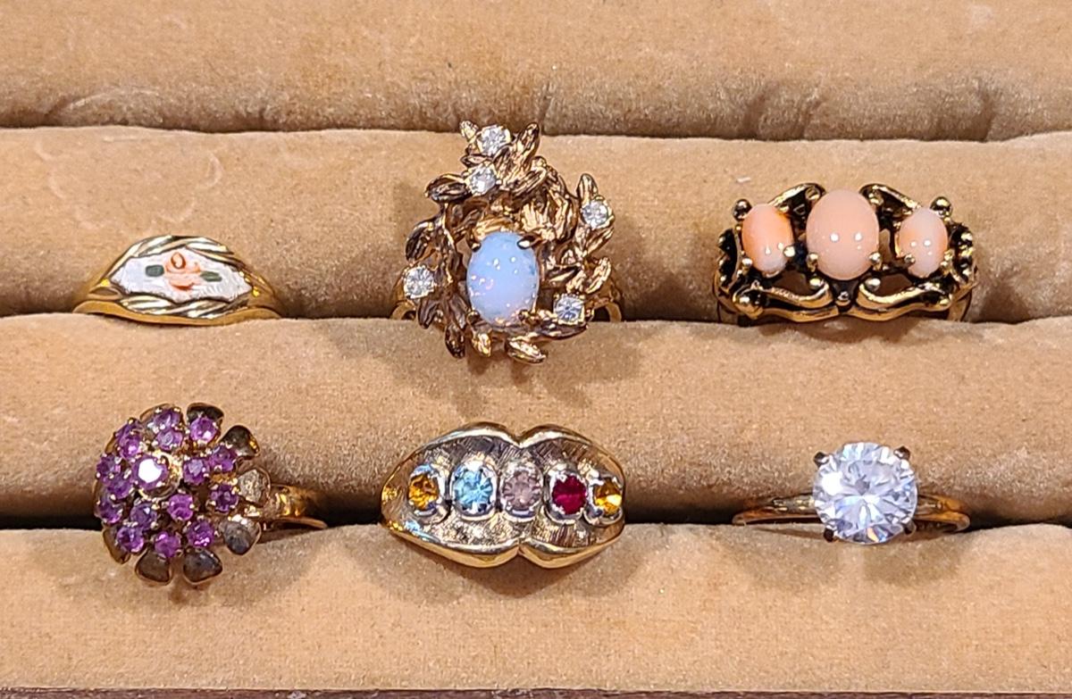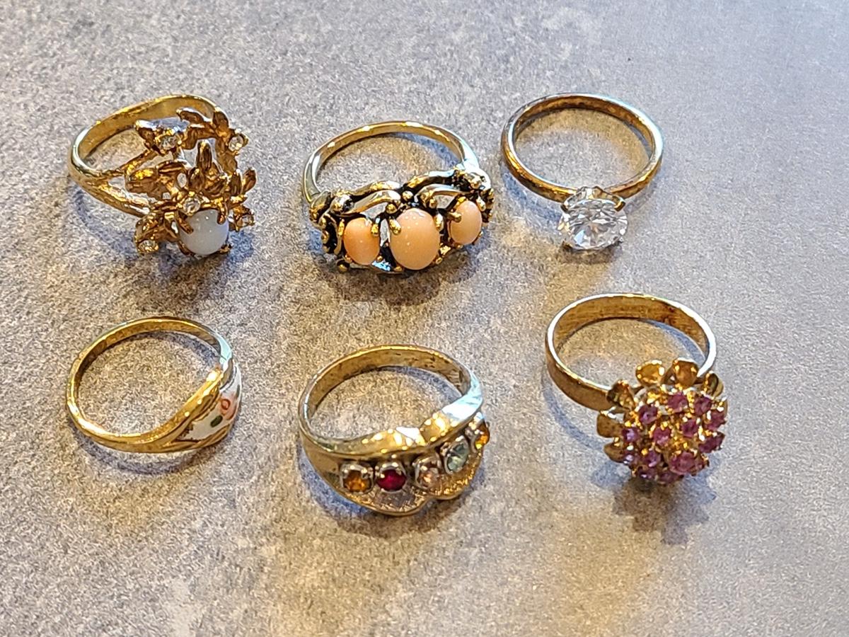 Vintage lot of 6 cocktail/costume rings, Some marked, some not. Most are marked electroplated. Please see all pictures as they are the best representation of the items. The pictures show condition, measurements if taken, and what is included in the lot. Due to the large amount that we photograph and the time frame, we are not always able to take measurements. All items unless noted, are pre-owned and have been used. If you purchased furniture, you must bring help. We do not allow one person to carry large furniture out on their own. Bring help, tools and a truck for the safety of our client’s homes, and your personal safety. Company policy. Thank you.