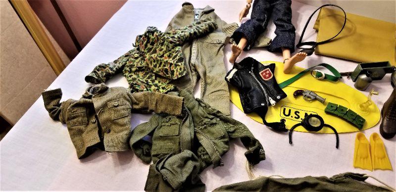 1960's era GI Joe lot - you get all you see here. Two dolls (Jointed) - one's beard is a bit "rubbed" - tent, guns, clothing, action gear