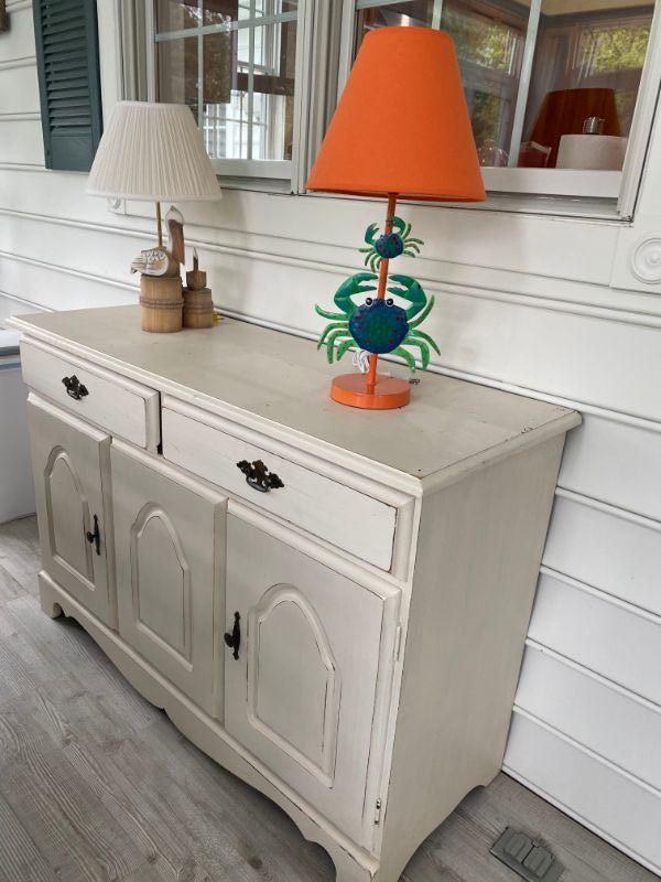 Vintage White Painted Side Cabinet / Server. Two drawers and two cabinet doors with shelves. great for storage