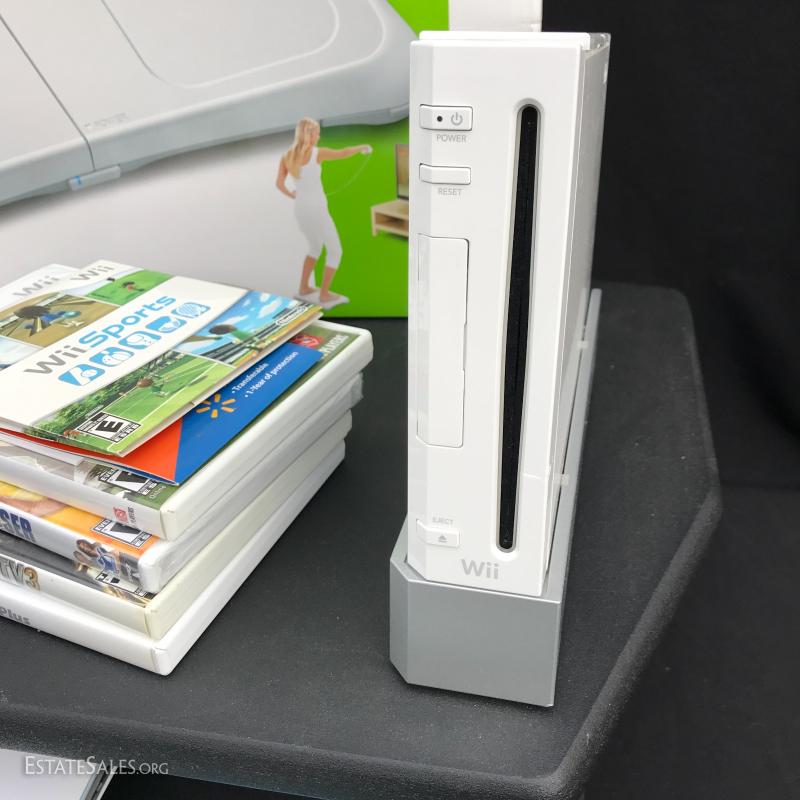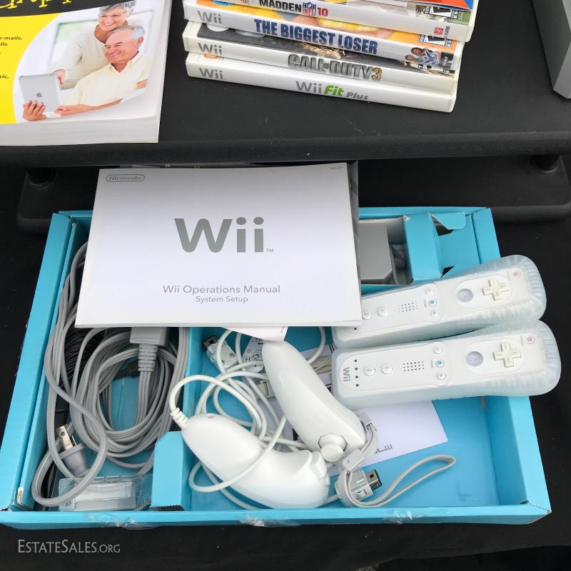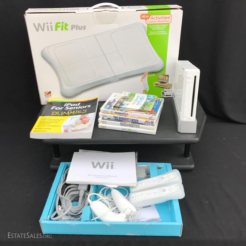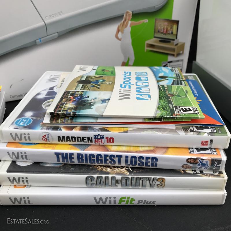 Wii Game Console model number RVL-001(USA). Includes two remotes, two nunchucks, sensor bar and cables. Games include Wii Fit Plus, Madden NFL10, Biggest Loser, and Call of Duty 3. Also includes table top stand to hold console. Shipping available or local pick up in Asheville, NC.