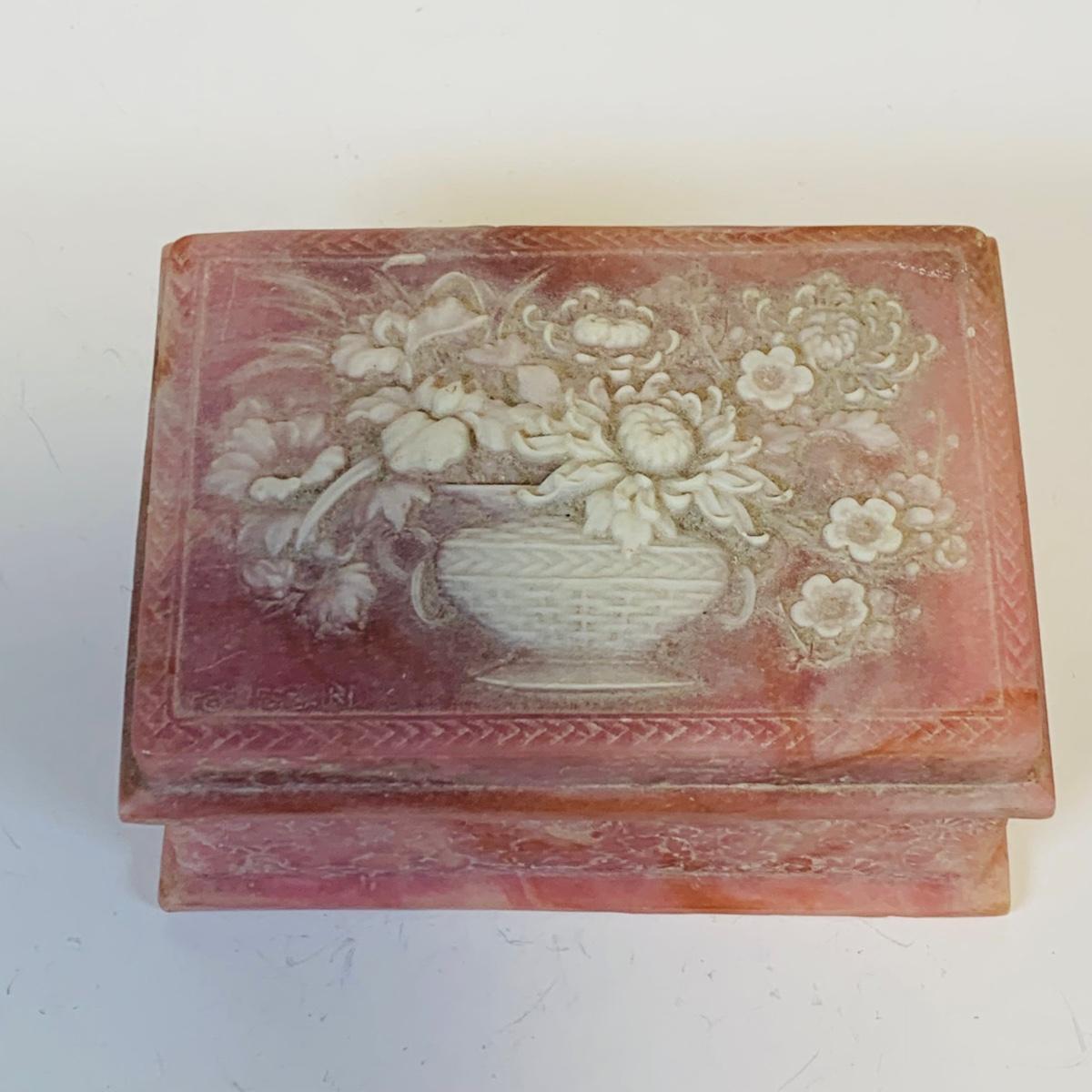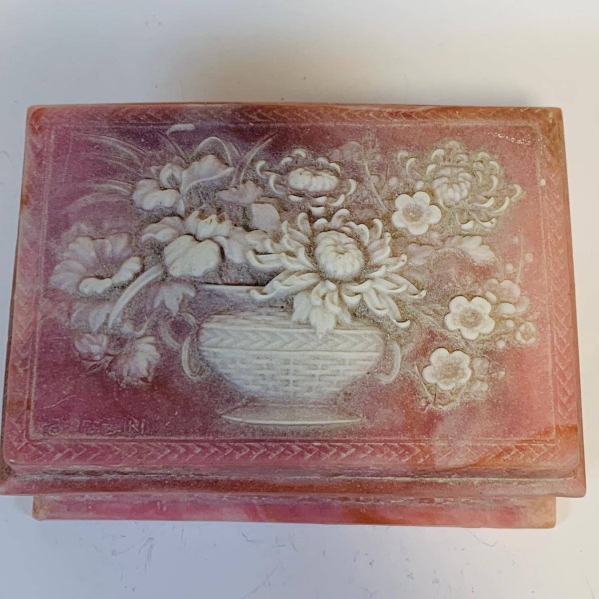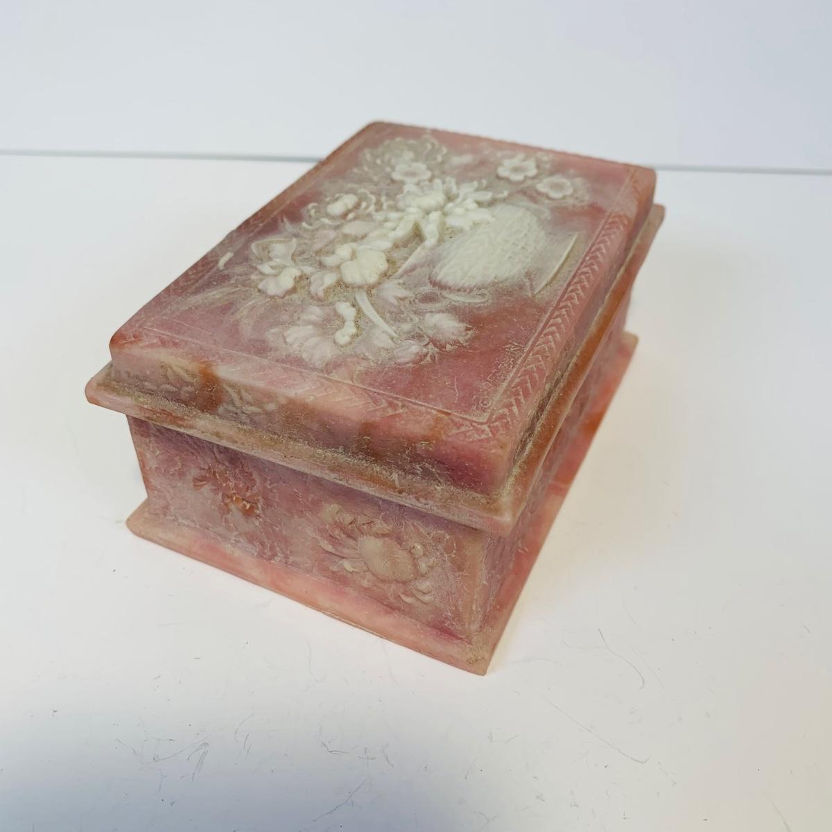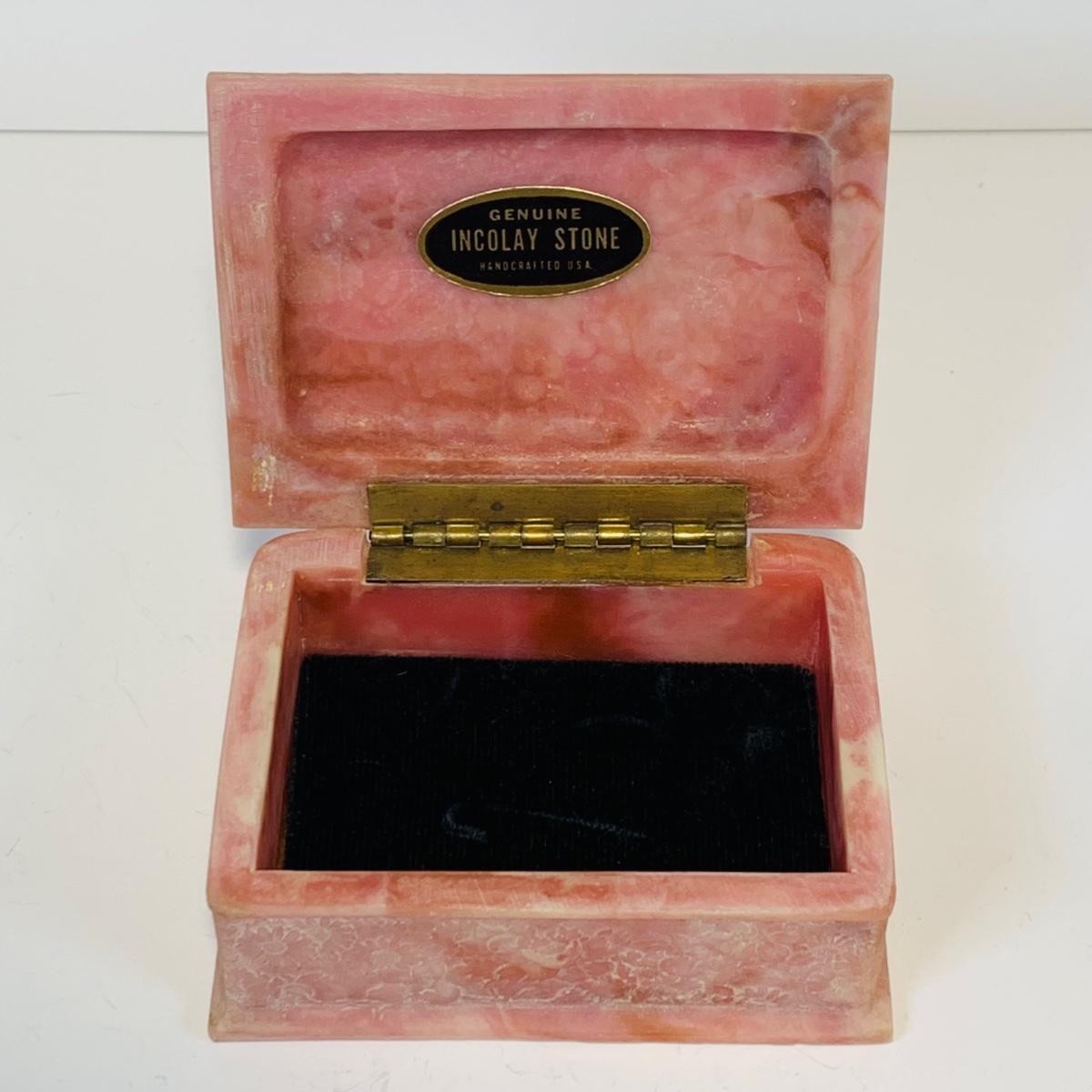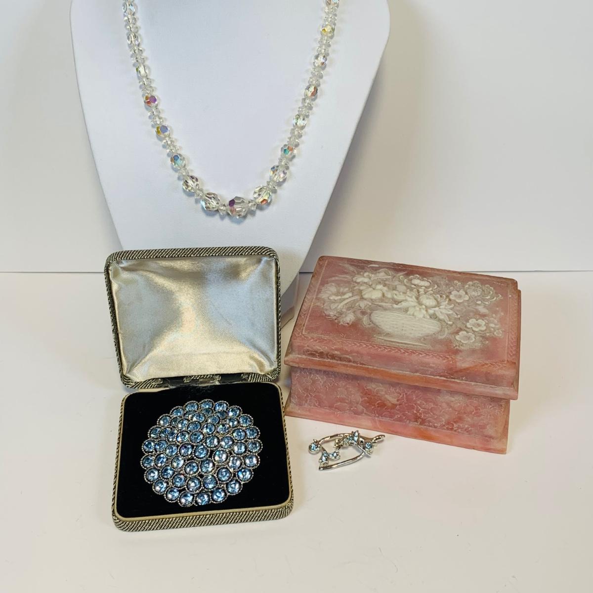 Lot 240: Vintage Beautiful Pink Incolay Stone Trinket Box, Vintage Blue Rhinestone Brooch, Vintage Aurora Borealis Necklace & Wishbone Pin