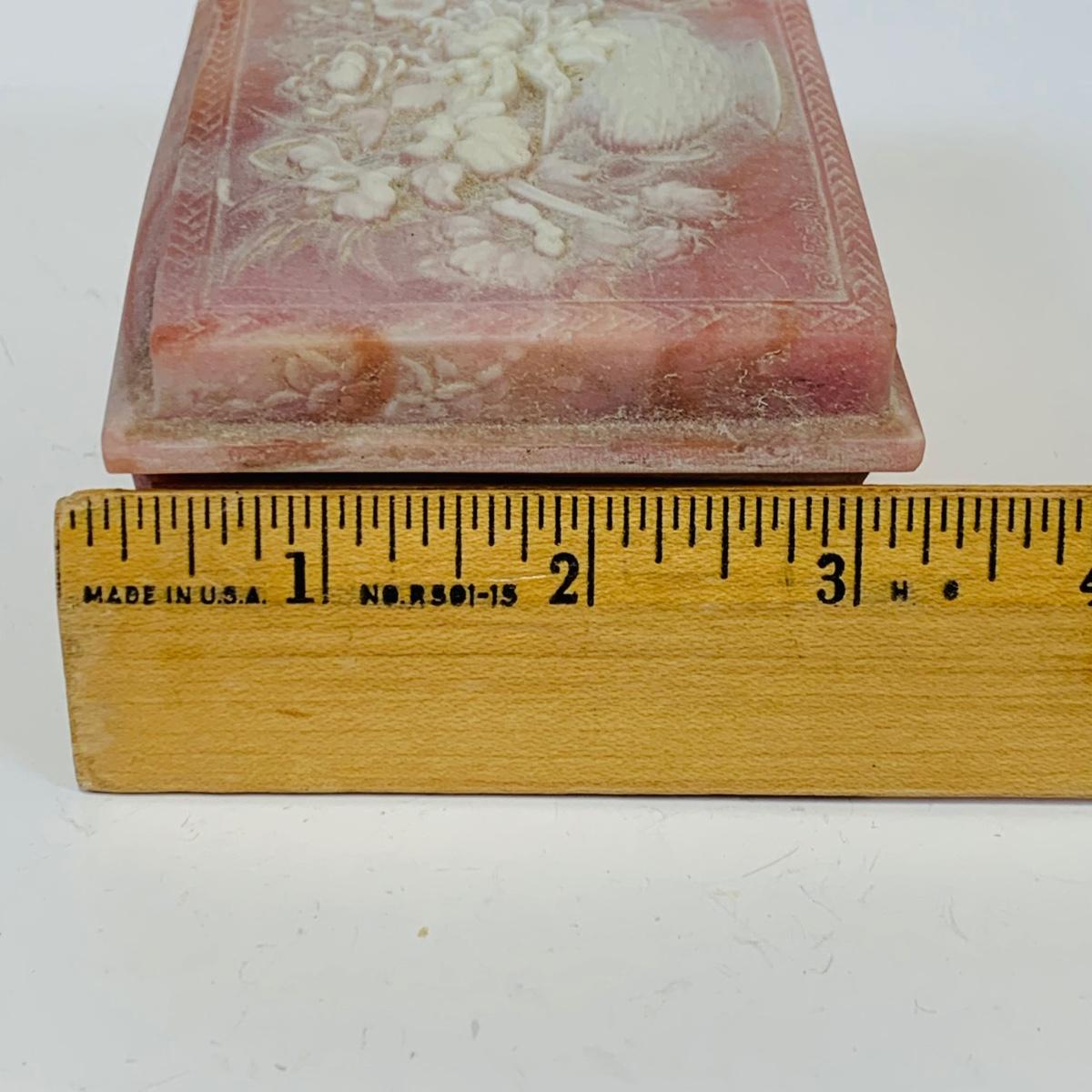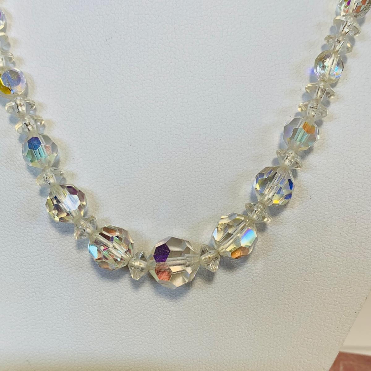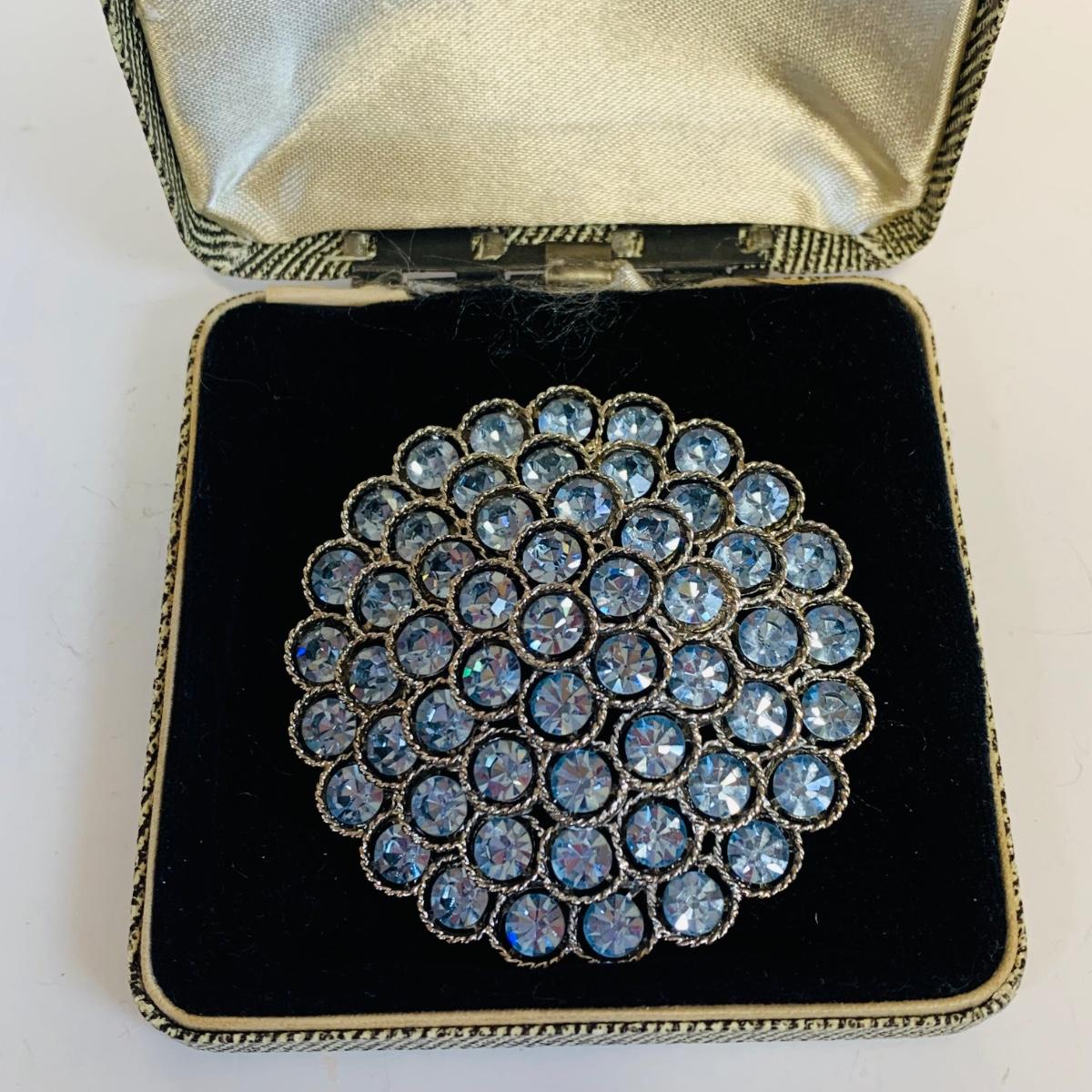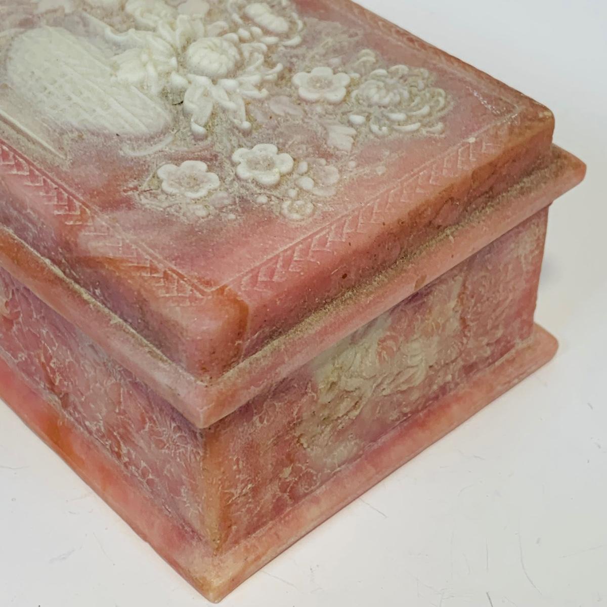Lot 240: Vintage Beautiful Pink Incolay Stone Trinket Box, Vintage Blue Rhinestone Brooch, Vintage Aurora Borealis Necklace & Wishbone Pin