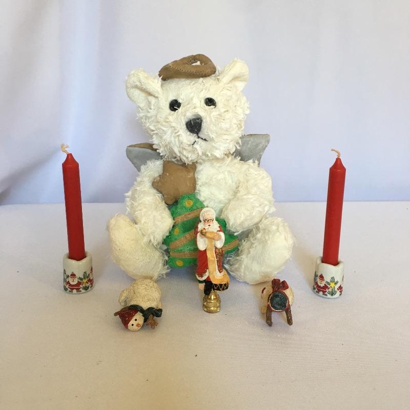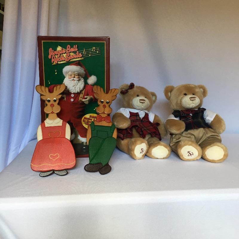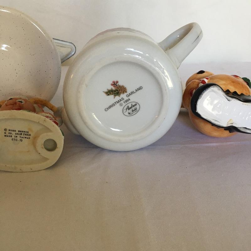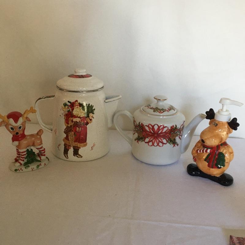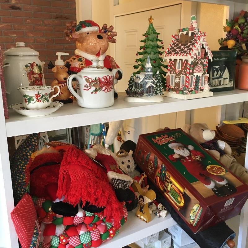 Perfect timing for the upcoming holidays, this Christmas decor includes teapots, fabric wreaths and tree, candle holders, shade topper, Brooks Brothers bears, Jingle Bell Rock Santa, cookie jar, teapots and more.