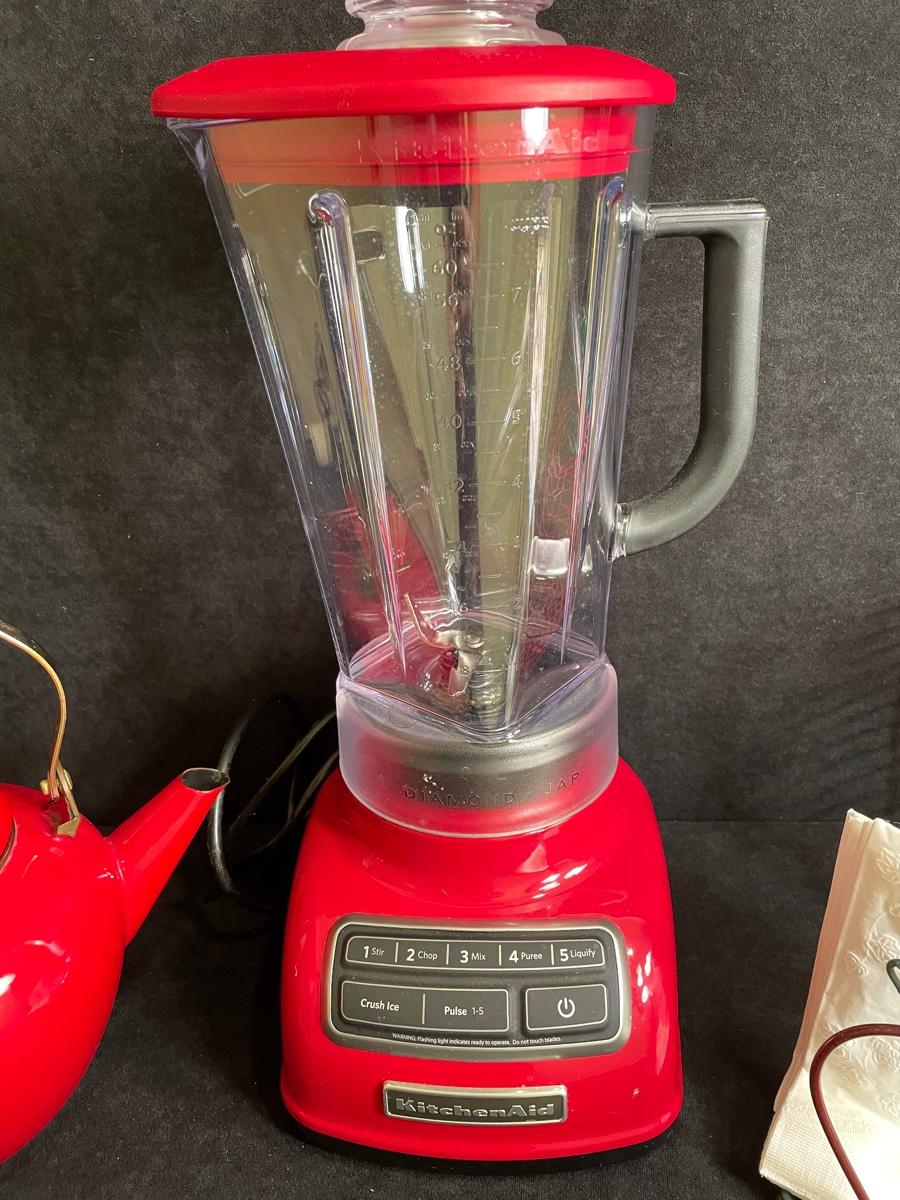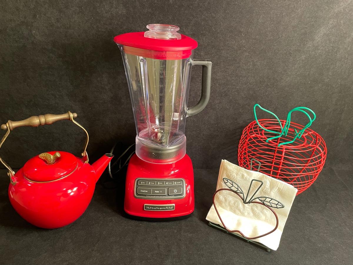 Kitchenaid blender, Red tea kettle, apple motif napkin holder and metal basket