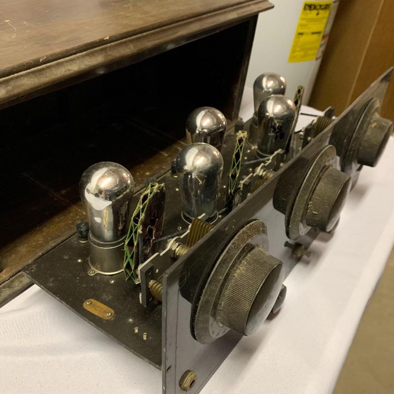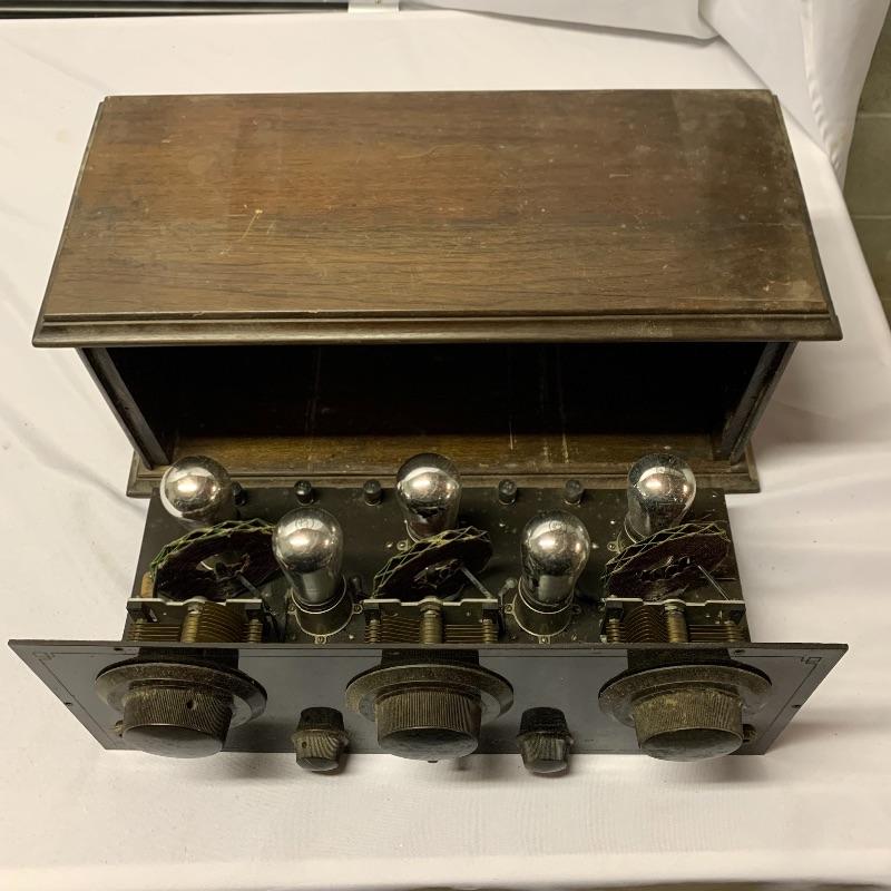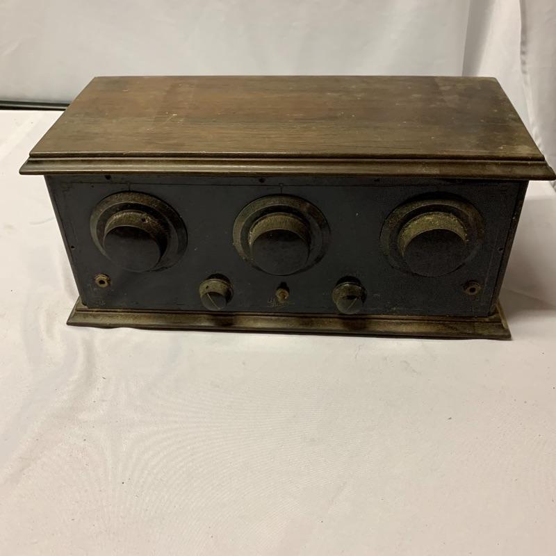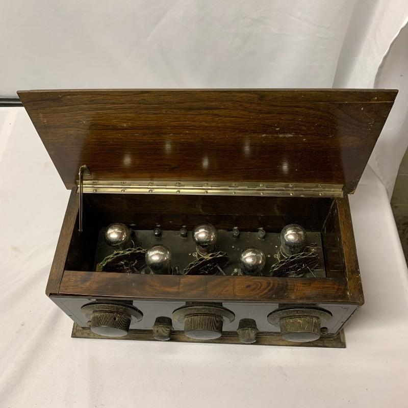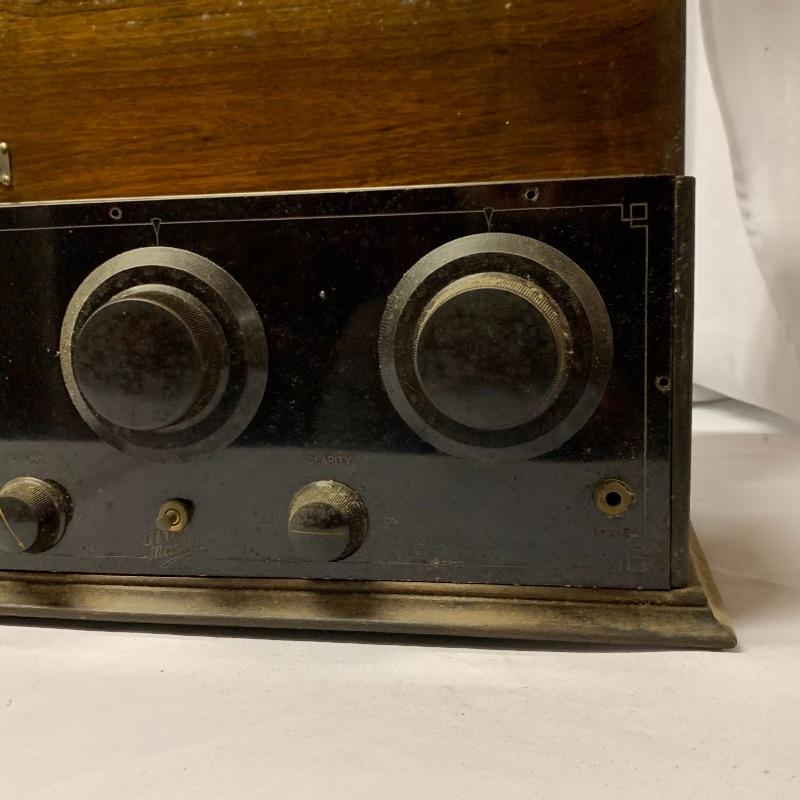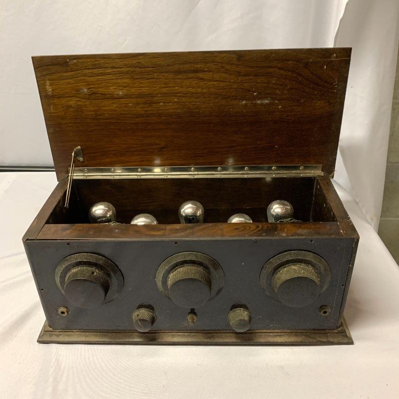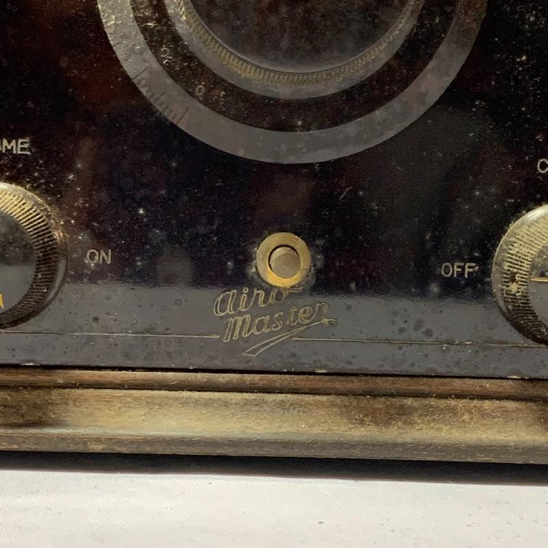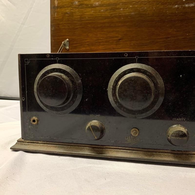 Antique Airo Master chest style radio with five tubes. It comes in a wooden case with a lid. It has three tuning knobs, a volume knob, and clarity knob.