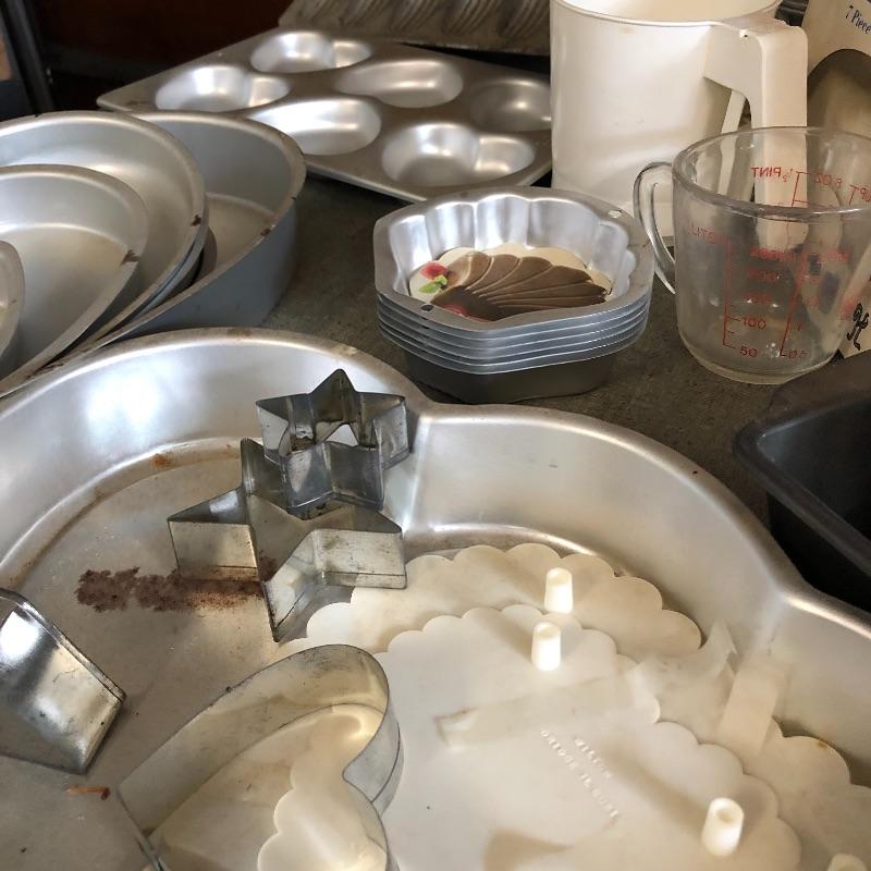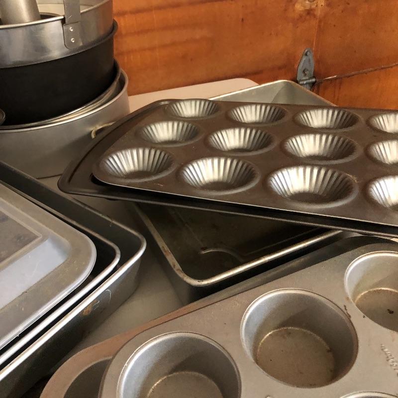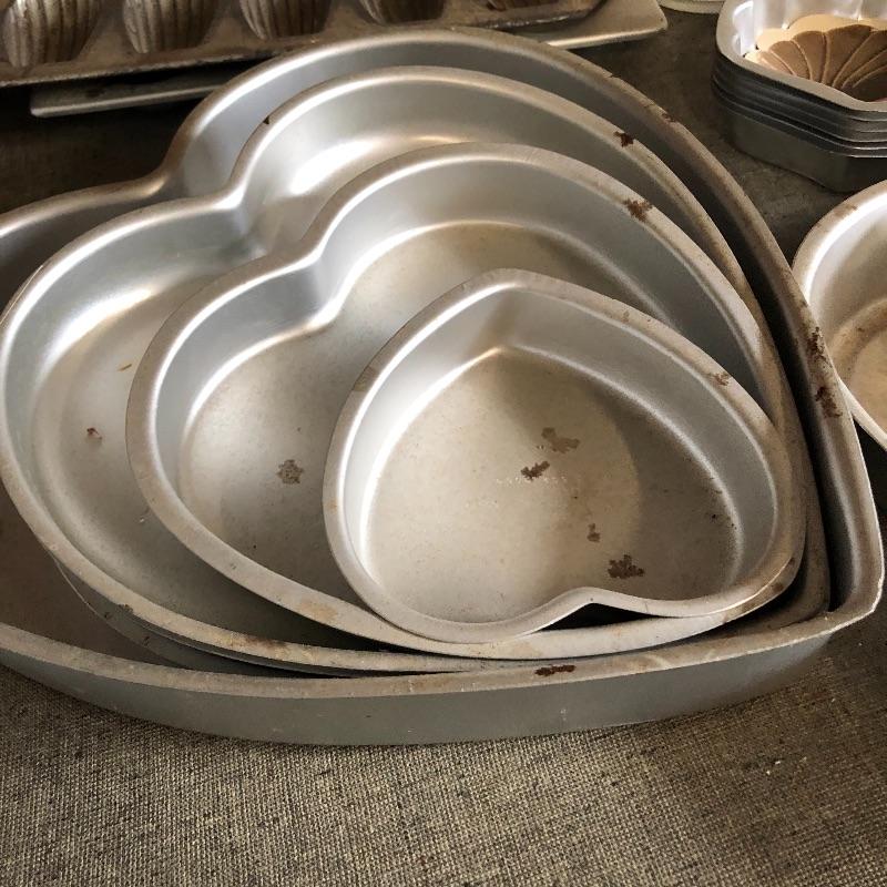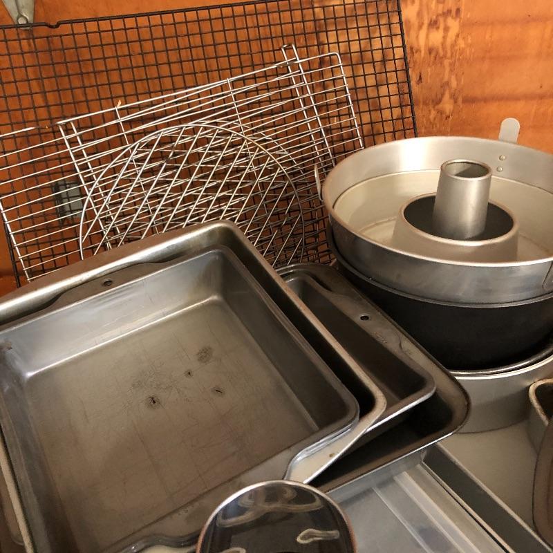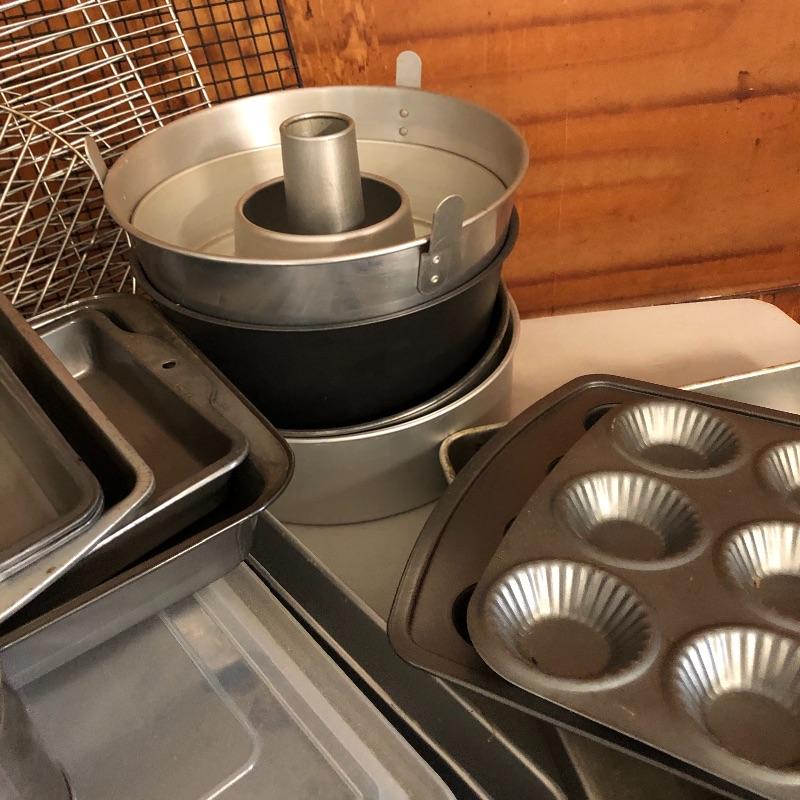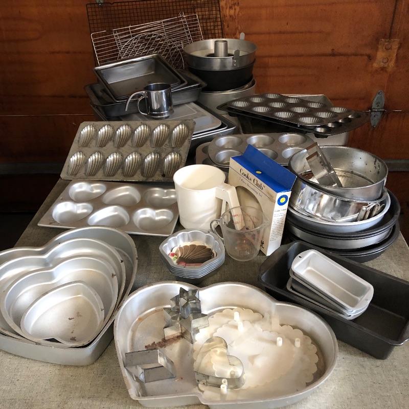 This lot contains absolutely everything you need to bake! It includes numerous cup cake tins, heart shaped baking sheets, a variety of sizes of cake pans, numerous round cake pans, numerous cooling racks, a couple of flour sifters and more! Local pick up only.