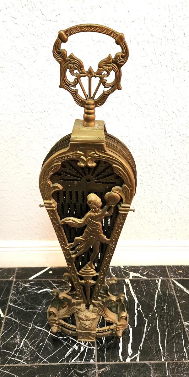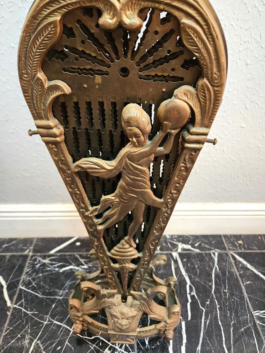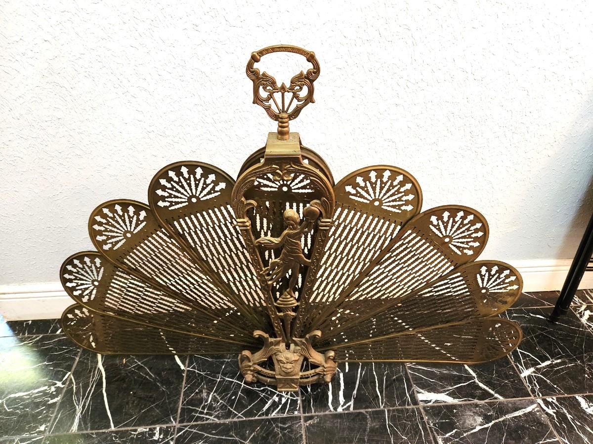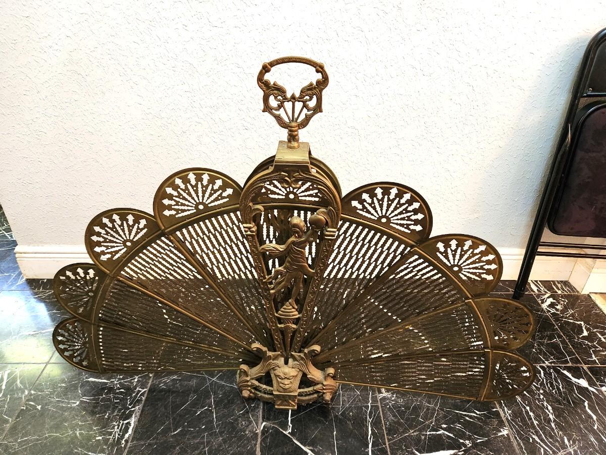 Brass collapsible fire screen - display folded or not. 34" tall, 37" wide when fully extended. Side latches missing, but the panels stand up on their own. Heavy.