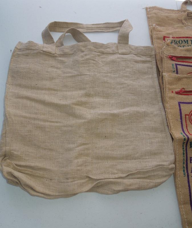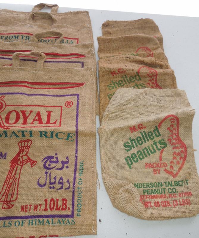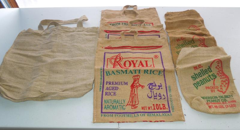 Four basmati zipping burlap bags and 4 burlap NC peanut bags. Also larger cloth linen shopping bag.