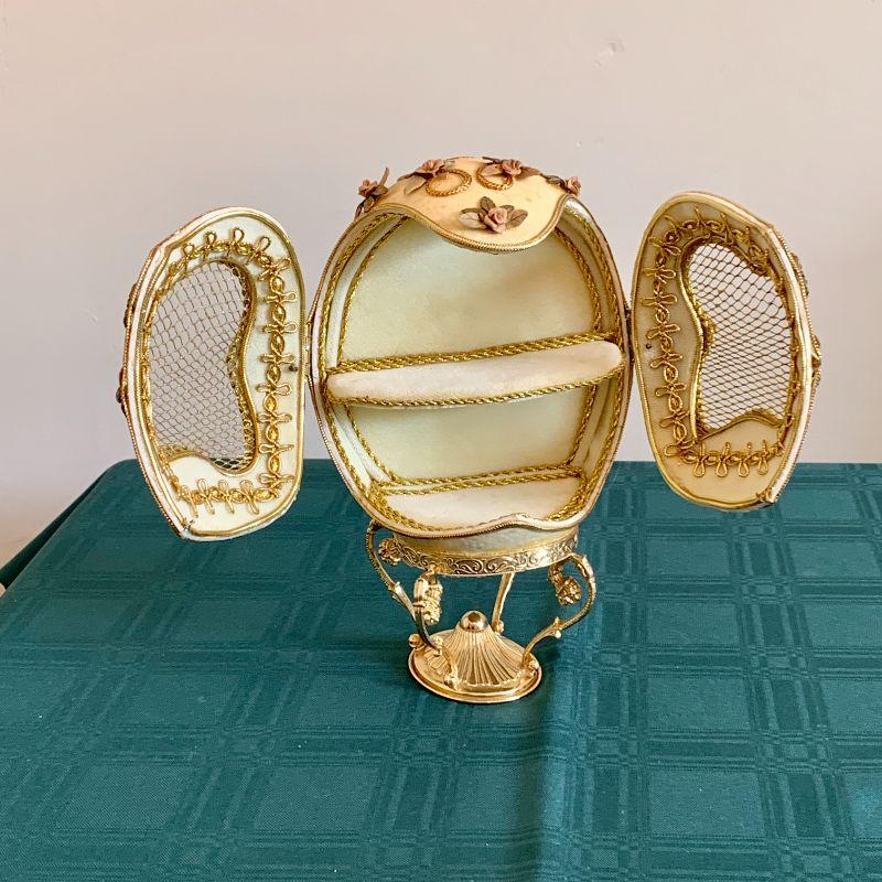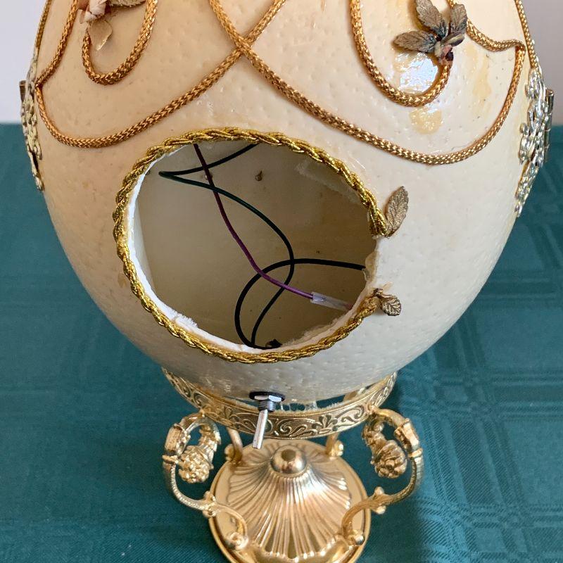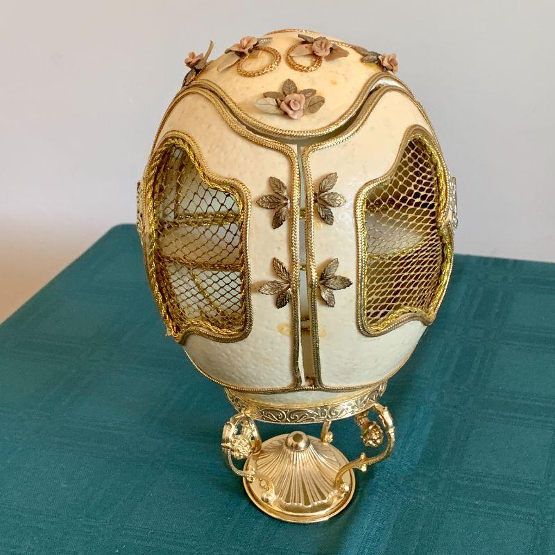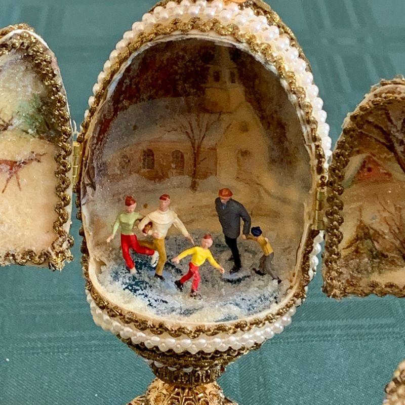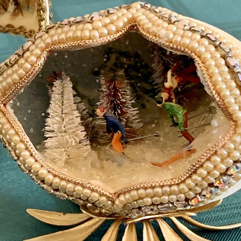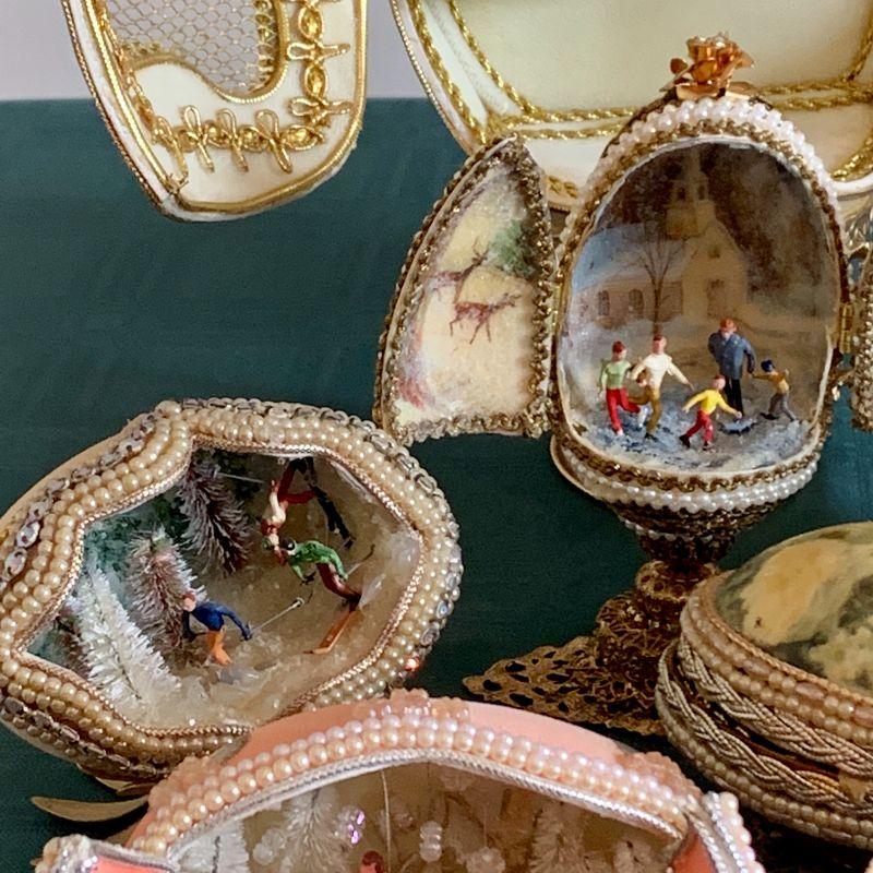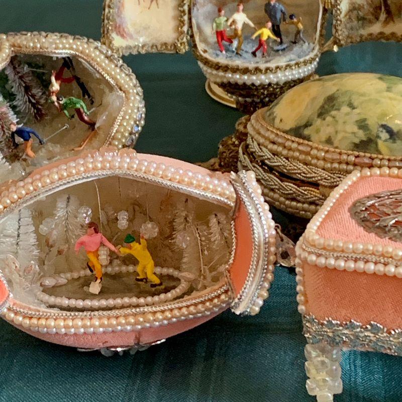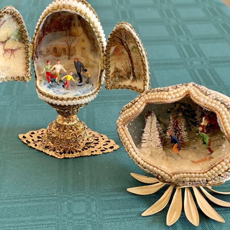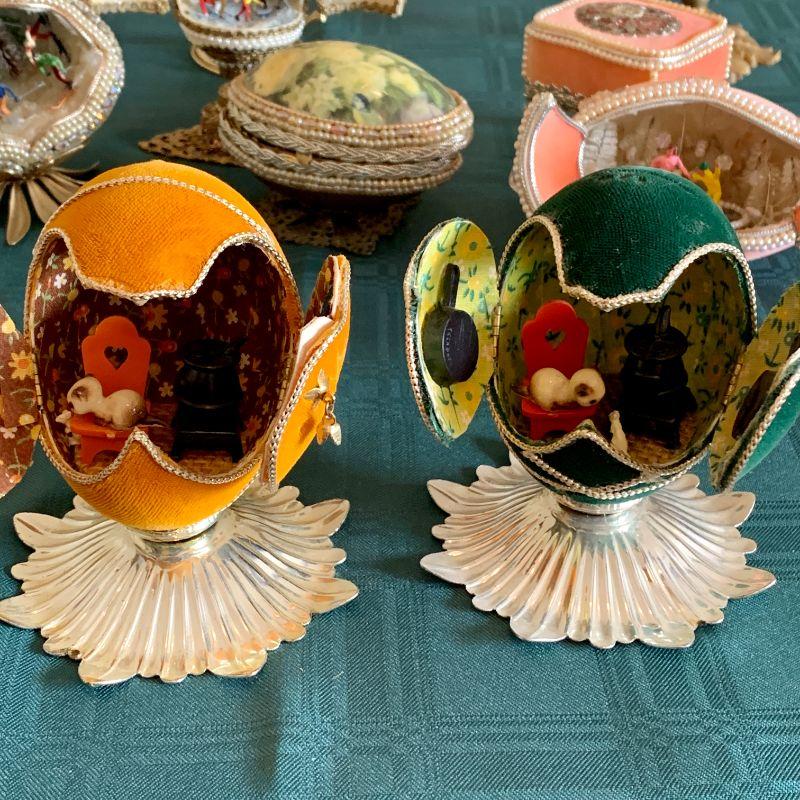 Vintage crafts. Real eggs cut, embellished with tiny scenes arranged inside. Ostrich egg becomes a display unit with shelves inside. Very well done!