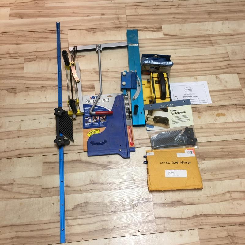 Lot includes fence featherboards, miter clamp springs, Kreg square cut, universal fence clamps, Grr-Ripper and more.
