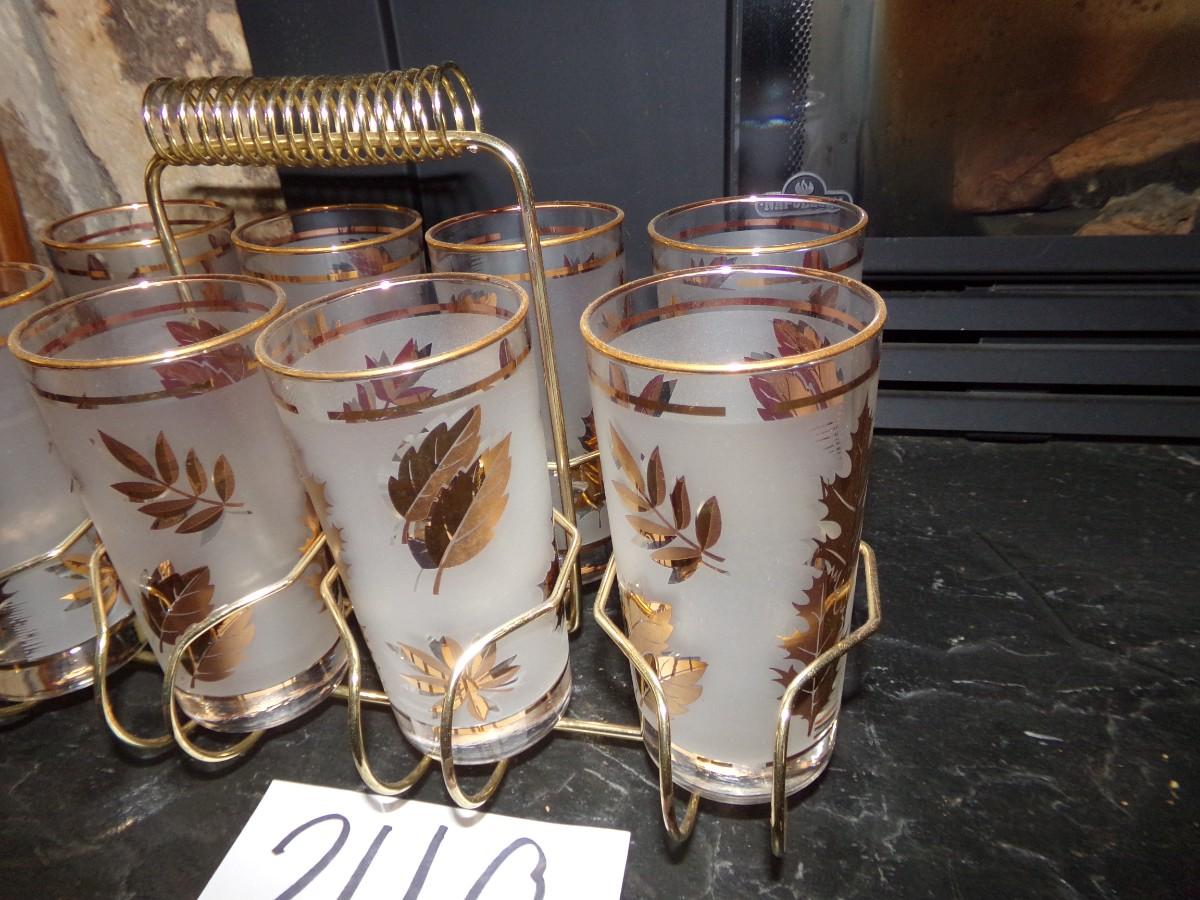 VINTAGE GLASS WITH FROSTED GOLD LEAF AND CARRIER. SET OF 8