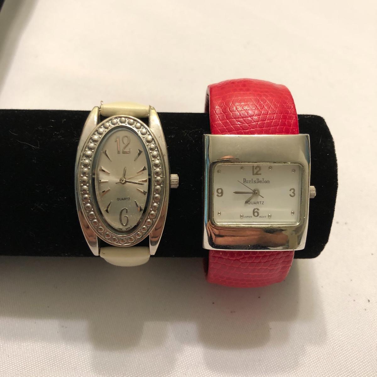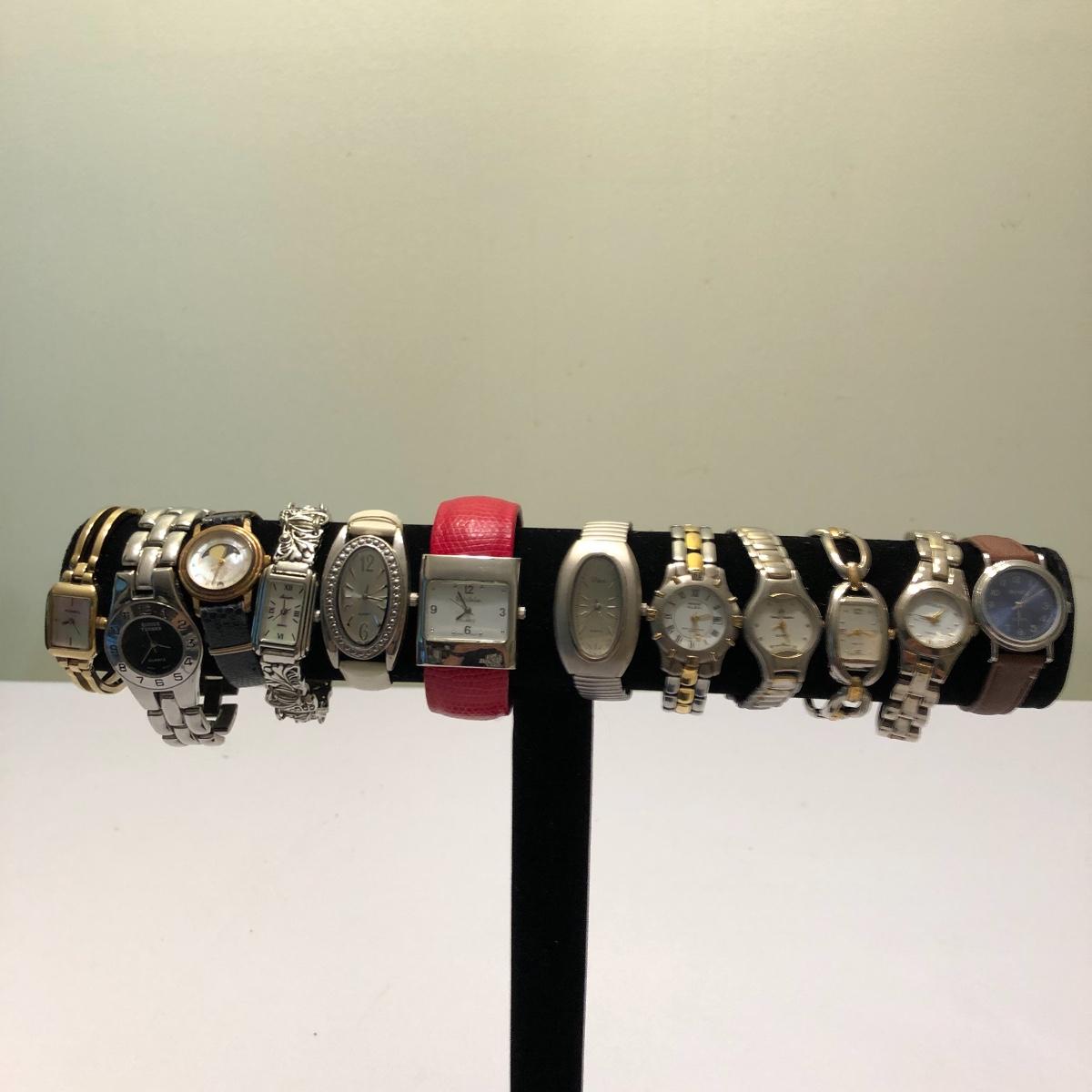 A selection of over fifteen ladies watches in a assortment of styles, materials and colors. Lot includes Bijou Turner, Anne Klein, Paris Delon, Axcess, Rumours, Seiko, Timex and more. All watches were not tested as the batteries appear to be dead.
