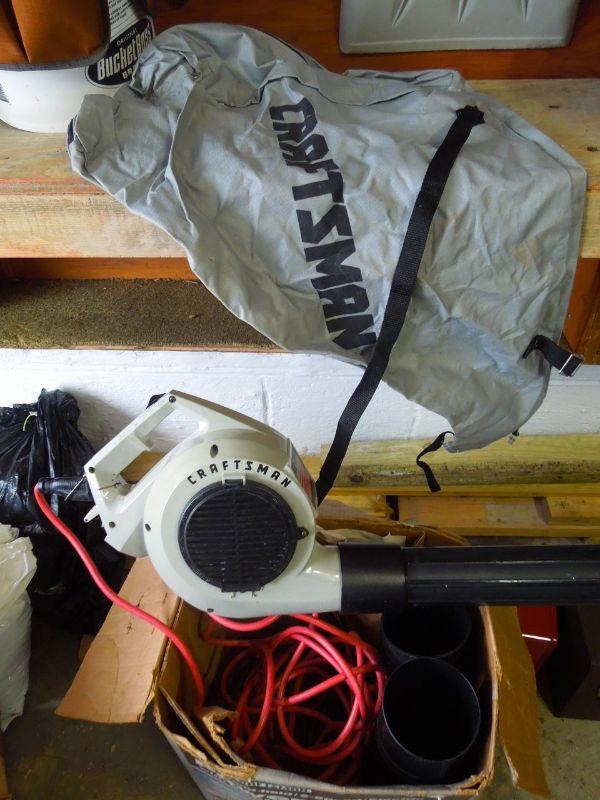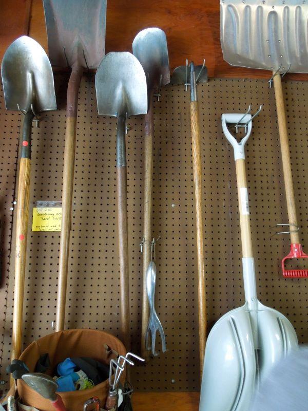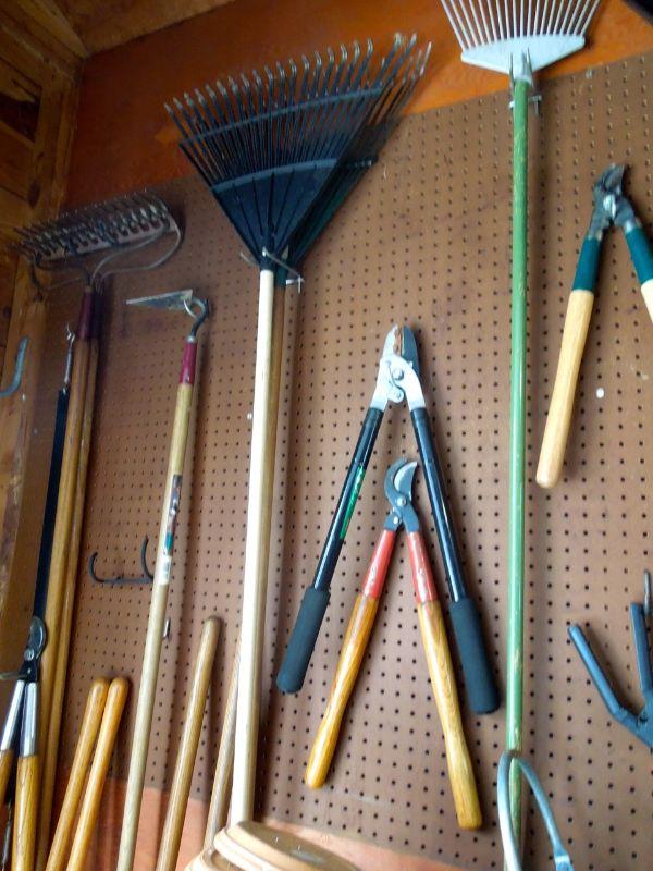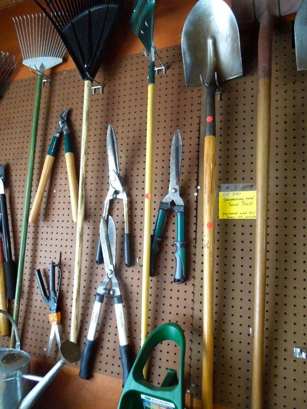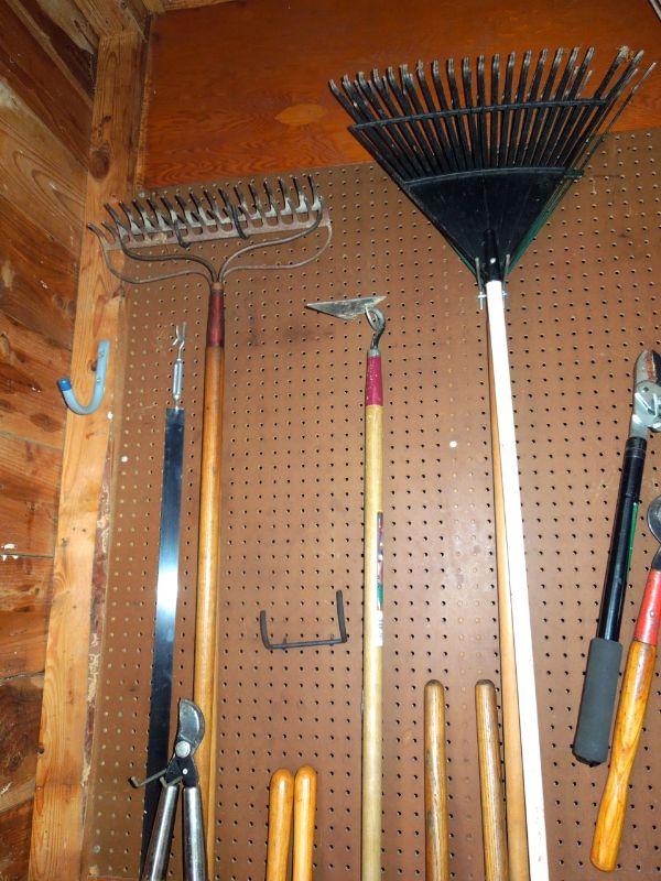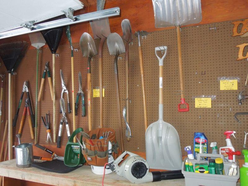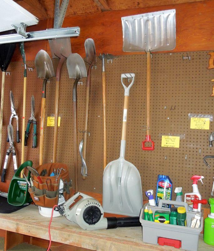 Two snow shovels, a Craftsman power blower with vacuum attachment and bag, several wood handled shovels, a hoe, gardening pruners and shears, gardening chemicals, a Bucket Boss tool holder, clay and plastic pots, rakes, post hole diggers and much more. Everything in photos except for peg board.
