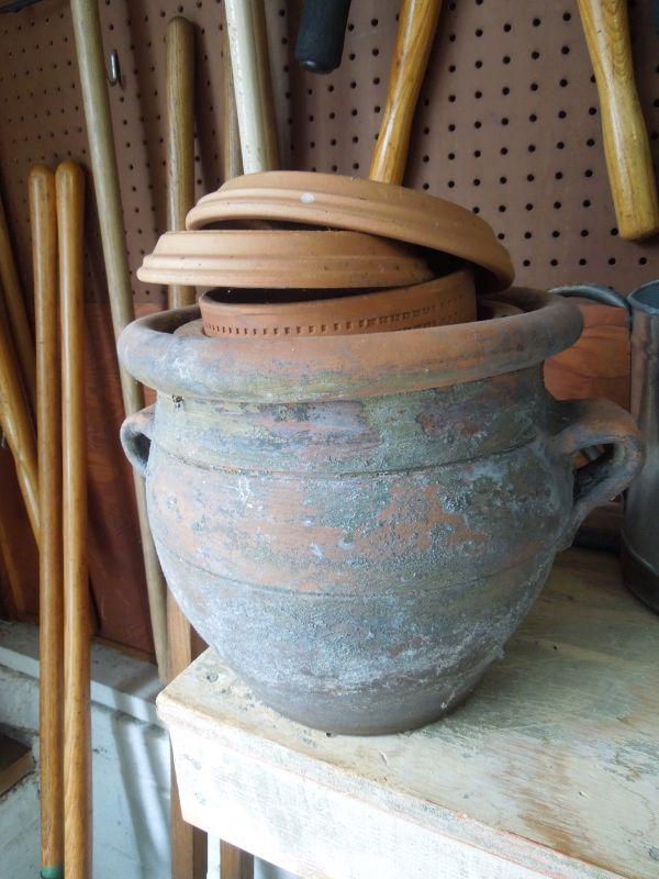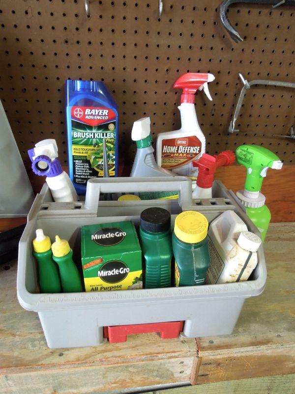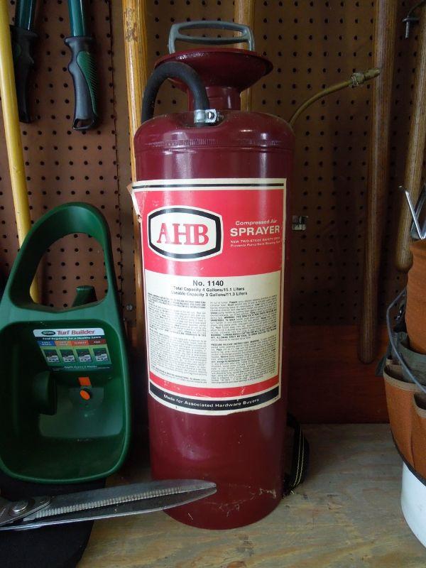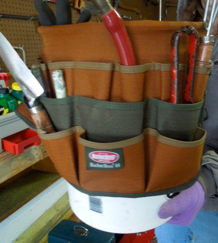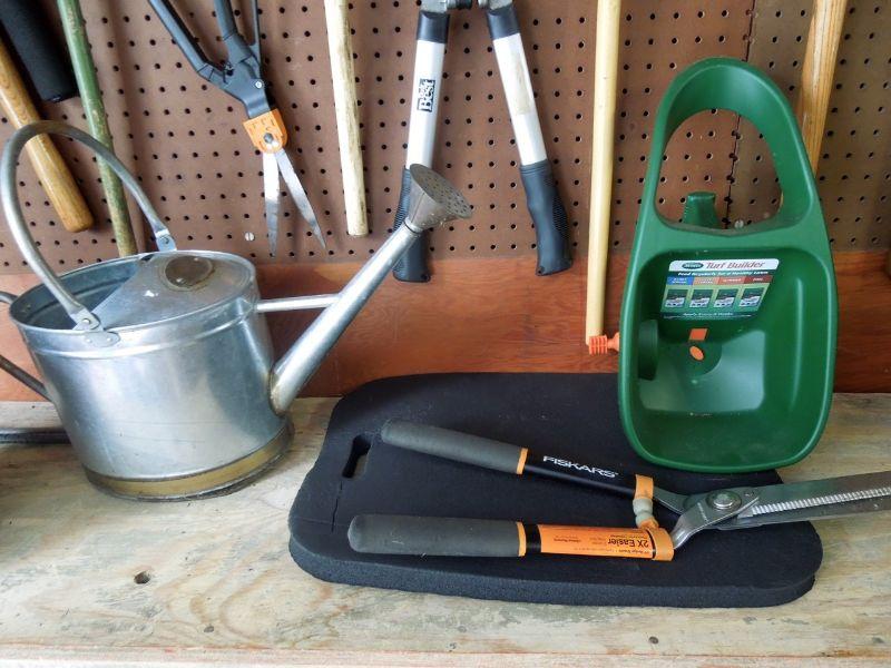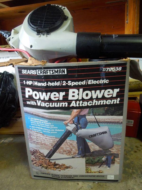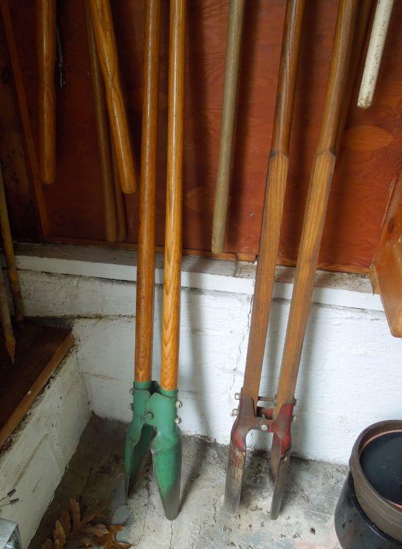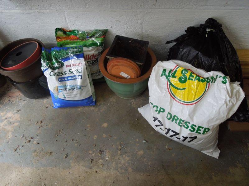 Two snow shovels, a Craftsman power blower with vacuum attachment and bag, several wood handled shovels, a hoe, gardening pruners and shears, gardening chemicals, a Bucket Boss tool holder, clay and plastic pots, rakes, post hole diggers and much more. Everything in photos except for peg board.