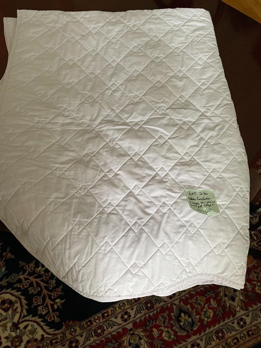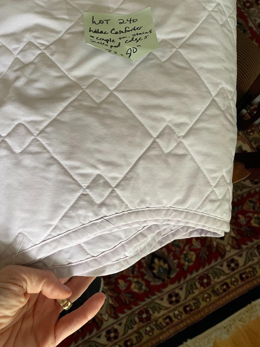 Lilac comforter with scalloped edges 72" x 80". There are a couple of smaller stains.