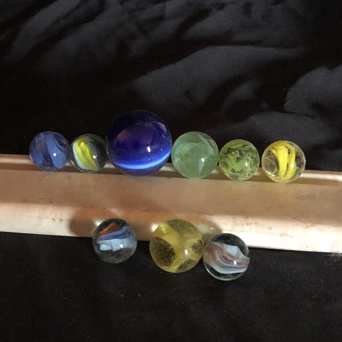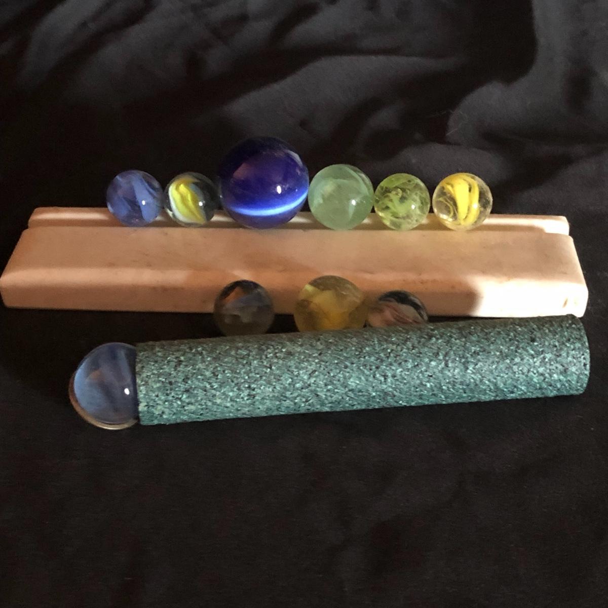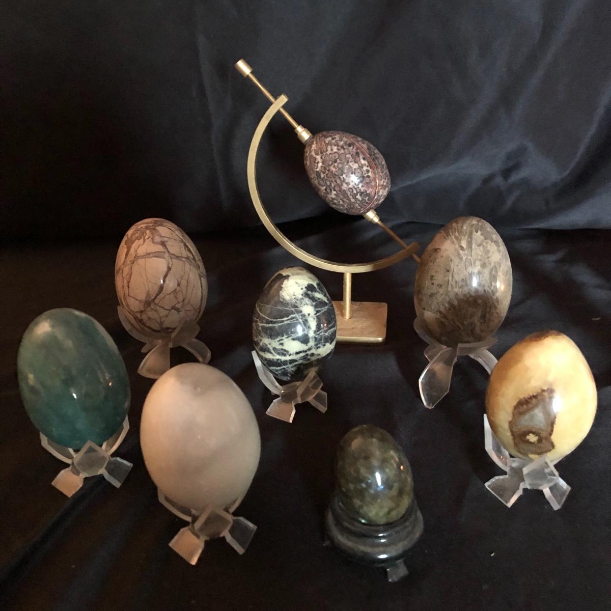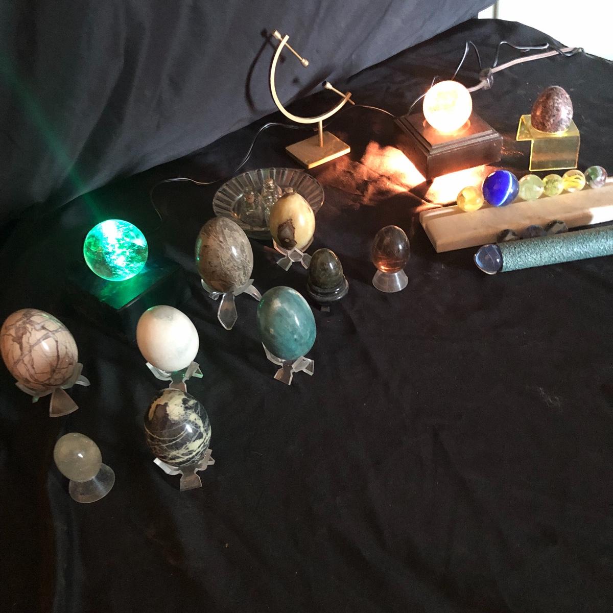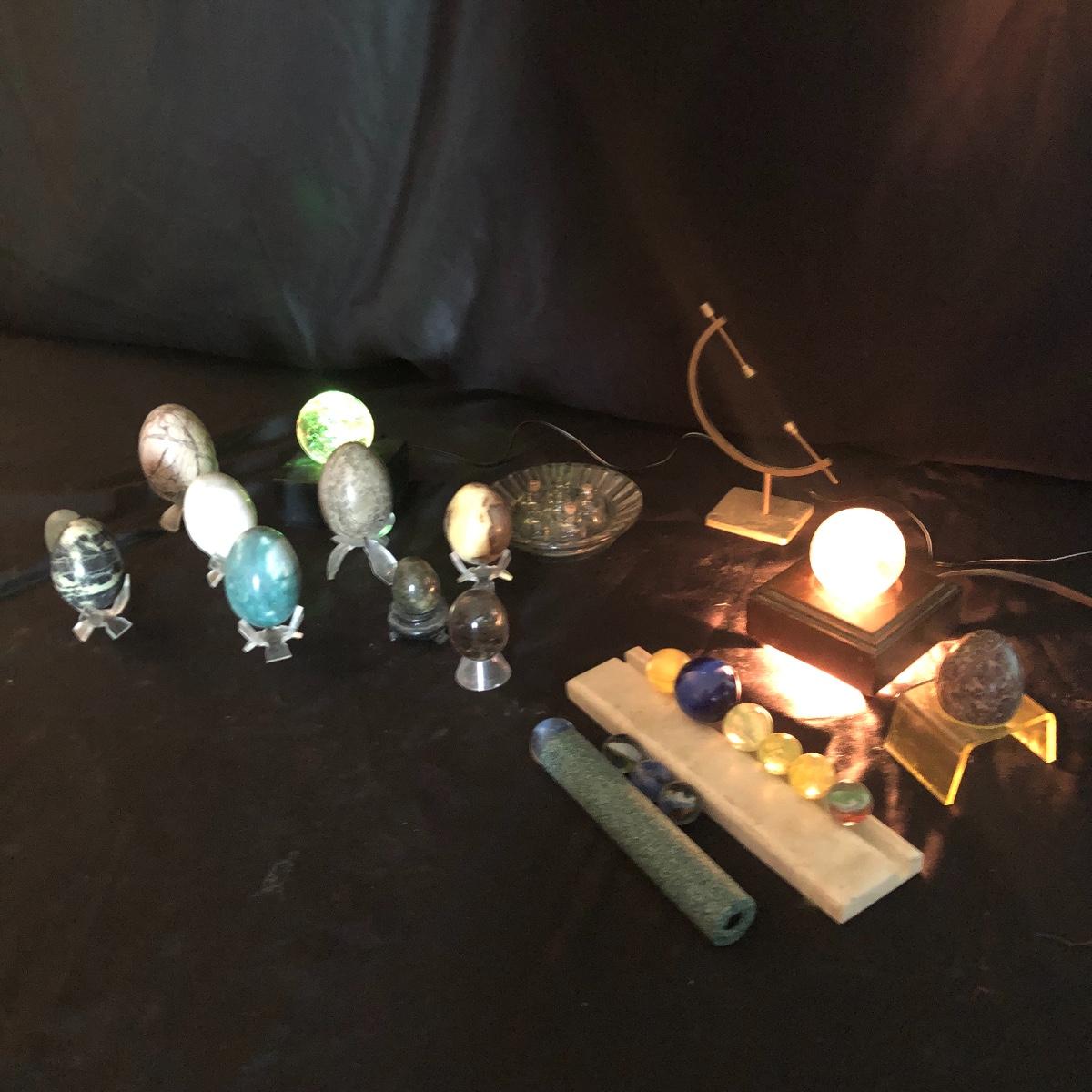 Enjoy the wonders of the Earth with this lot. There are seven marble eggs, two glass eggs, three lighted stands (one needs a new light bulb), two glass balls, a kaleidoscope with numerous marbles and more! Turn the marble on the end of the kaleidoscope and you see brilliant shapes and colors. Shipping Available.