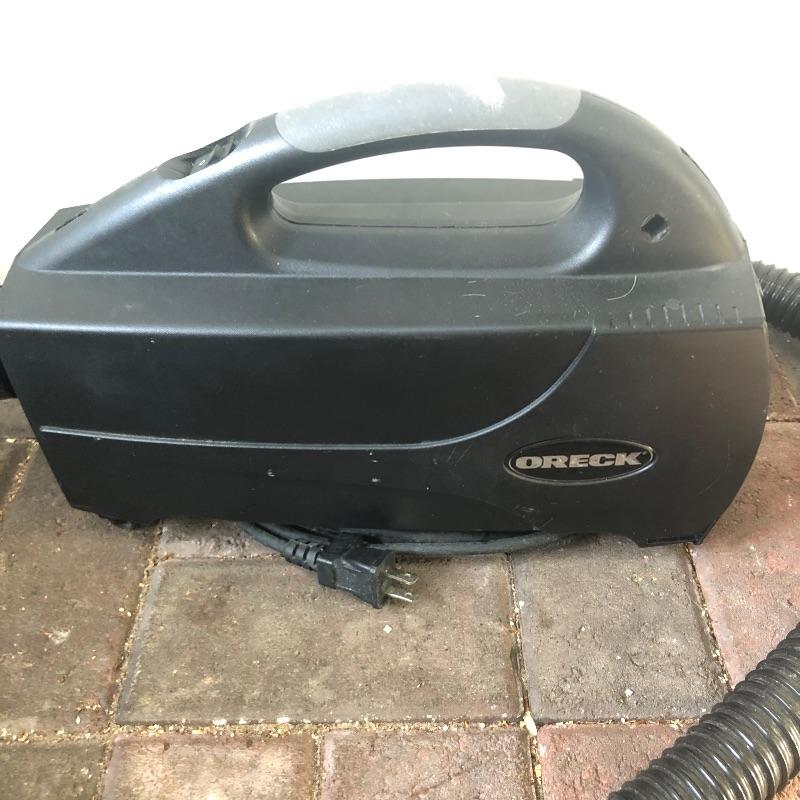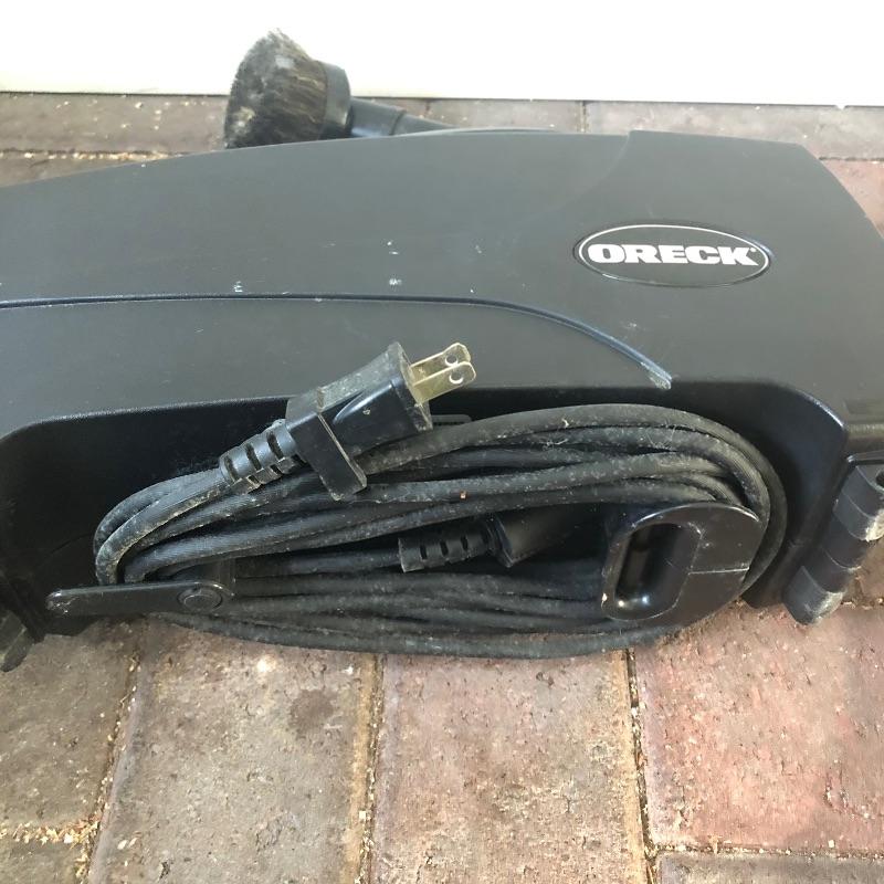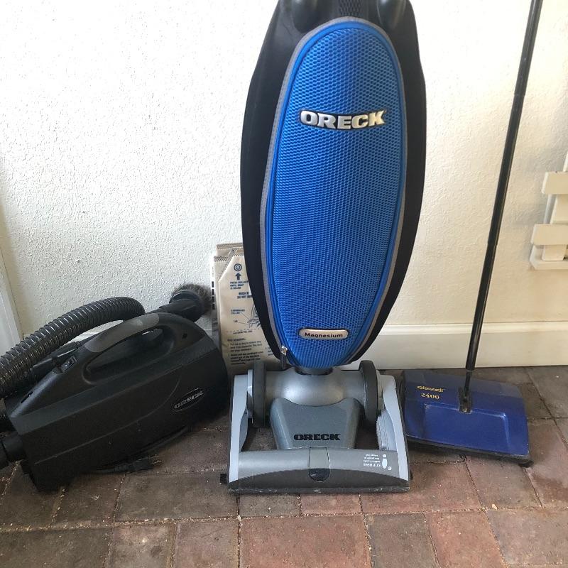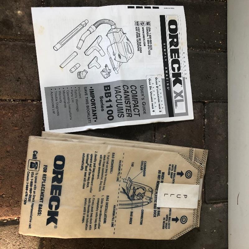 Very nice light weight Oreck upright bagged vacuum works when turned on and appears to be in very good condition with two extra bags. The Oreck XL BB 1100 Series compact canister vacuum is also light weight, works when plugged in and comes with instruction booklet. Only attachment is the one attached to the vacuum see photos. The light weight Bissell 2400 manual sweeper is in working order and is convenient for quick clean up. The upright Oreck measures 12" x 13" x 50". Local pickup only