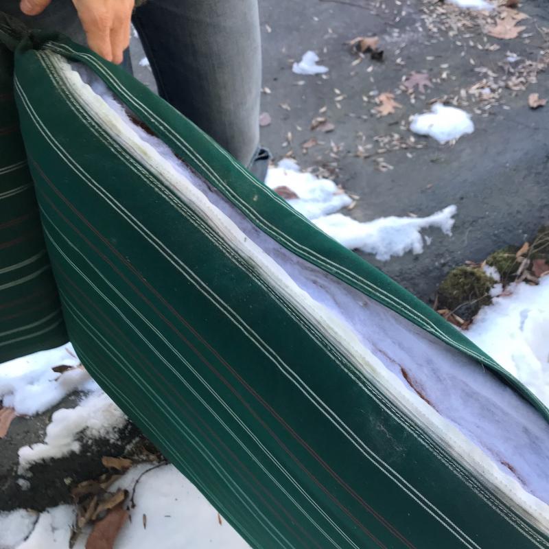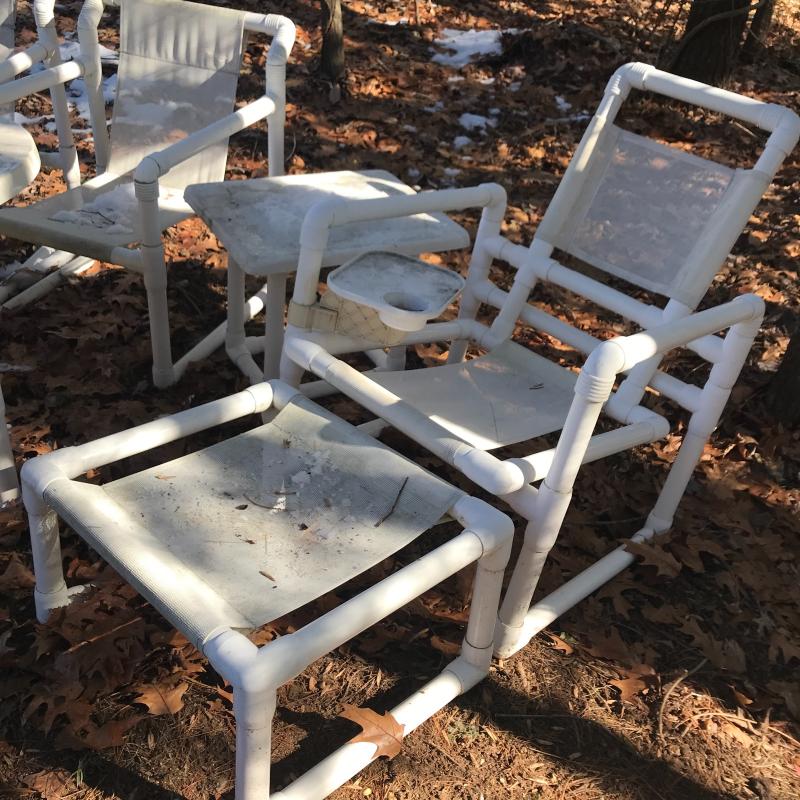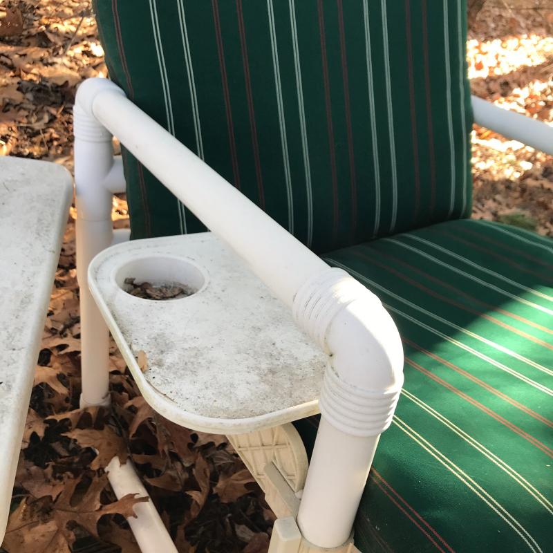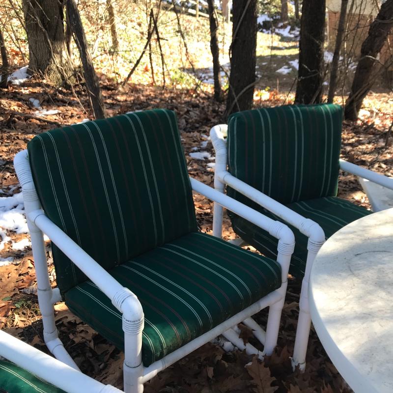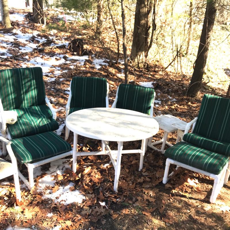 Lot includes 4 chairs (two also have ottomans), large round table and small side table. Made of PVC. Includes outdoor green striped cushions. One ripped zipper. Needs cleaning. Lounge chairs have swivel table attached. No shipping. Local pick up in Asheville, NC only.