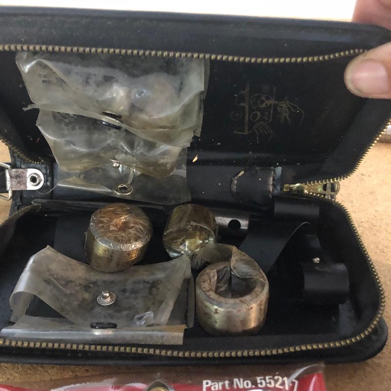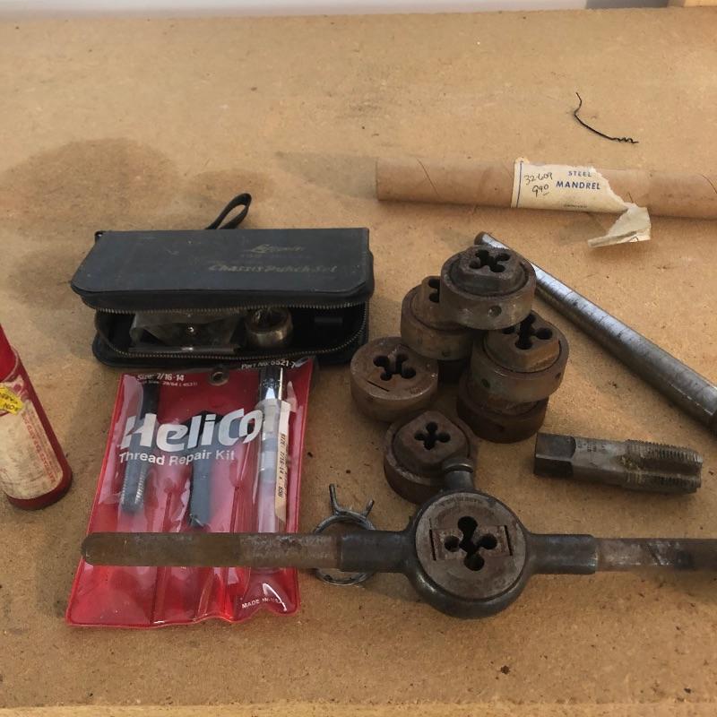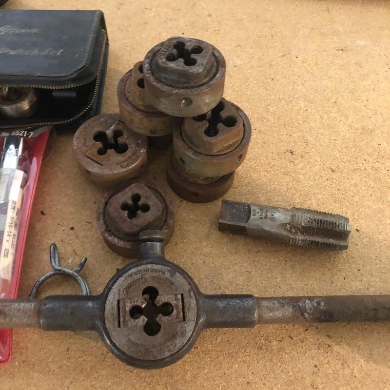 This is a nice heavy duty tap and die set. What you see is what you get, so please look closely at the images. Also included is a vintage steel mandrel with its original tube, as is the taper pipe. The vintage chassis punch set in a black case may not be complete so again, see images