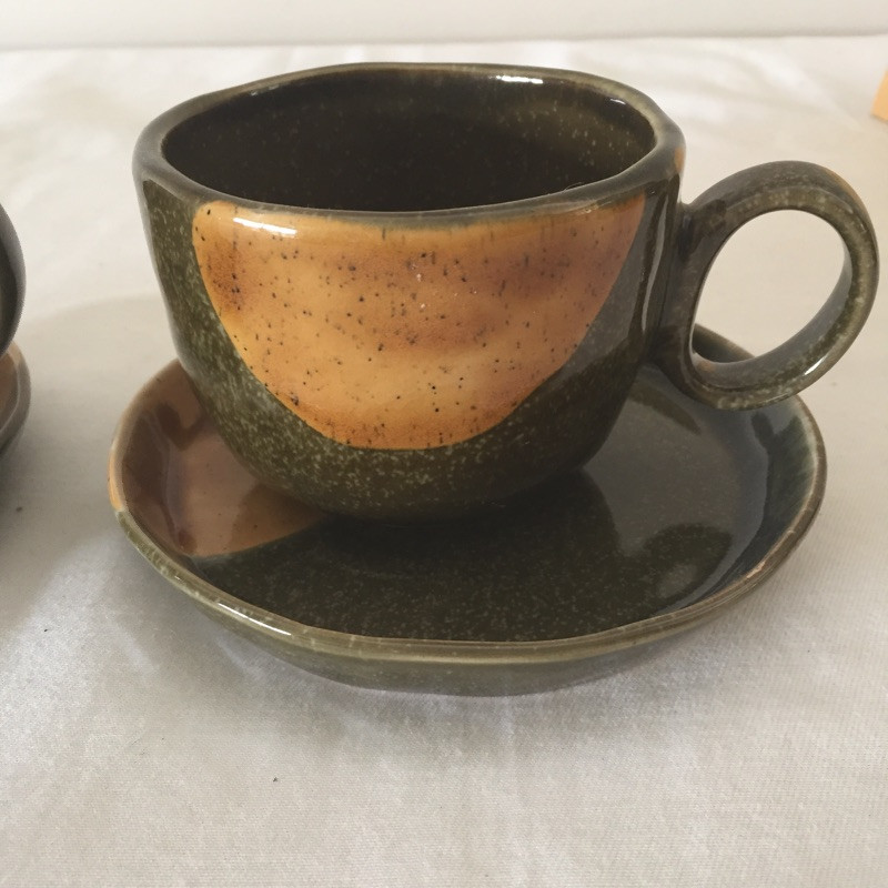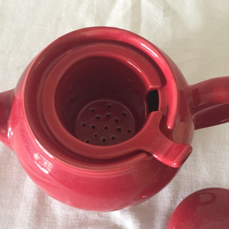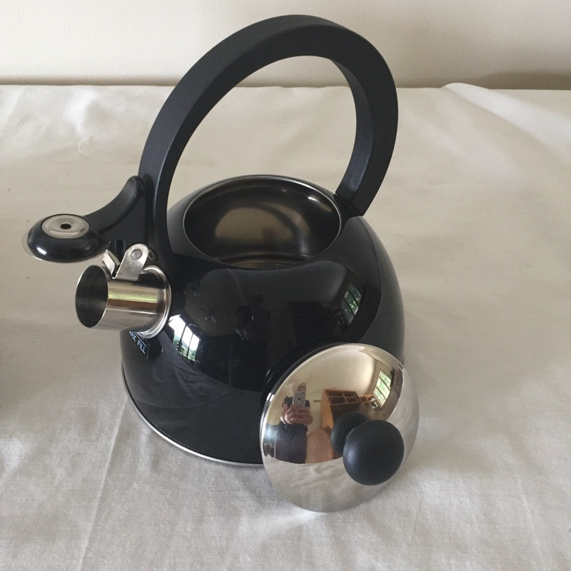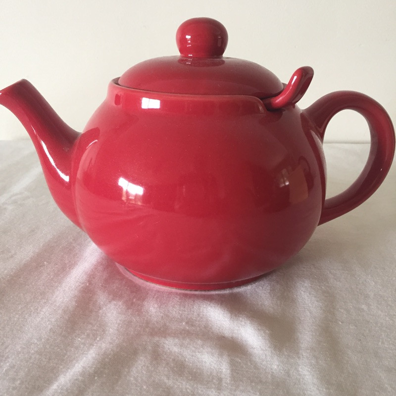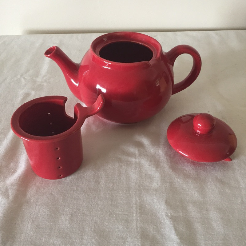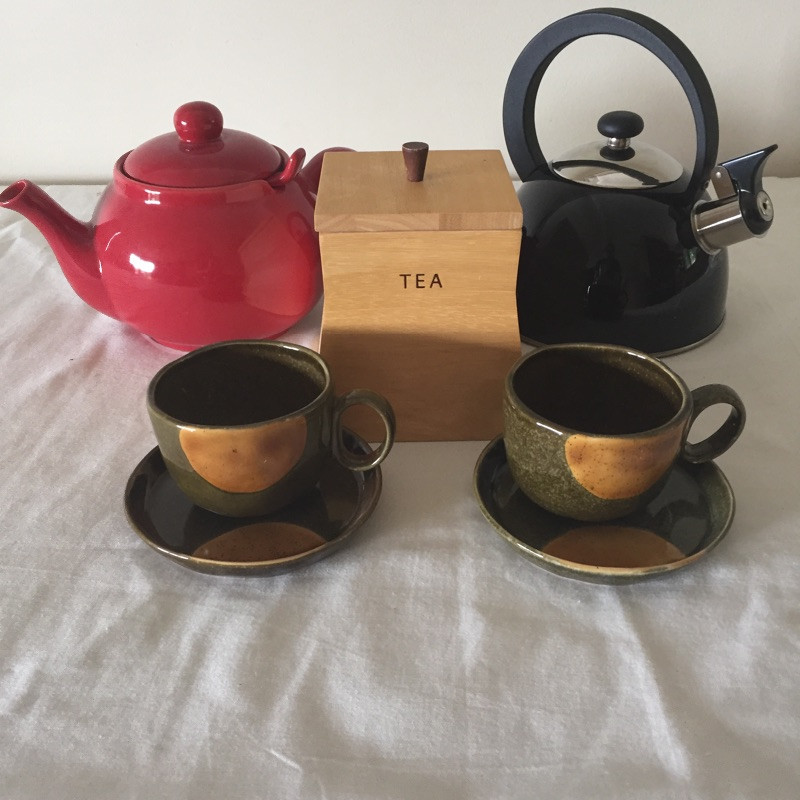 Sit back and enjoy a nice brew with this tea for two collection. Included is a stove-top whistling kettle that is black and chrome, a nice red ceramic teapot with inner tea-leaf strainer, two matching ceramic cups and saucers and a wooden tea caddy.