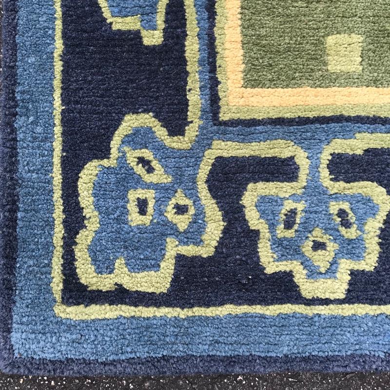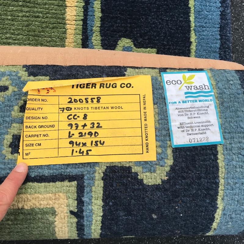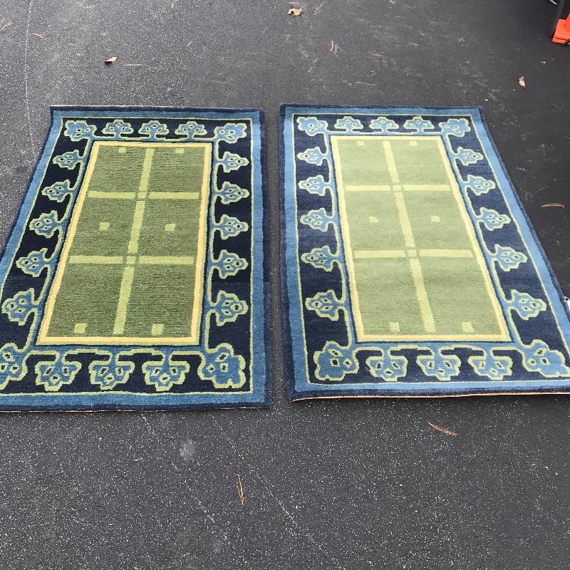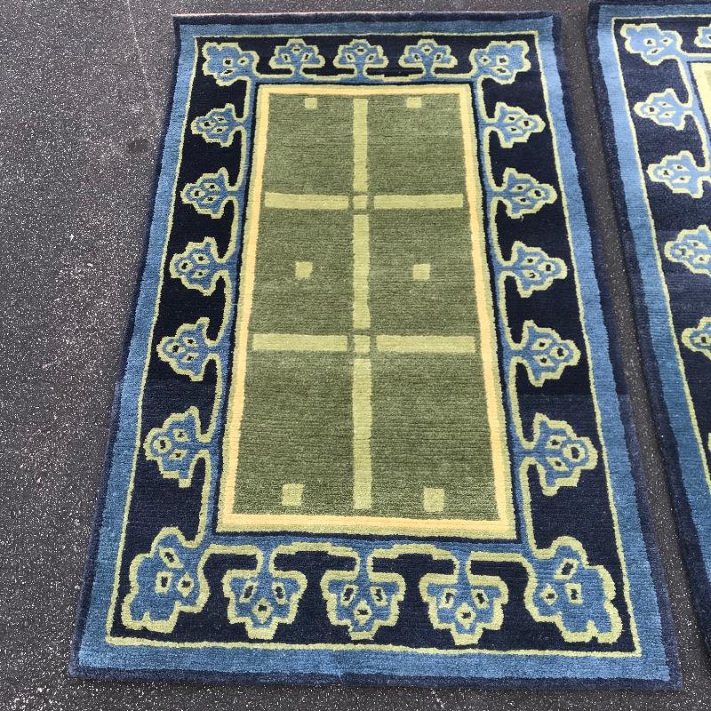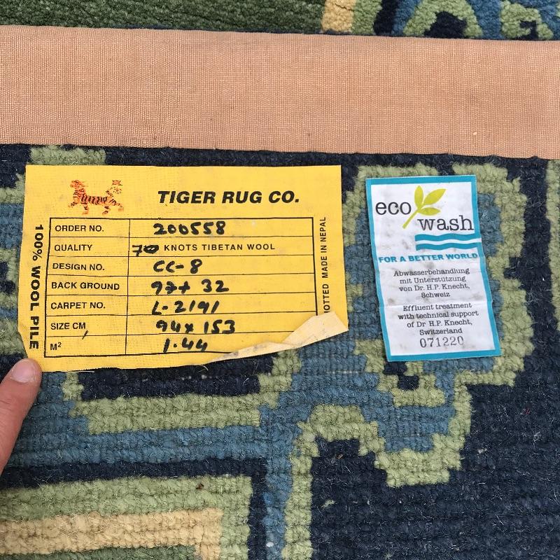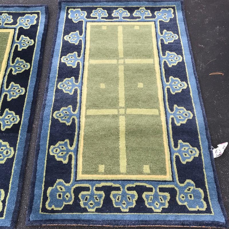 Two identical, bold navy and olive colored wool rugs by Tiger Rug Co. Manufacturer tags state rugs are hand knotted in Nepal and 100% Wool Pile. Each rug is in great shape and measures 36” x 59”. See photos.