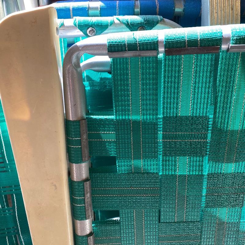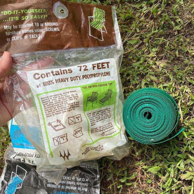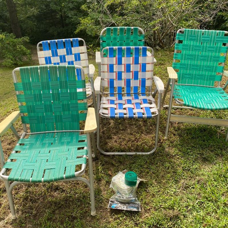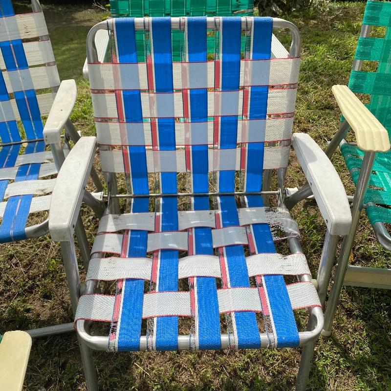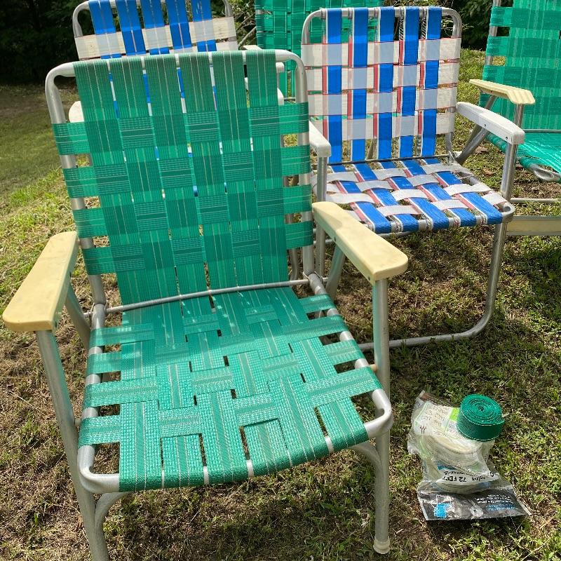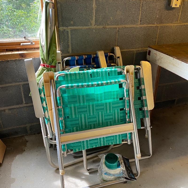 Take these five chairs and umbrella to the beach or your backyard. Some of the chairs need to be re-woven but don’t fret, we’ve included the material with this lot. Two unopened matching bags and one extra green roll! The chairs open and close without a problem. The umbrella is old school and made of a thick vinyl. The mechanism may need a little tweaking to hold it open but should be fixable. No shipping.