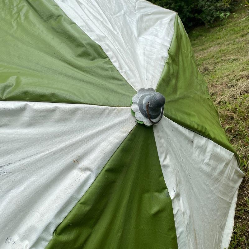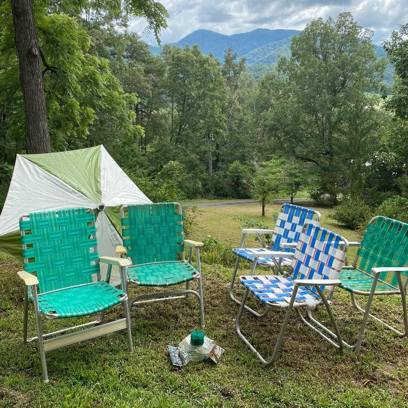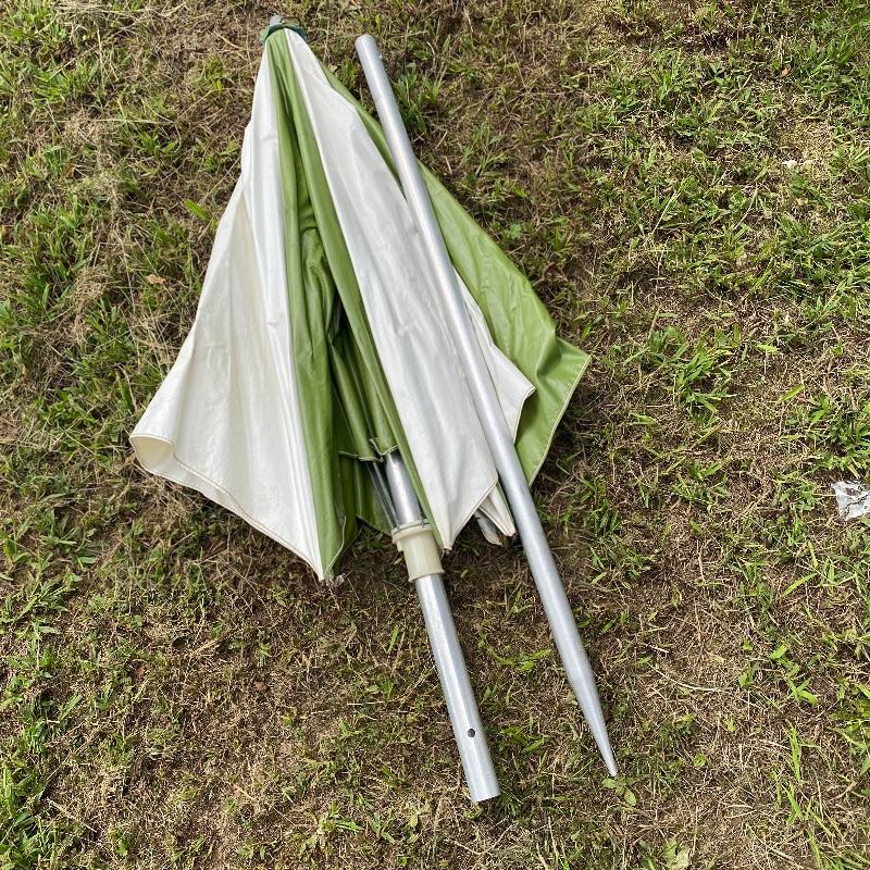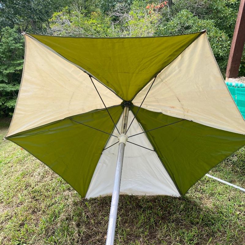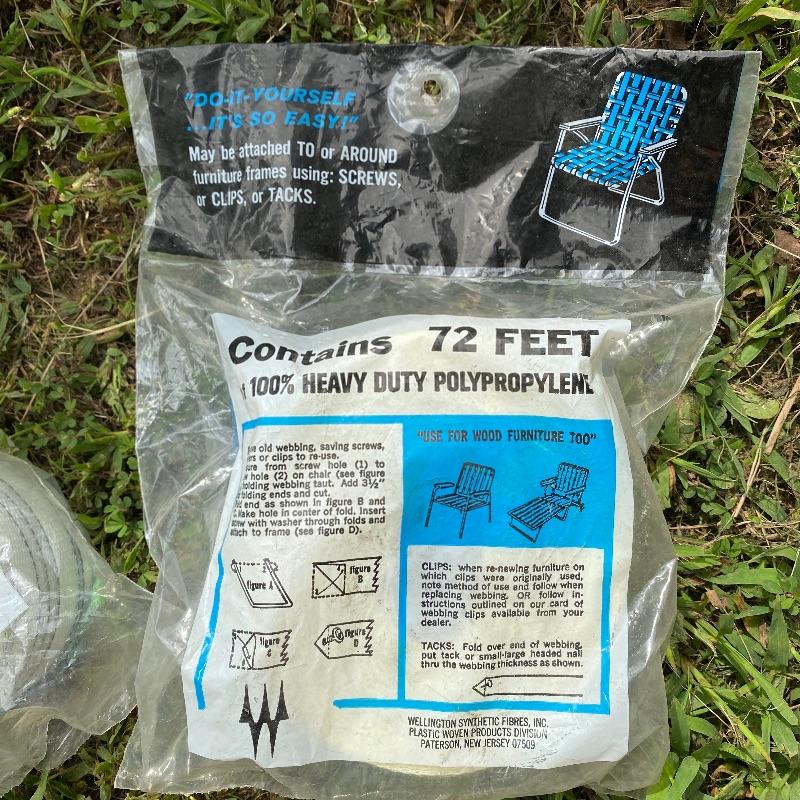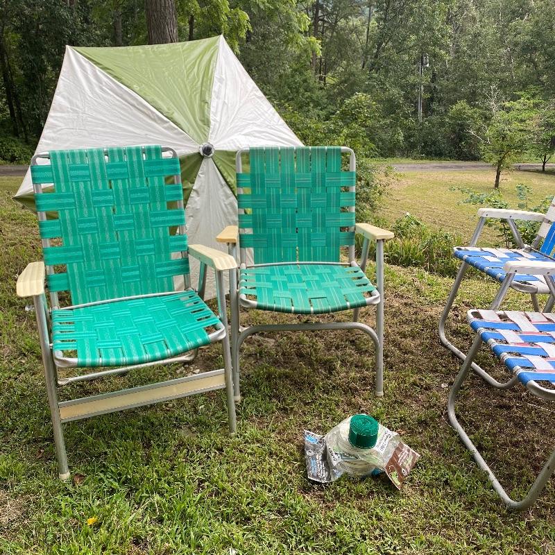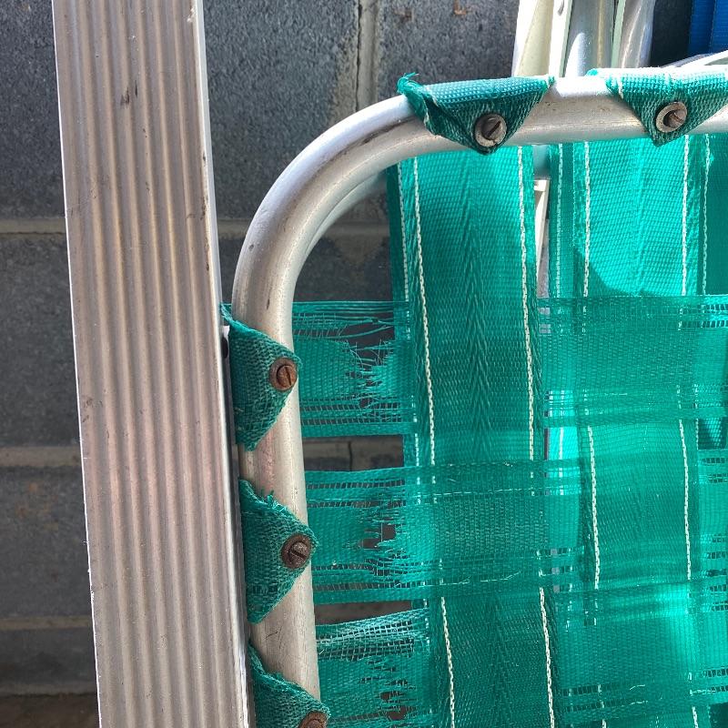 Take these five chairs and umbrella to the beach or your backyard. Some of the chairs need to be re-woven but don’t fret, we’ve included the material with this lot. Two unopened matching bags and one extra green roll! The chairs open and close without a problem. The umbrella is old school and made of a thick vinyl. The mechanism may need a little tweaking to hold it open but should be fixable. No shipping.