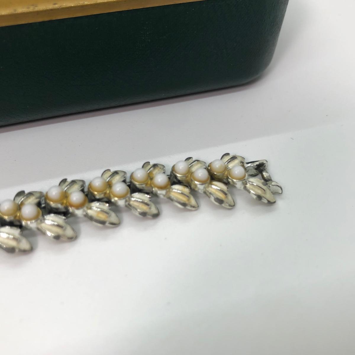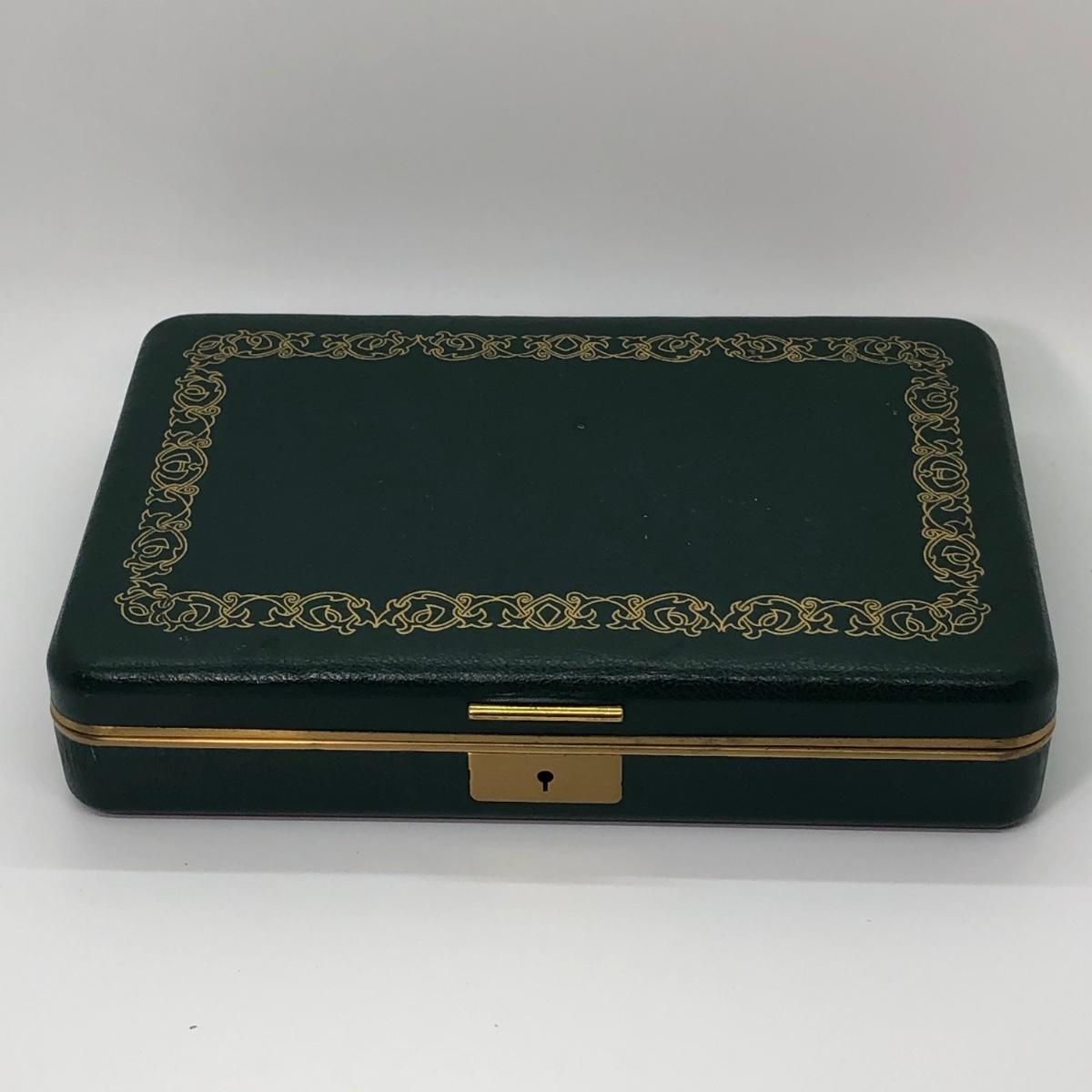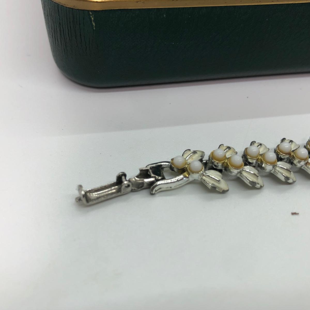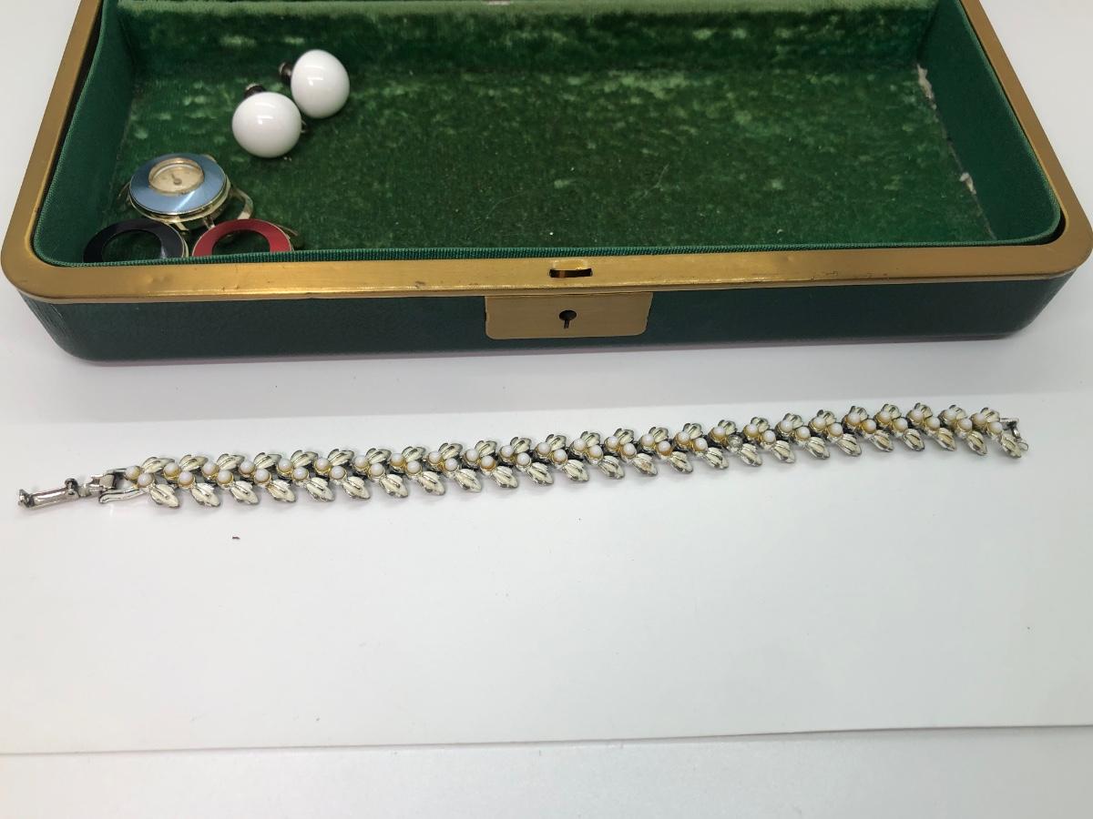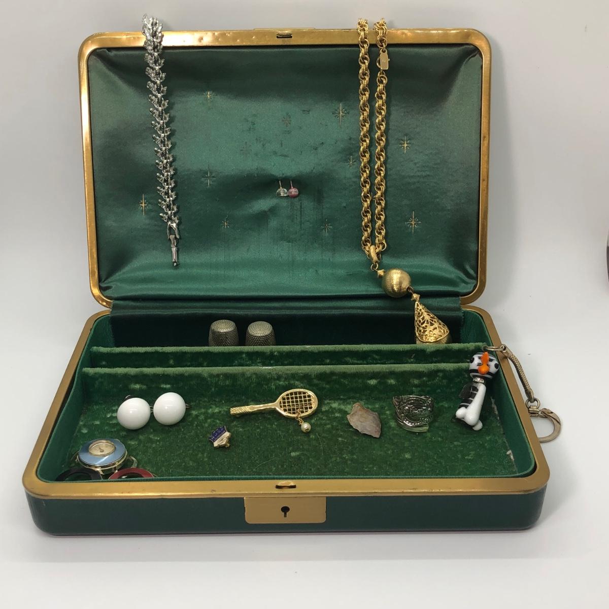 LOT 240M: Vintage Green Jewelry Box w/ Monet Necklace, Coro Bracelet, Avon Tennis Pin, Timex Watch Faces & More