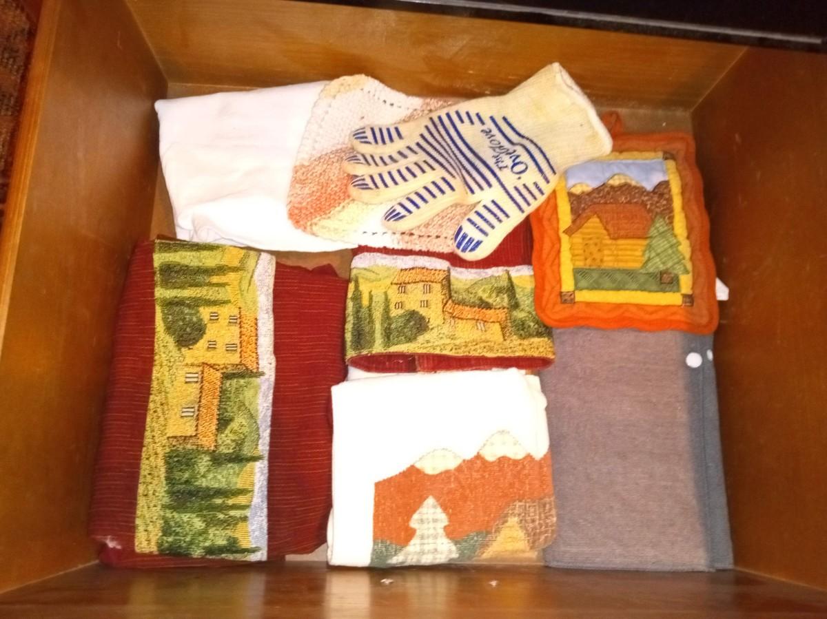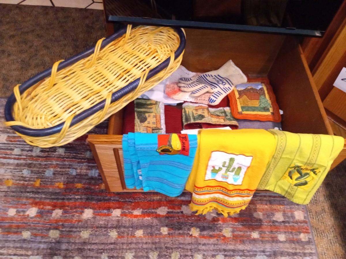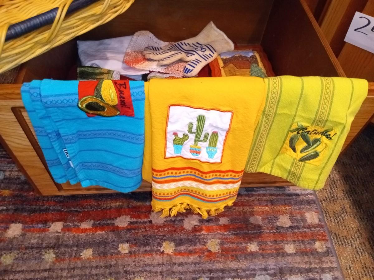 LOT 241 DISH TOWELS, APRON, OVEN MITT, HOT PAD AND WICKER BASKET