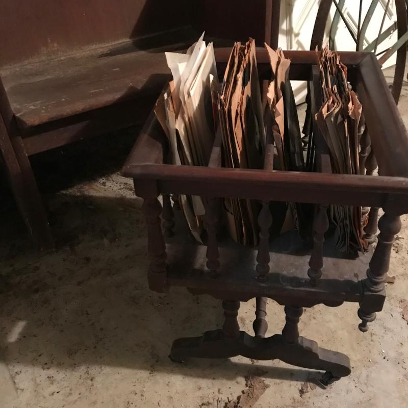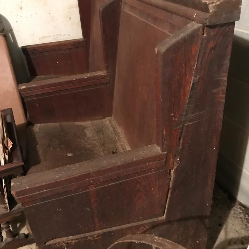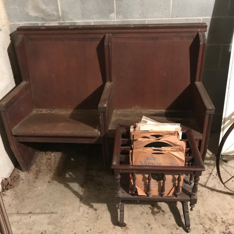 This antique lot includes an antique bench or pew(53”x 24” x 39.5”h) that seats two. Crack on side. See pix. Also includes a record or magazine stand(18” x 15” x 20”) that is full of old 78 records. No shipping. Local pick up only. Please bring help to load