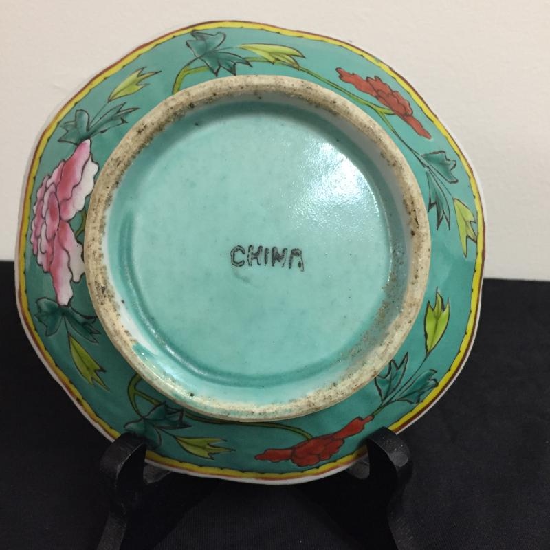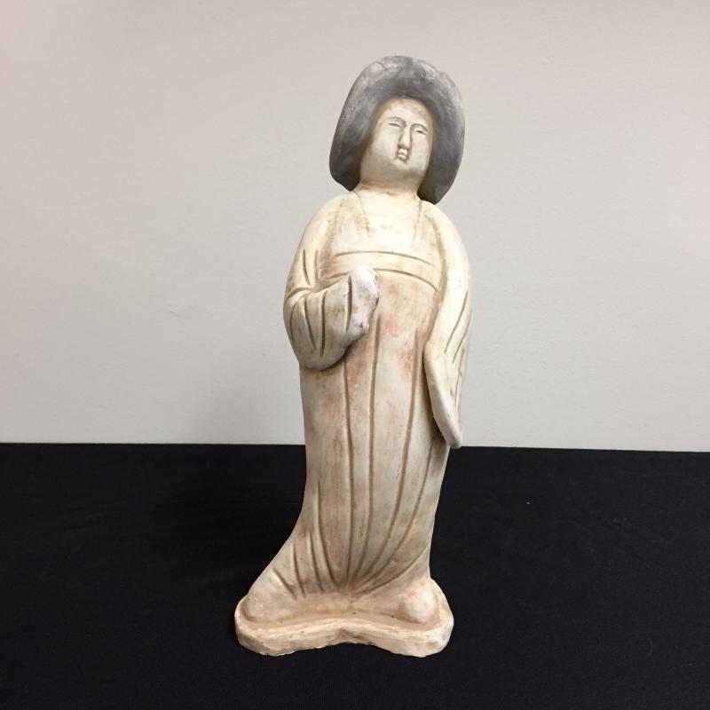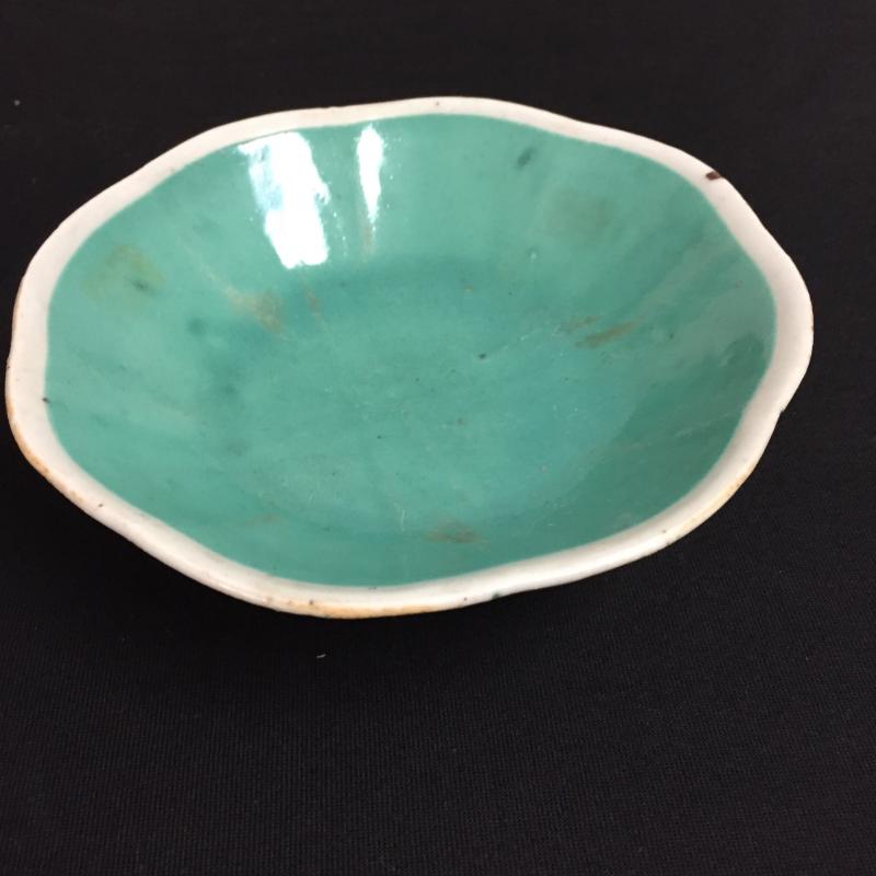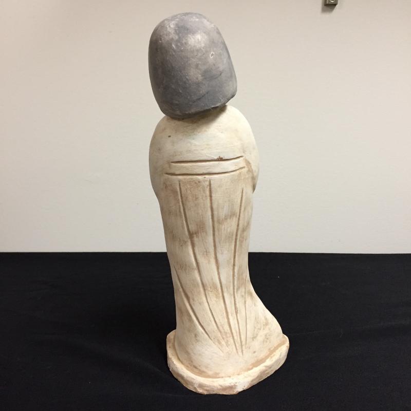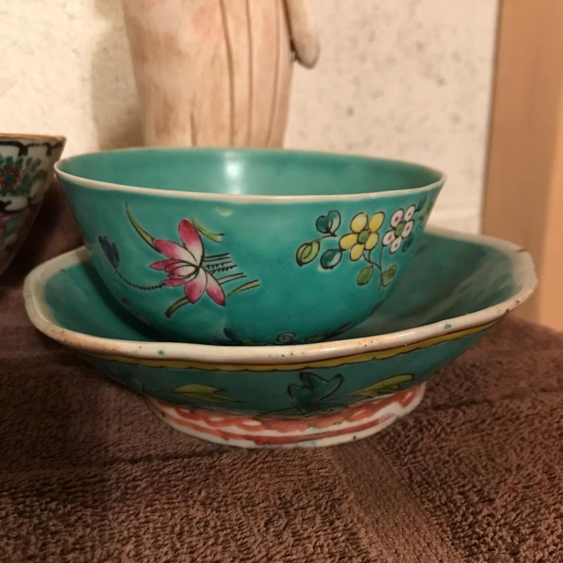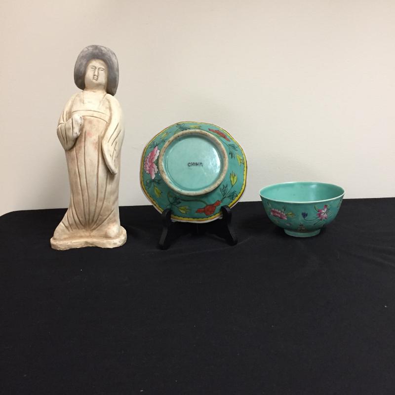 Two Graceful Green Asian Bowls. One is deeper than the other. Lot also includes a clay statue of a woman that measures 11” Tall. Shipping Available