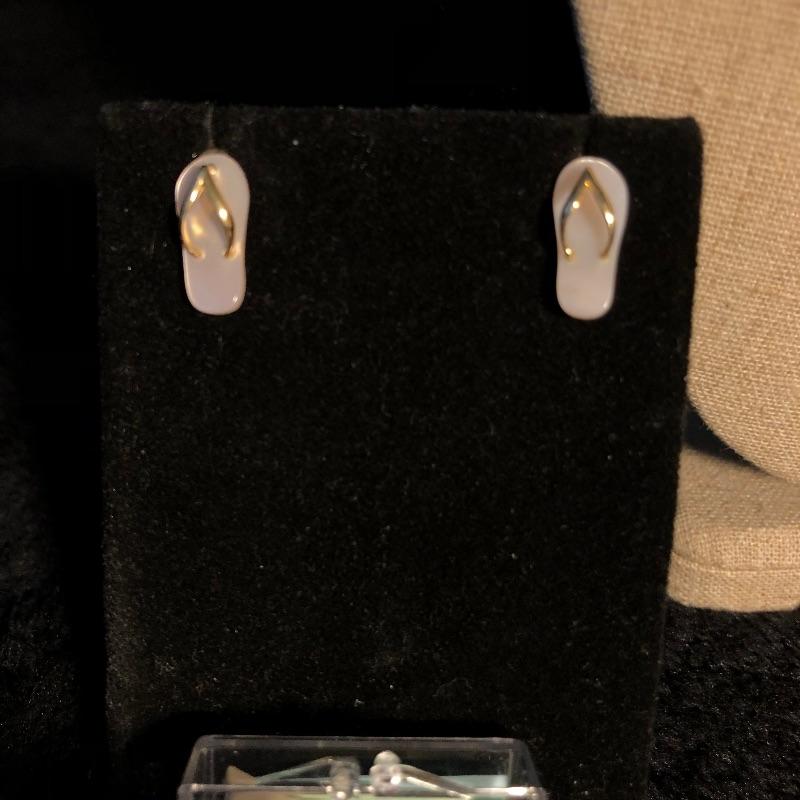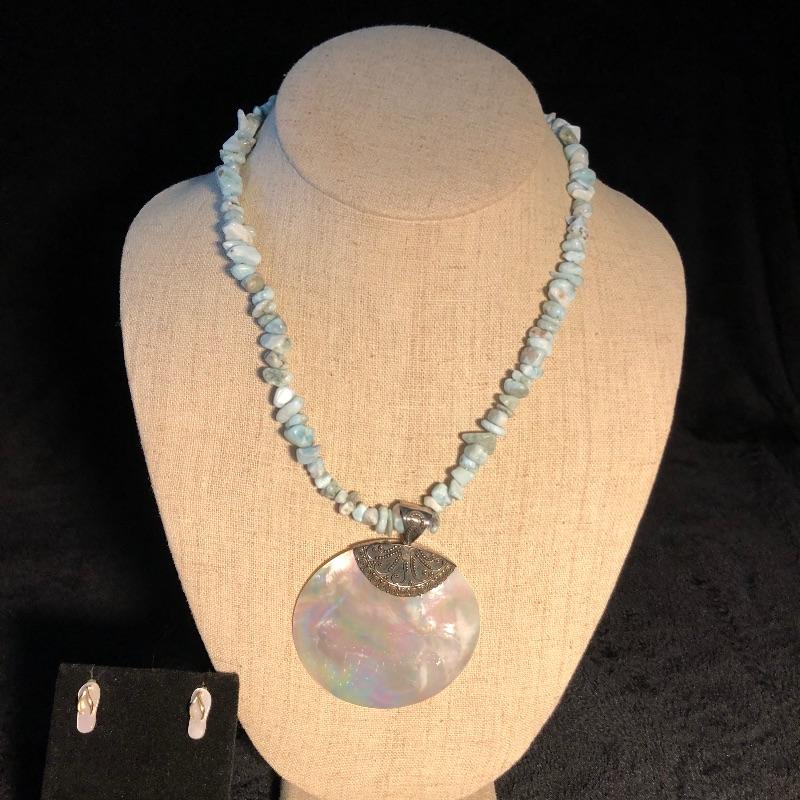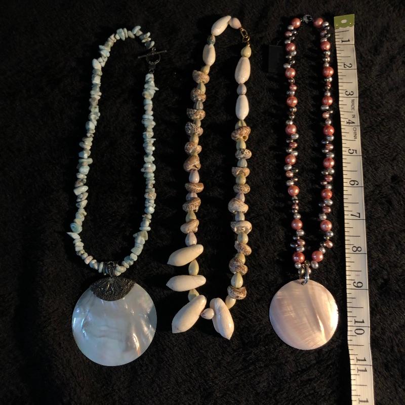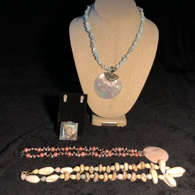 Ready for summer! This assortment of beach inspired jewelry will be sure to put you in the mood. Three beaded necklaces, a pair of earrings shaped like thong sandals and a sharks tooth necklace complete this fun lot