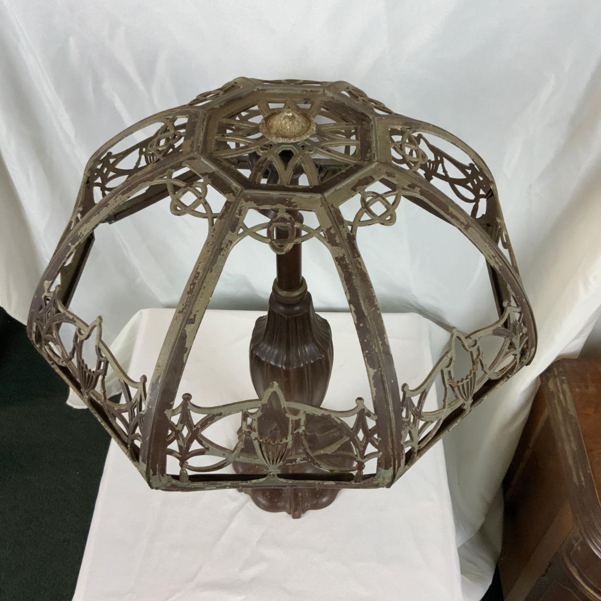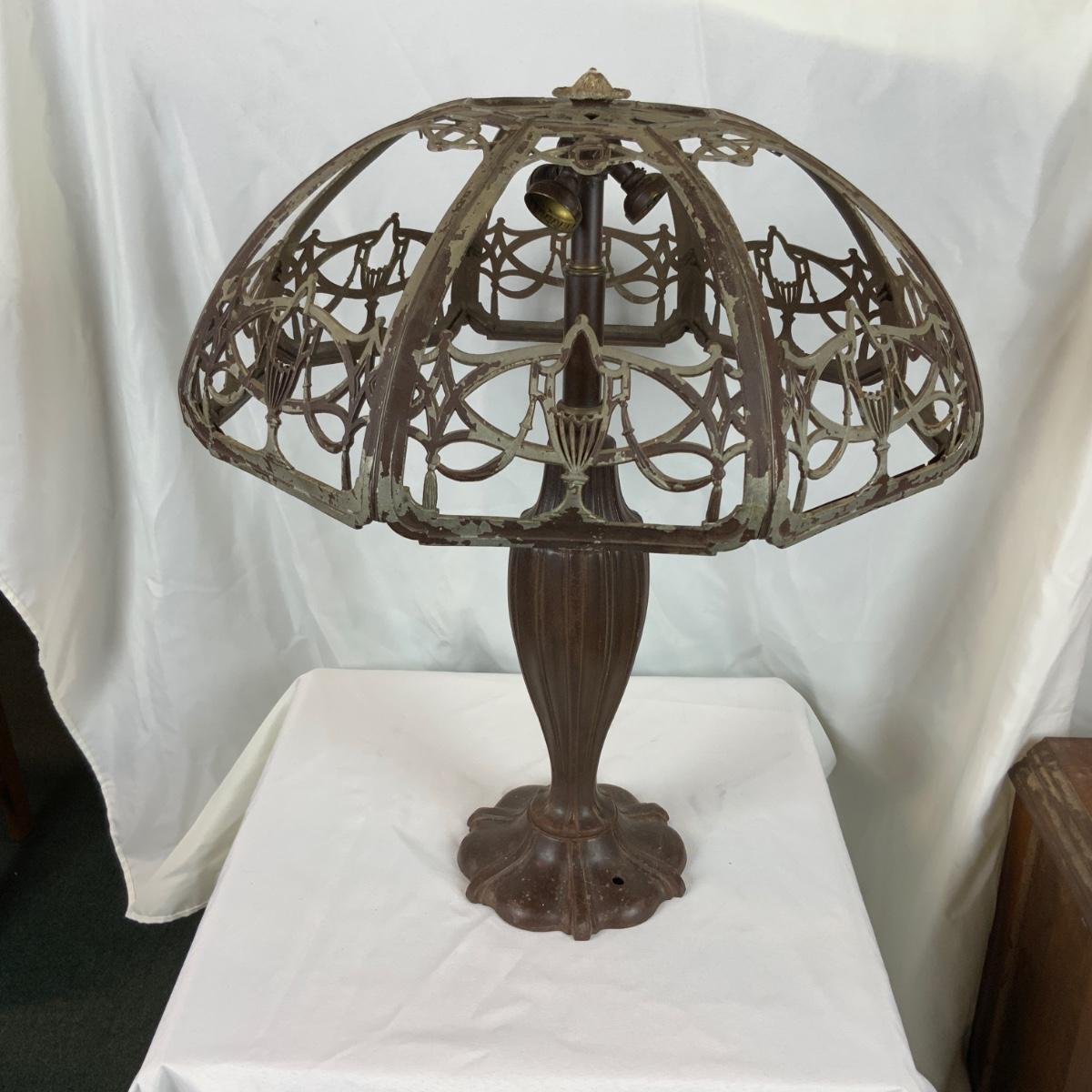 Bradley & Hubbard Lamp With Shade Frame. This is an incredible piece and you should snap it up needs either Glass or fabric to complete the shade also needs to be rewired. //::\\ Please see photos for details and condition. No attempt has been made to hide any imperfections. All items listed in this auction are warehouse items, and need to be cleaned. A majority of the items need restoration as well. All items are sold AS IS and WITHOUT GUARANTEE. If you are uncertain about an item, DO NOT BID. Due to the nature of this online auction in-person inspection is HIGHLY recommended. All Sales are FINAL. Pick Up Times are FIRM. Please confirm with your own schedule that you can pick up in the scheduled times listed in the Terms and Conditions. Any questions please message the auctioneer. DO NOT Contact The Harp Gallery.