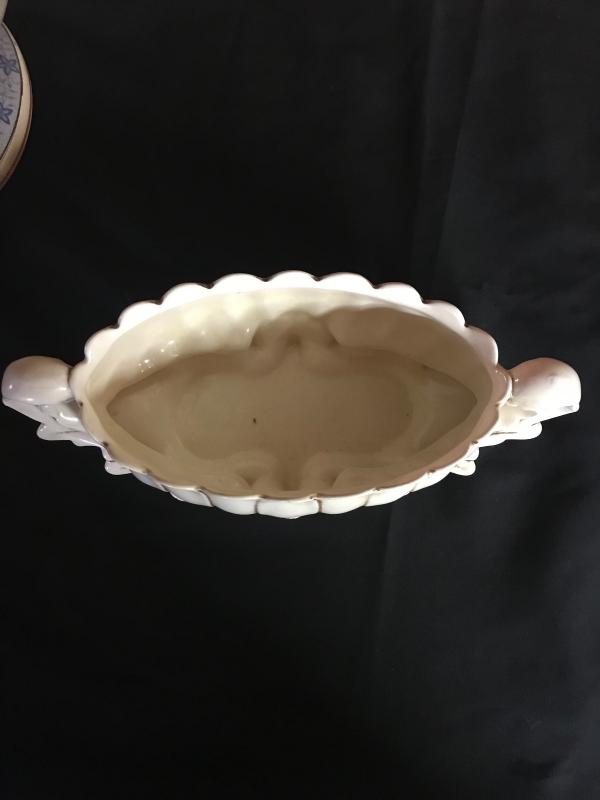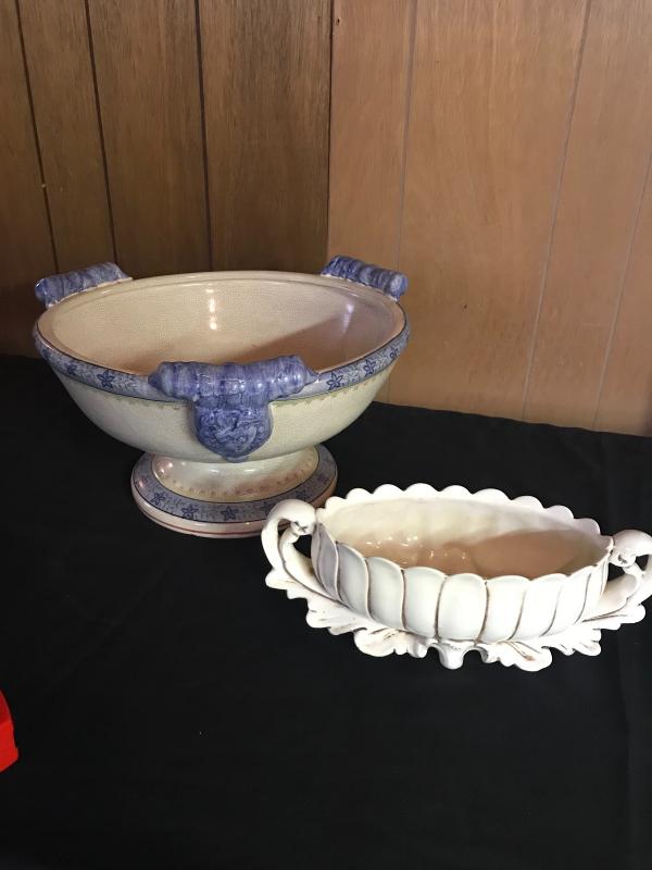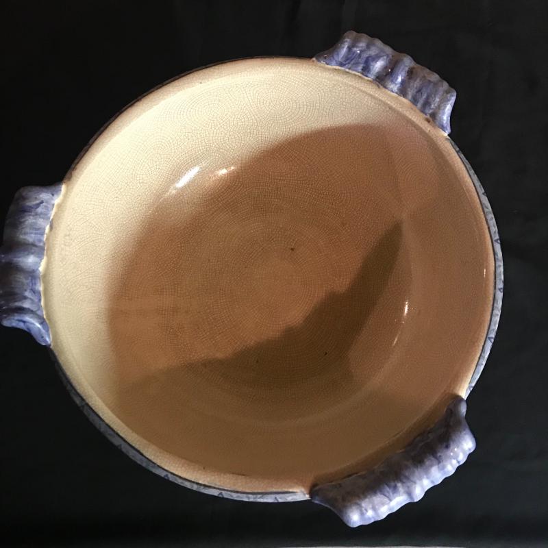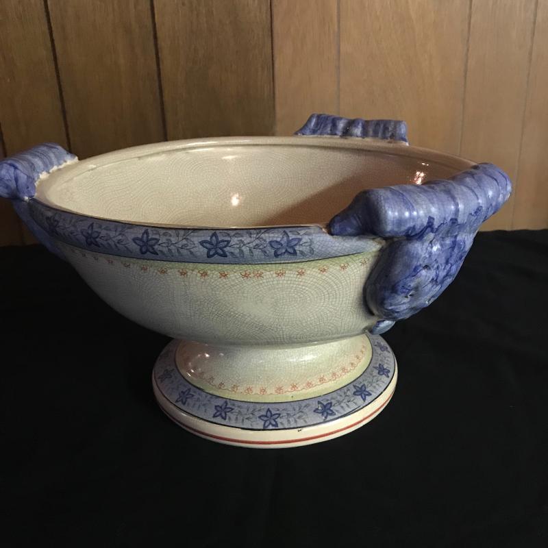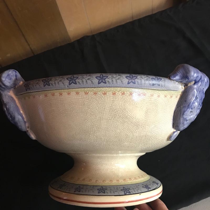Large pedestal bowl with a crackle glaze. Piece measures 15” diameter and 8” tall. Low bulb starter ceramic piece made in USA. Local pick up only.
