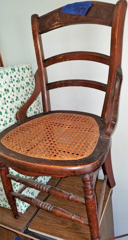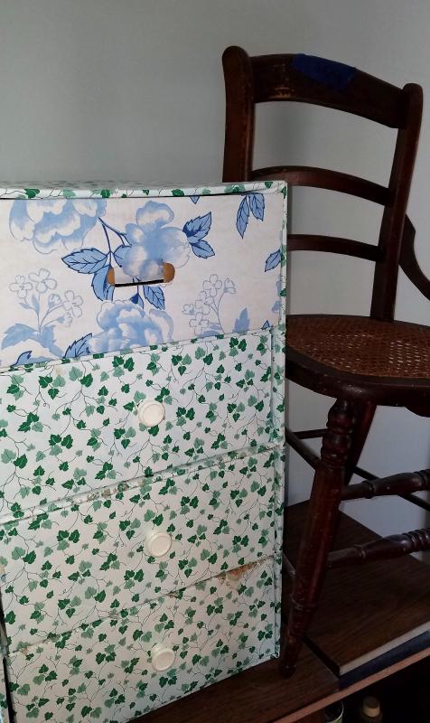 Ivy 4 drawer cardboard storage, brown wooden chair with woven seat.