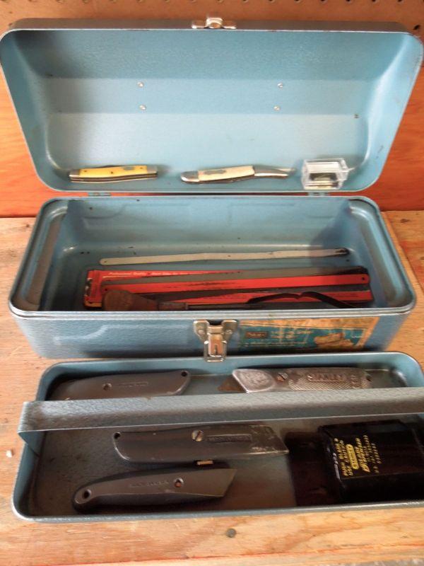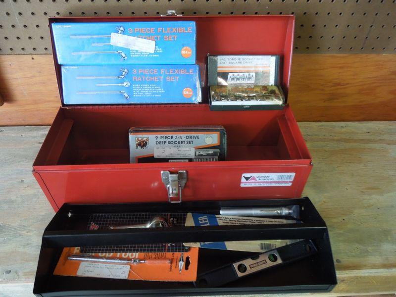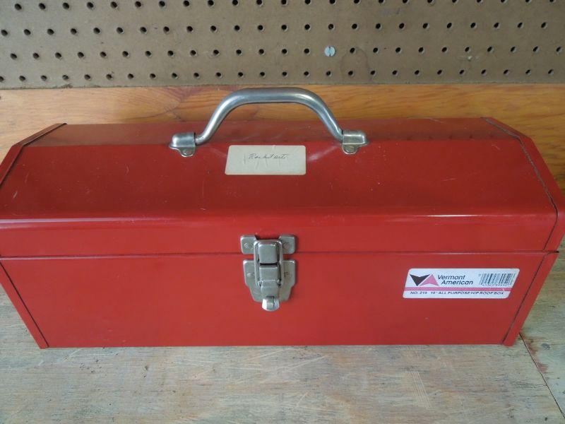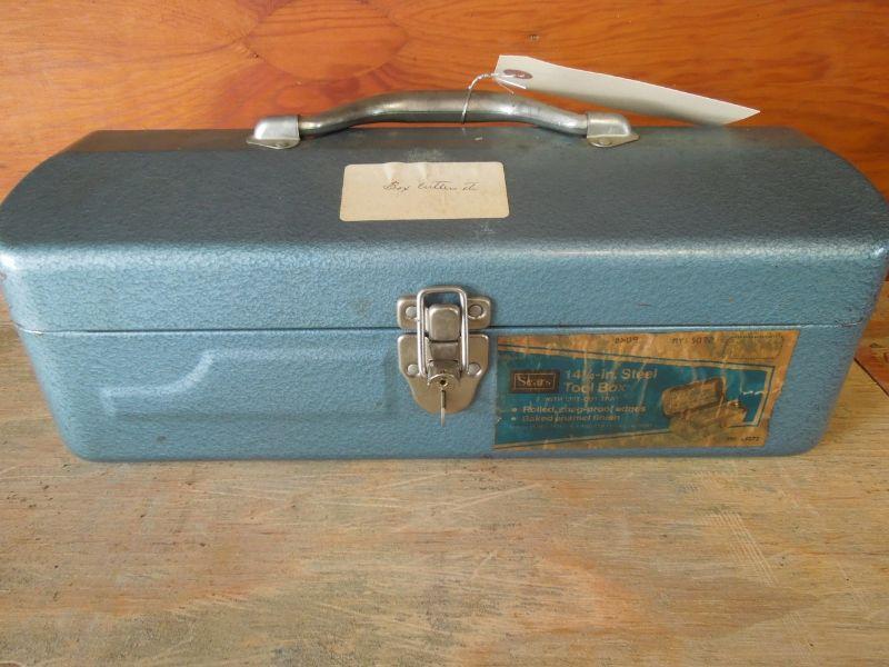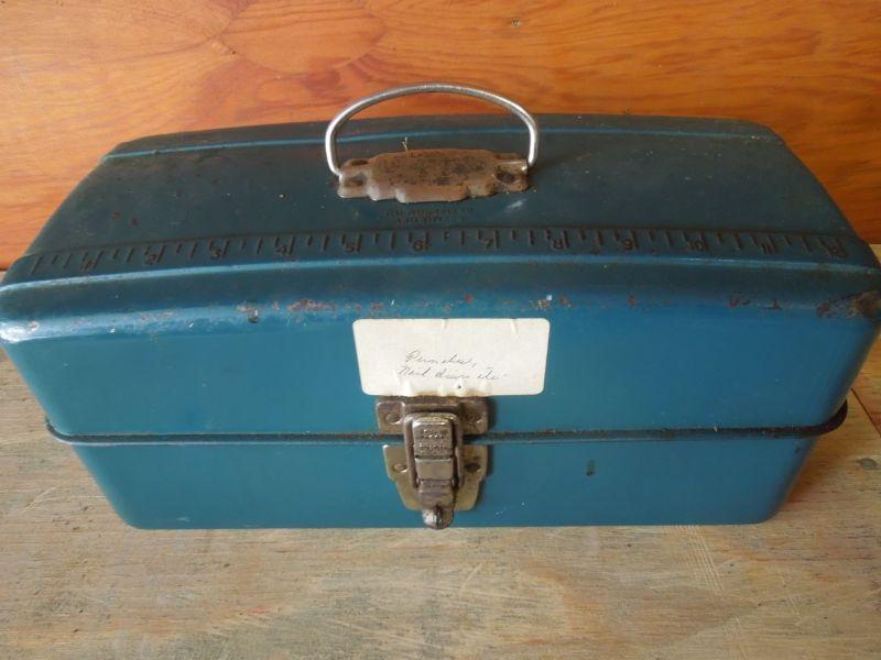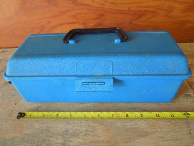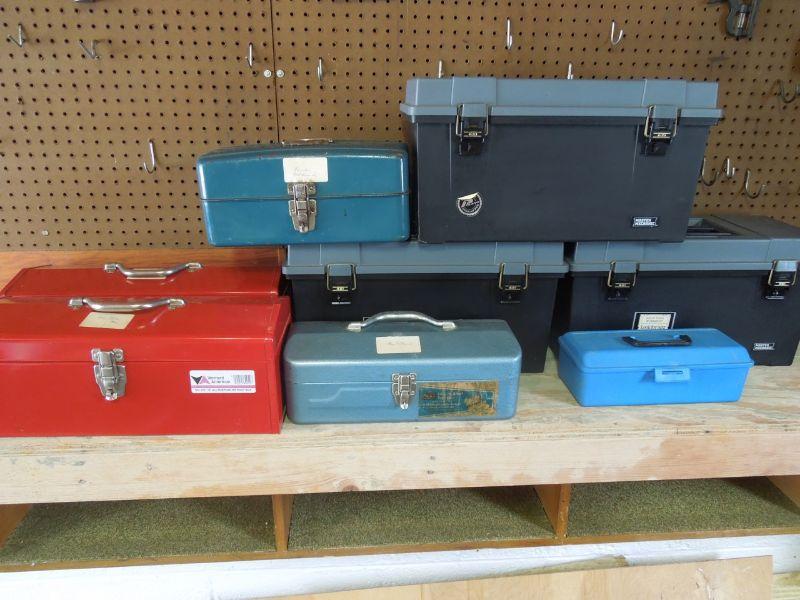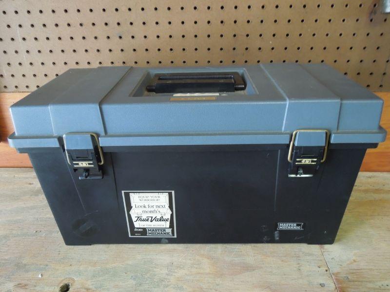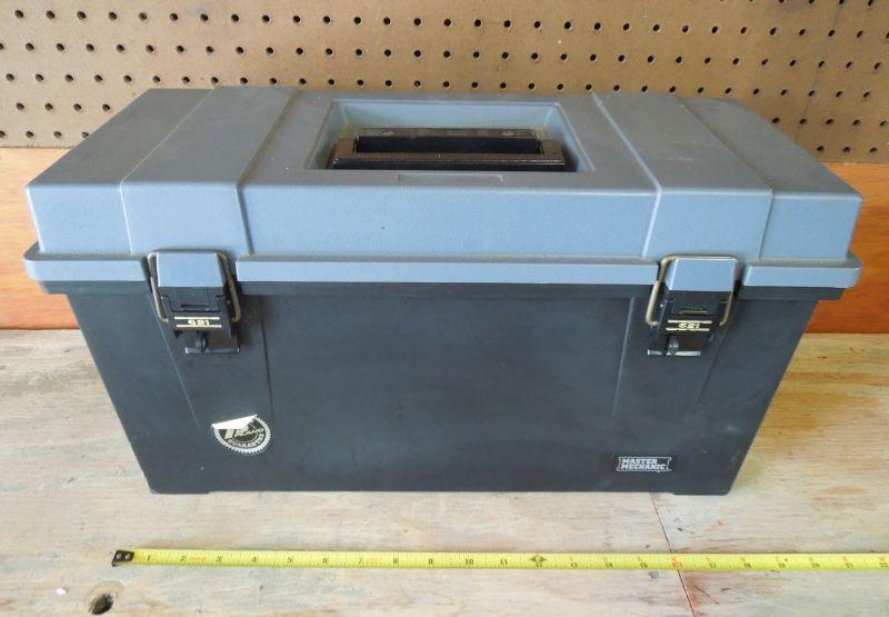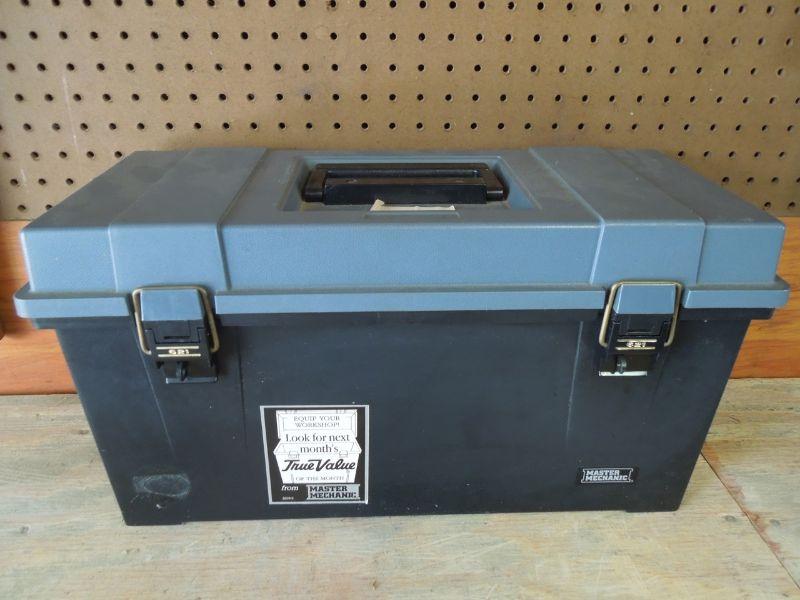 Vermont, Master Mechanic, two other blue metal tool boxes and a smaller plastic box. Largest is Black box 18.5" x 10.5" x 7.5" and smallest bright blue is 11.5" x 4" x 5".