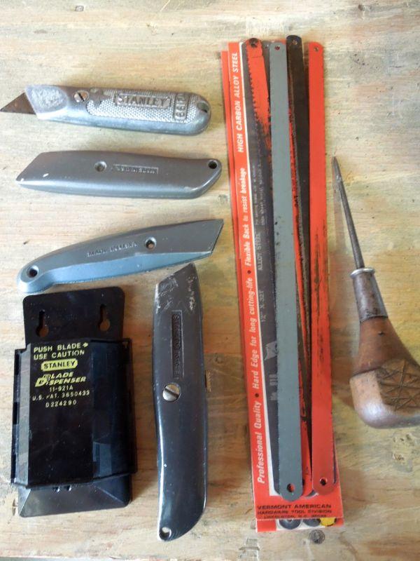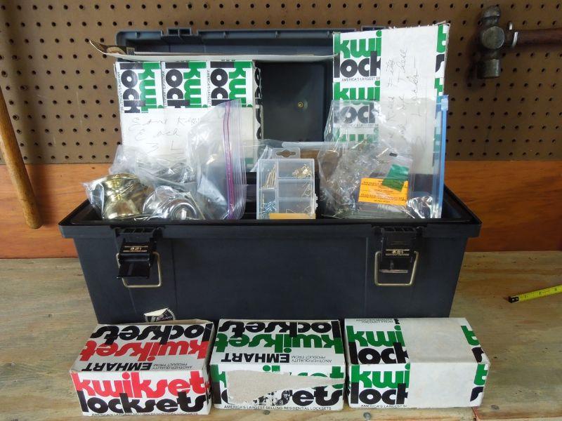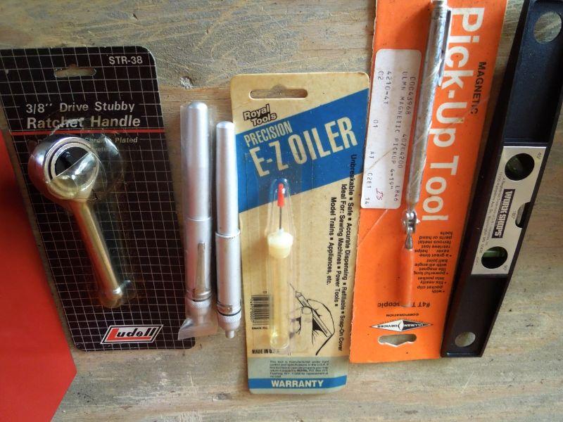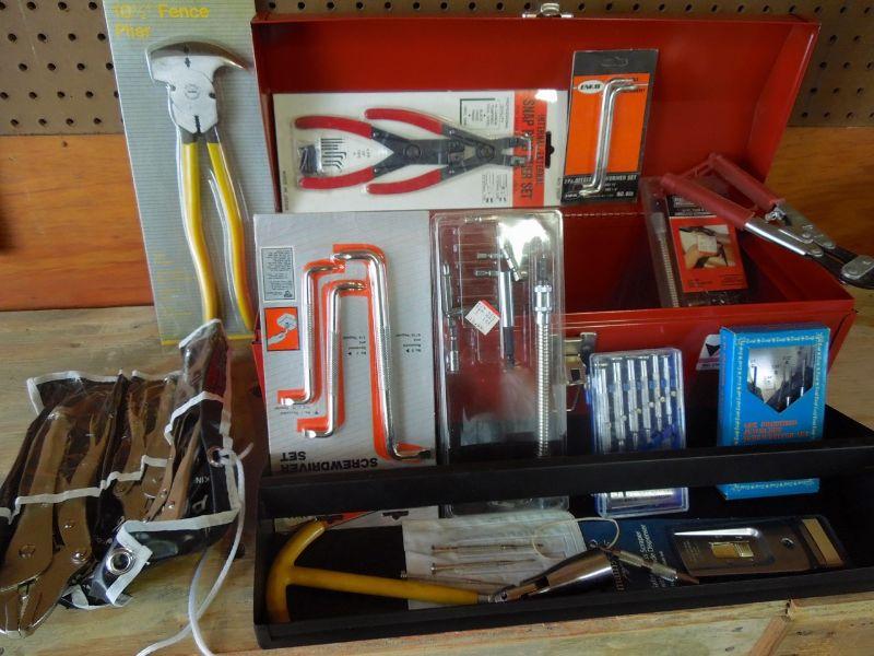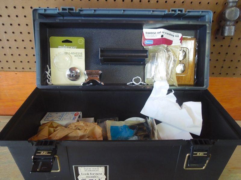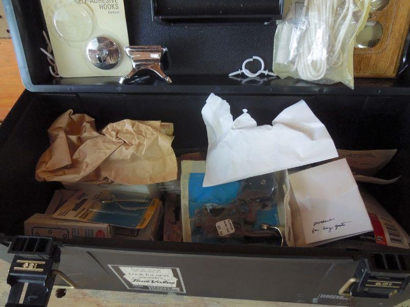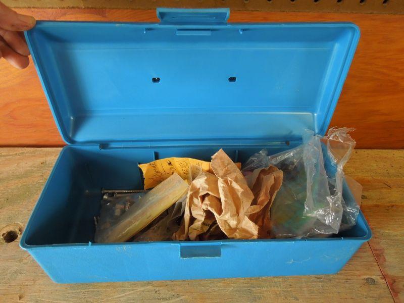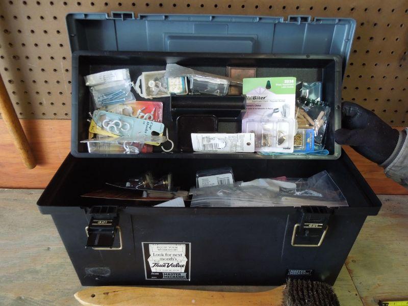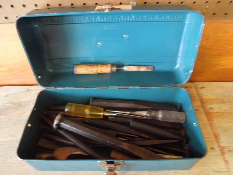 Vermont, Master Mechanic, two other blue metal tool boxes and a smaller plastic box. Largest is Black box 18.5" x 10.5" x 7.5" and smallest bright blue is 11.5" x 4" x 5".