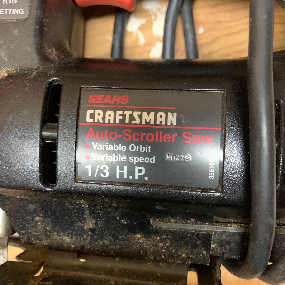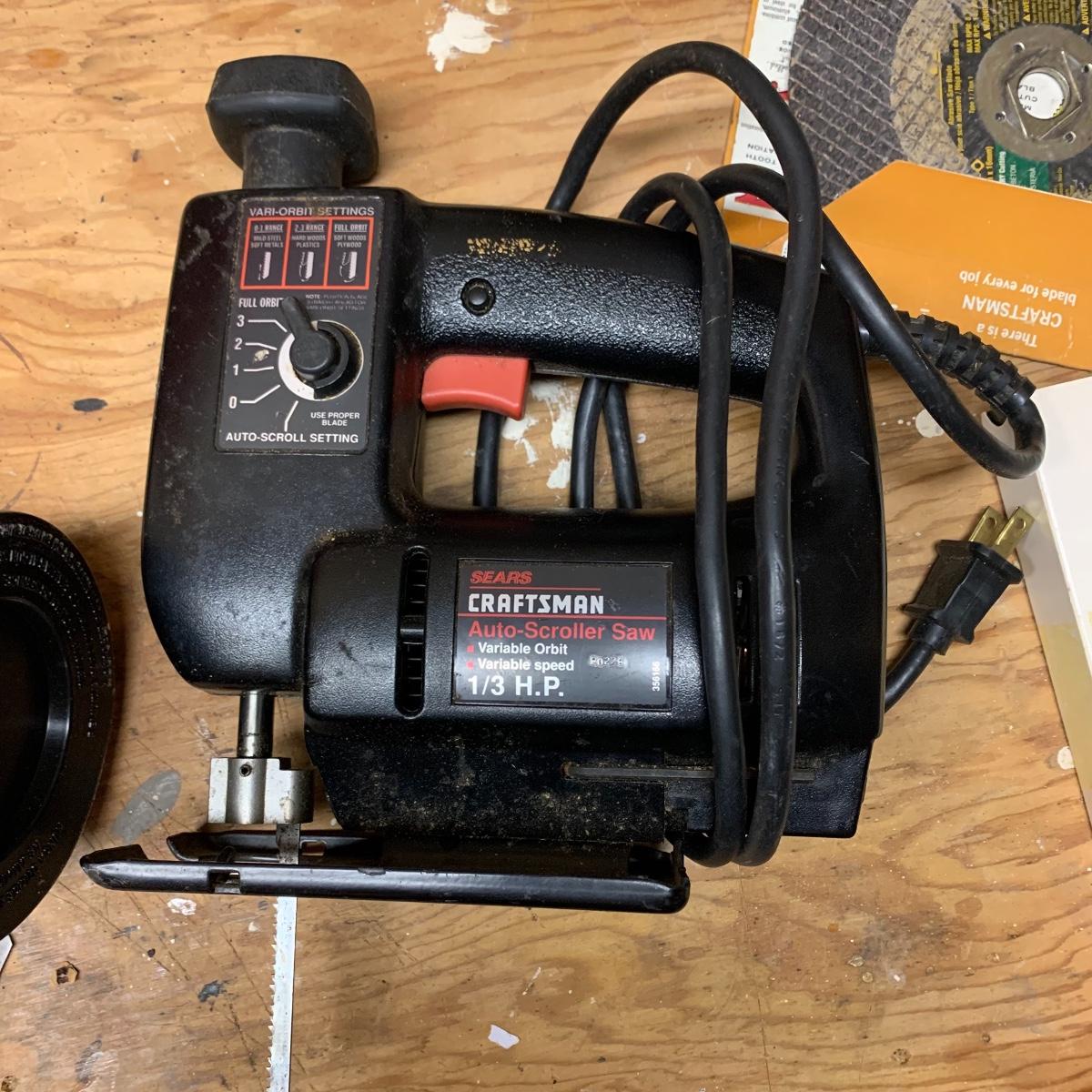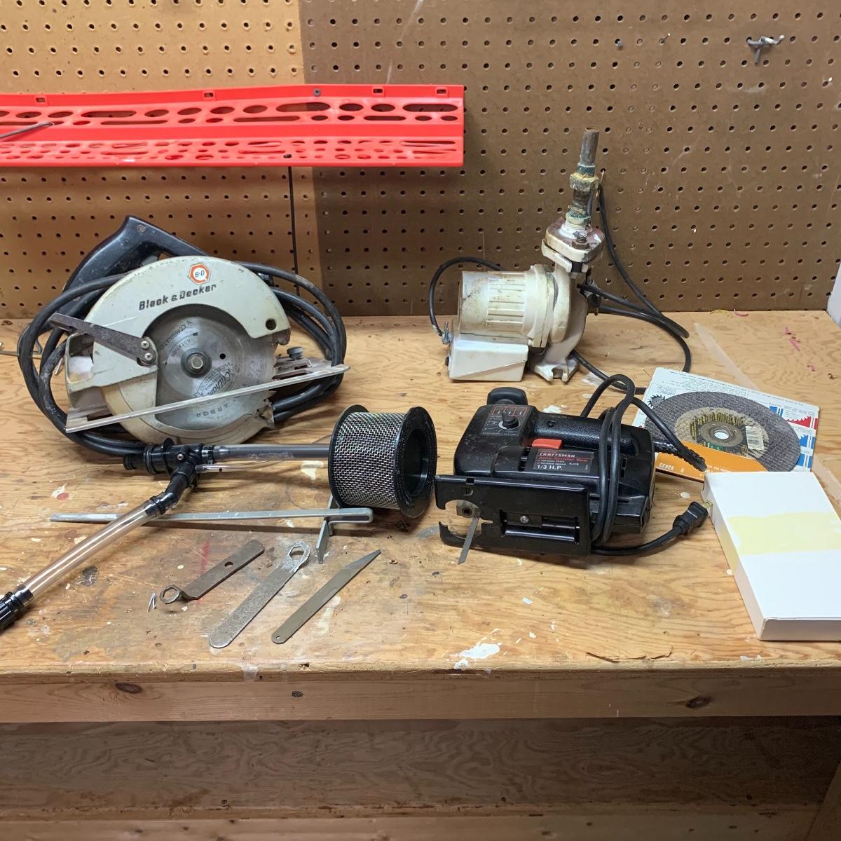 Add these classics to your tool collection. This lot includes a Black and Decker circular saw that features a rip guide and forward control handle. Next is a Craftsmen jig saw that has several scroll settings and is powered by a 1/3 h.p. motor. Also included is a Teel brand pump, a grinding disk, and a vise. Local pickup only.
