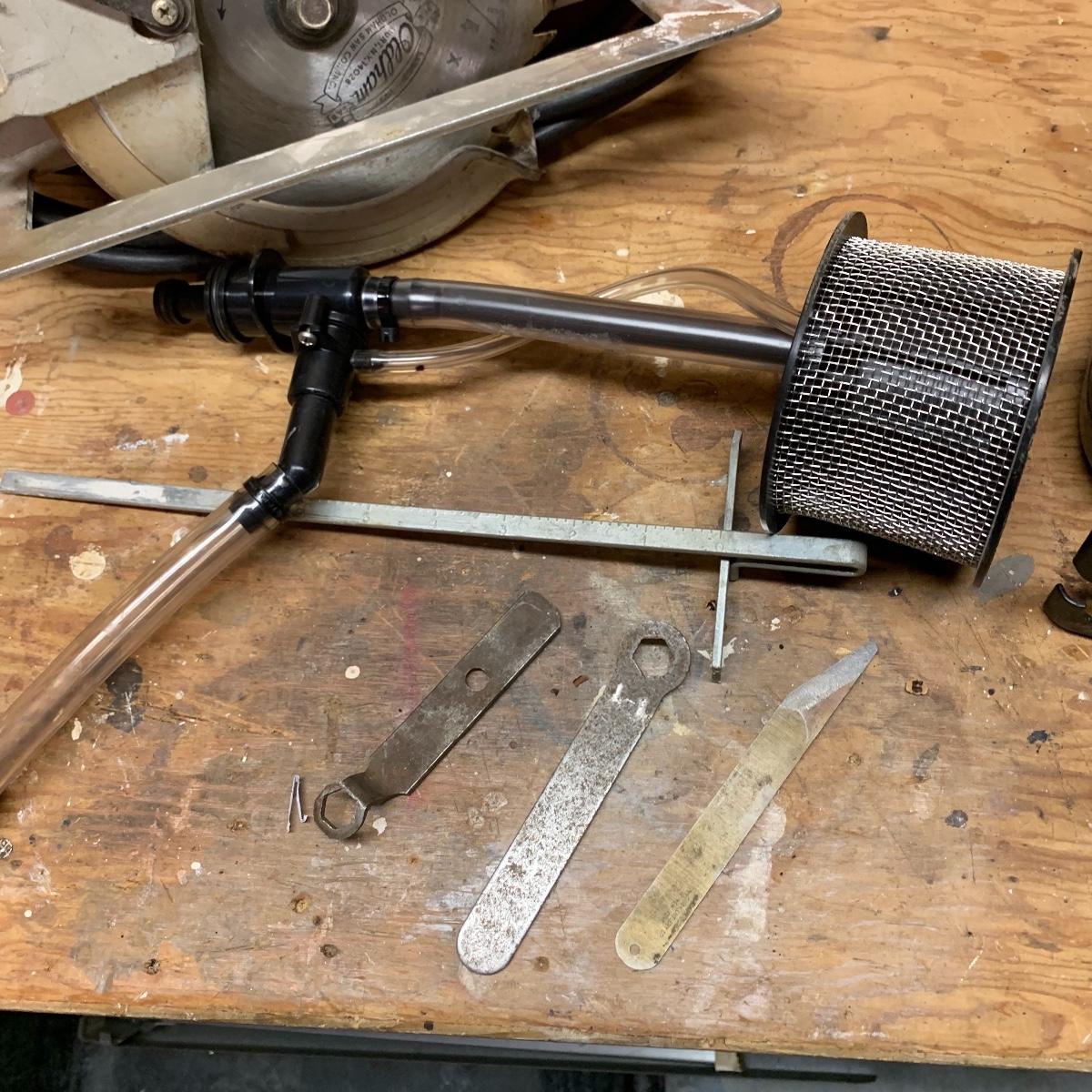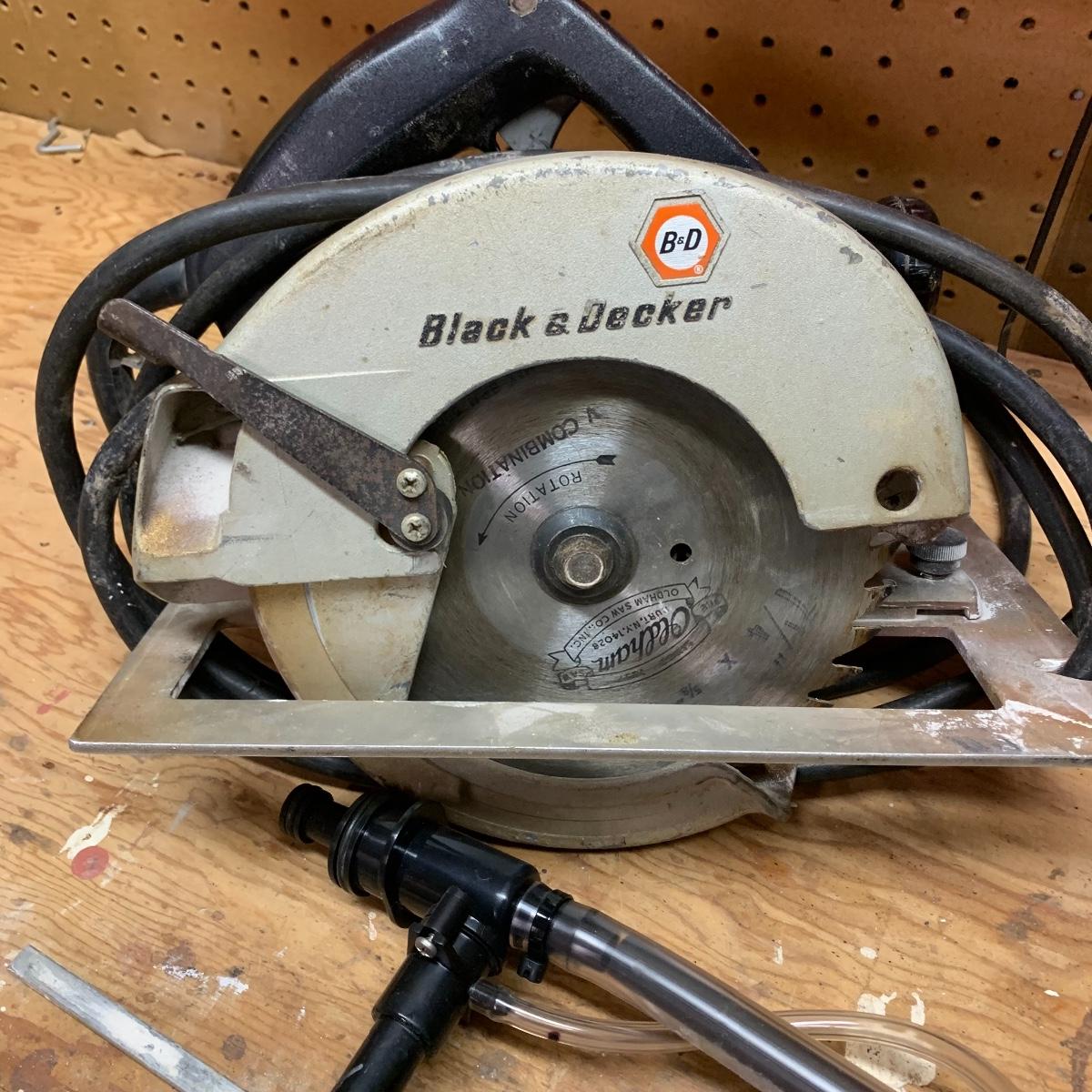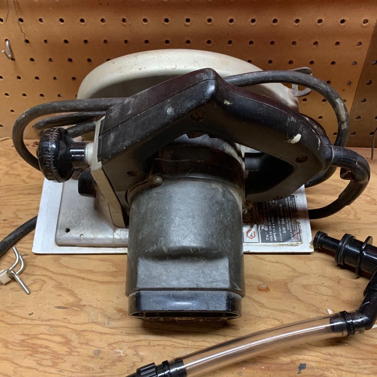 Add these classics to your tool collection. This lot includes a Black and Decker circular saw that features a rip guide and forward control handle. Next is a Craftsmen jig saw that has several scroll settings and is powered by a 1/3 h.p. motor. Also included is a Teel brand pump, a grinding disk, and a vise. Local pickup only.