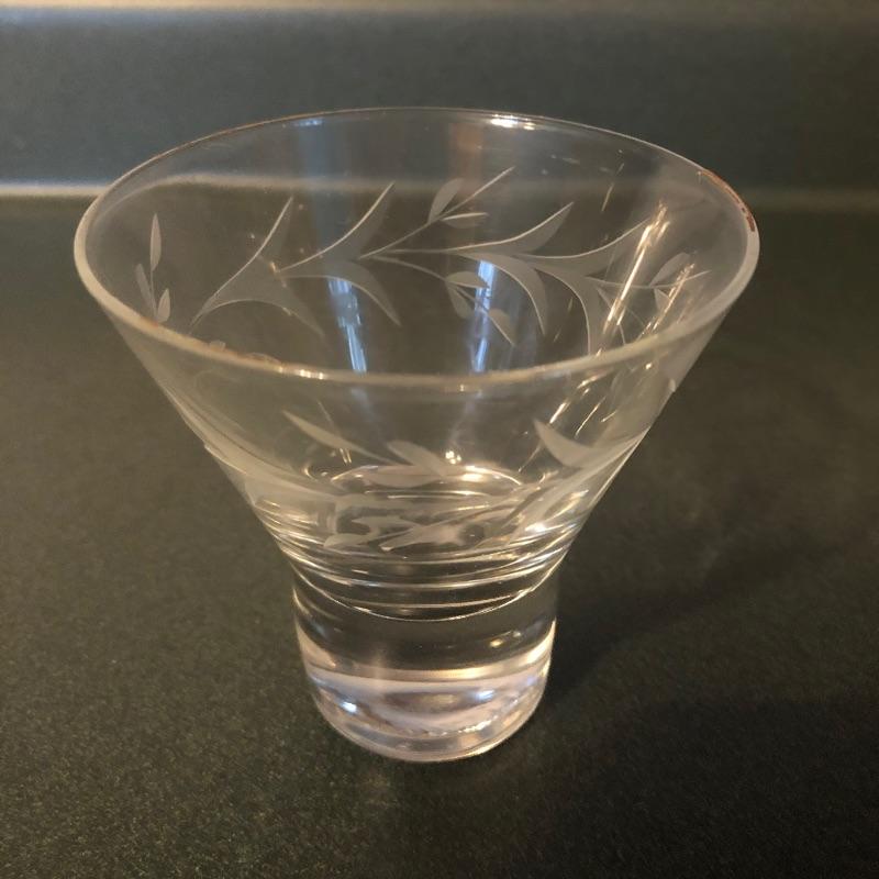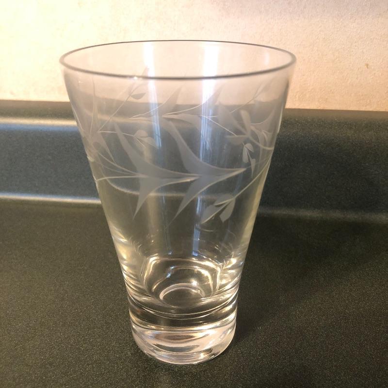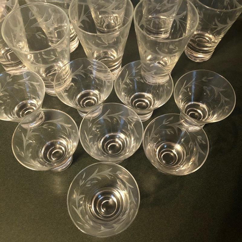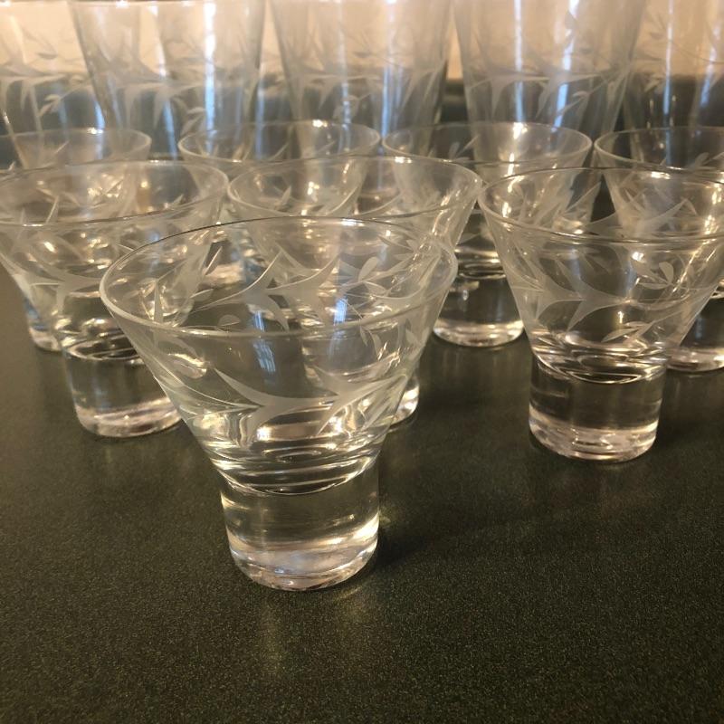 This simple yet elegant set of etched glassware includes 8 larger pieces and 8 matching smaller pieces. Great for family dinners, special occasions, and every day entertaining. The larger piece measures 3.5" D x 5.5" H. Local pickup only.