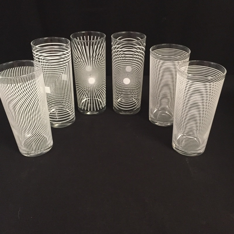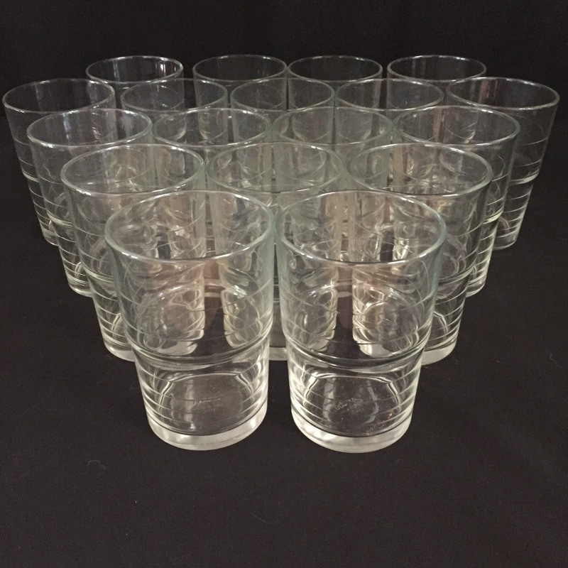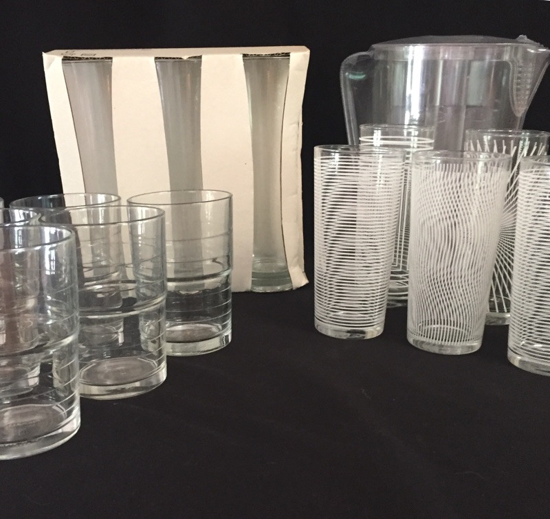 This large lot of glasses offers a nice range of sizes and designs. There are 18 beaker style matching glasses, 6 tall cylindrical shaped glasses still in packaging, 6 white striped beaker glasses and a plastic water jug still in plastic wrapping. See images for more details. No chips or scratches found on any items.