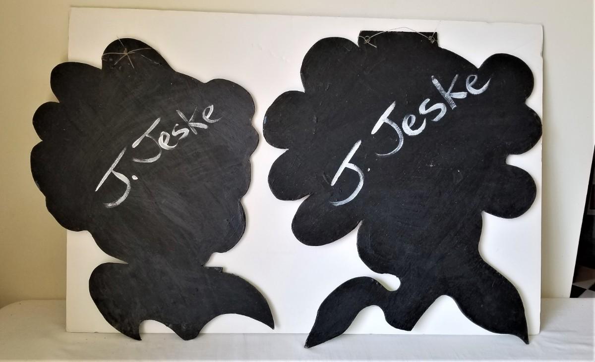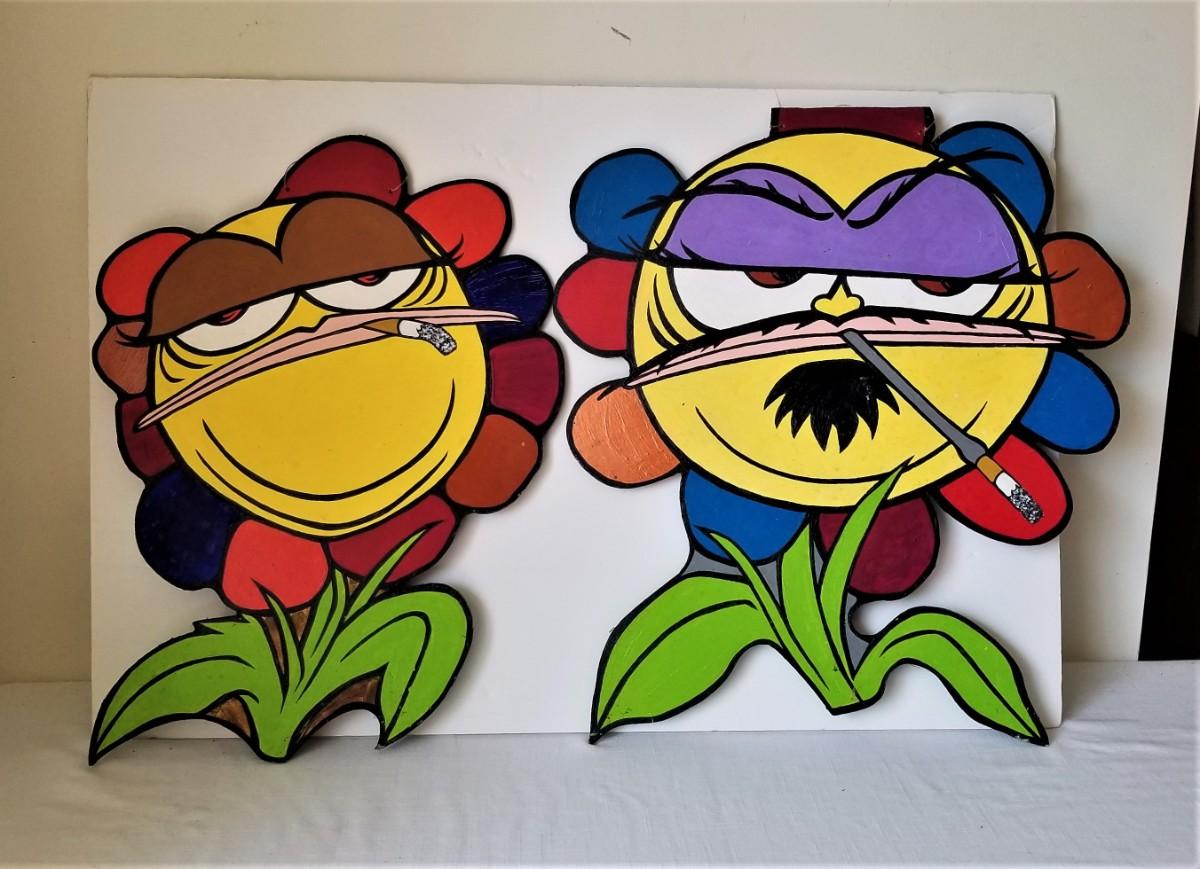 Pair of painted Smoking Fowers by artist J. Jeske - done on thin plywood. The larger is 19.75" tall and 18" across - the smaller is 18.85" tall and 13.5" across. Good condition - signed on reverse.
